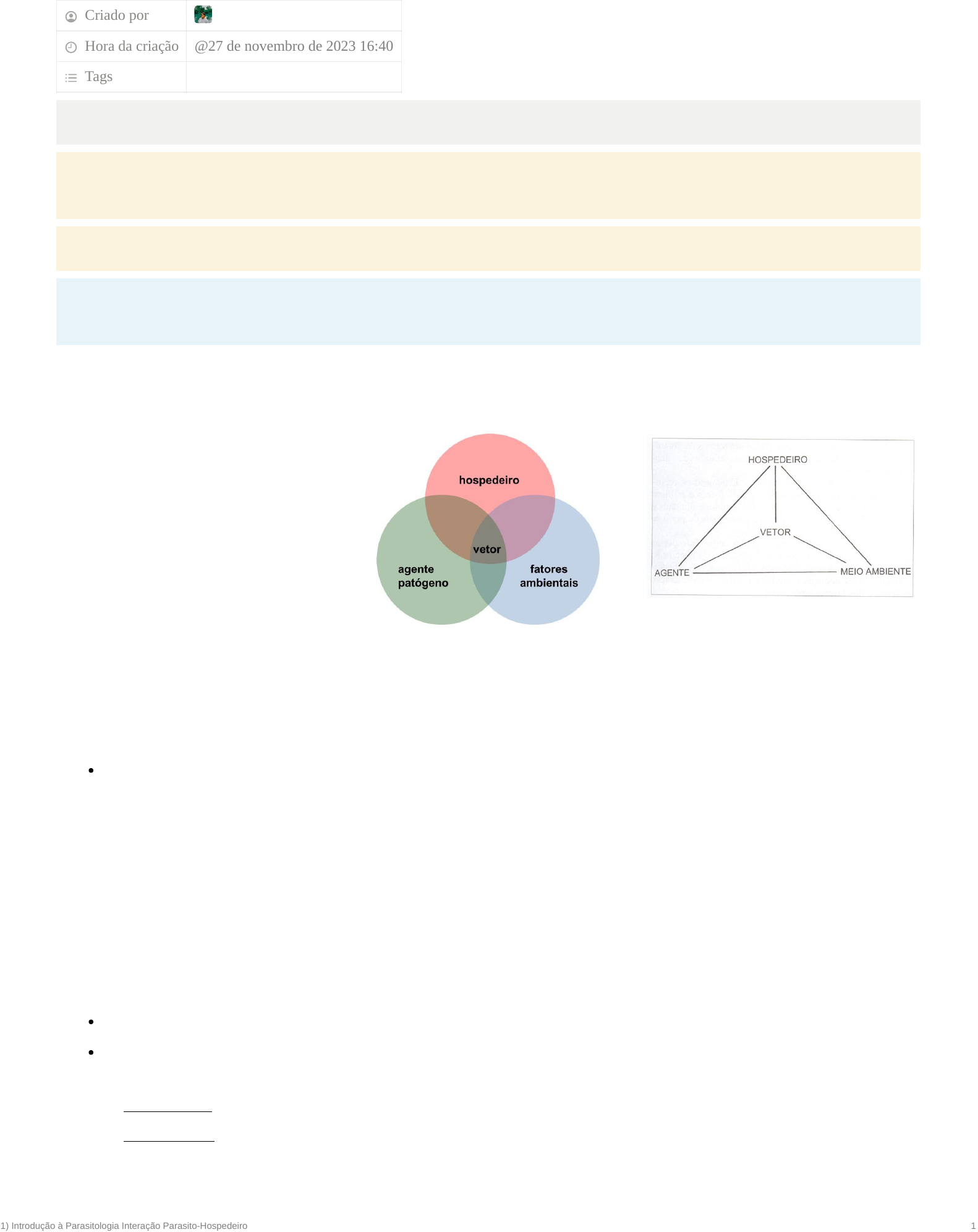 1) Introdução à Parasitologia Interação Parasito-Hospedeiro 1 1) Introdução à Parasitologia Interação Parasito- Hospedeiro Criado por Edu Matos Hora da criação Tags A parasitologia é a ciência que estuda os parasitas (biologia/epidemiologia), bem como métodos diagnósticos e o controle de doenças derivadas do parasitismo. “relação ecológica, desenvolvida entre indivíduos de espécies diferentes, em que se estabelece uma associação íntima e duradoura e certo grau de dependência metabólica entre os parceiros. Geralmente o hospedeiro proporciona ao parasito todos ou quase todos os nutrientes e as condições fisiológicas requeridas por este.” Rey (2003). “associações entre indivíduos de espécies diferentes, onde existe unilateralidade de benefícios, ou seja, o hospedeiro é espoliado pelo parasita pois fornece alimento e abrigo para este” D. Pereira Neves. PARASITISMO - Forma de relação desarmônica que caracteriza a espécie que se instala no corpo de outra , dela retirando matéria para a sua nutrição e causando-lhe, em consequência, danos cuja gravidade pode ser muito variável, desde pequenos distúrbios, até a própria morte do indivíduo parasitado. PARASITO - ser vivo que vive associado a outro (abrigo, alimentação e reprodução); HORPEDEIRO - organismo agredido; CADEIA DE TRASMISSÃO - para que ocorram infecções parasitárias é fundamental que haja elementos básicos expostos e adaptados às condições do meio. Os elementos básicos dela são: o hospedeiro, o agente infeccioso e o meio ambiente. No entanto, em alguns casos, temos a presença de vetores, isto é, insetos que transportam os agentes infecciosos de um hospedeiro parasitado a outro. Integrantes do ciclo parasitário Hospedeiro Definitivo → quando o parasita se reproduz neste de forma sexuada e/ou é encontrado em estágio adulto. Hospedeiro Intermediário → quando o parasita se reproduz neste de forma assexuada e/ou é encontrado em estágio larval. Obs.: quando o protozoário não apresenta ciclo reprodutivo sexuado em nenhum hospedeiro, estes são conhecidos como H. Vertebrado e Invertebrado respectivamente Reservatório → hospedeiro no qual o parasita se multiplica sem ocasionar danos ou quase nenhum dano, possui características específicas que possibilitam o desenvolvimento e multiplicação do parasita. A exemplo das capivaras com o agente da febre maculosa. Vetor → é um transmissor (artrópode, molusco oi mesmo um determinado veículo) que permite a propagação do parasita. Pode ser dividido em v. biológico, quando ocorre multiplicação e/ou desenvolvimento morfológico (tornando-se um hospedeiro), e v. mecânico quando essa situação não ocorre e transmite a mesma forma de parasita Classificação dos parasitas Quanto a localização: Ectoparasitas: vivem externamente ao corpo do hospedeiro. Ex.: pulgas, piolho, carrapatos e sarnas. Endoparasitas: vivem internamente ao corpo do hospedeiro. Ex.: Helmintos e protozoários. Podem ter algumas especificações dependendo de qual órgão ou sistema eles se estabelecem, como: → Hemoparasitas: vivem na corrente sanguínea. (gênero Plasmodium sp - malária); → Enteroparasitas: vivem no intestino (Taenia solium). @27 de novembro de 2023 16:40 1) Introdução à Parasitologia Interação Parasito-Hospedeiro 2 Quanto a sua especificidade: está relacionado a variedade de hospedeiros que o parasita pode se relacionar. Quanto menor essa variedade, mais específico é o parasita e mais fácil de entender e traçar estratégias de controle para a possível doença causada por ele Estenoxeno: Alta especificidade (Ascaris lumbricoides, Wuchereria bancrofti) Oligoxeno: Pouca especificidade Eurixeno: Baixa especificidade (Toxoplasma gondii) Quantidade de hospedeiros no ciclo: Monoxeno: só demandam um hospedeiro para completar seu ciclo biológico (Tricomonas vaginalis, Ascaris lumbricoides) Heteroxeno: demanda mais de um hospedeiro para completar seu ciclo. Ou, exige pelo menos um hospedeiro intermediário. (Gênero Taenia, Tripanossoma cruzi) Quanto ao tipo de parasitismo: Facultativo: espécies que podem ter um ciclo de vida livre (integralmente), e, opcionalmente, podem ser encontrados em estado parasitário. (Moscas Sarcophagidae - se desenvolvem tanto em feridas necrosadas, quanto em matéria orgânica em decomposição) Obrigatório: espécies que não conseguem viver fora do hospedeiro (Sarcoptes scabiei) Acidental: espécies que, acidentalmente, vivem em um hospedeiro que não é de costume (Dipylidium caninum - comumente encontrado em cães pode ser encontrado parasitando crianças) Doença Parasitária É necessária uma dissociação entre parasitismo e doença. O caráter patogênico do parasitismo é incidental e não deve ser incluído na definição deste. Por exemplo, no intestino do homem, por exemplo, vivem algumas amebas perfeitamente adaptadas a esse meio (Entamoeba coli, E. hartmani) e que podem não demonstrar qualquer ação patogênica. As doenças produzidas por parasitos podem dar lugar, depois de fases agudas, a uma infecção duradoura, revelada apenas por exames, onde os mecanismos imunitários, regulando e limitando o crescimento das populações parasitárias, asseguram perfeita tolerância recíproca entre hospedeiro e parasita. Para que ocorra doença, os mecanismos das agressões determinadas pelo parasito devem ultrapassar a capacidade homeostática, e imunológica/de defesa, do hospedeiro. Fp > Fh = doença; Fp < Fh = morte do agressor; Fp = Fh = portador são; → portador-são: não é obrigatória a relação entre a patogenia e a manifestação clínica da doença. Portanto, por estar infectado e assintomático, ele tem maior potencial de transmissão do parasita, já que não recebe o devido tratamento por não apresentar sinais próprios da doença. Fatores inerentes ao parasito Número de exemplares (formas infectantes) Virulência da cepa Capacidade de multiplicação