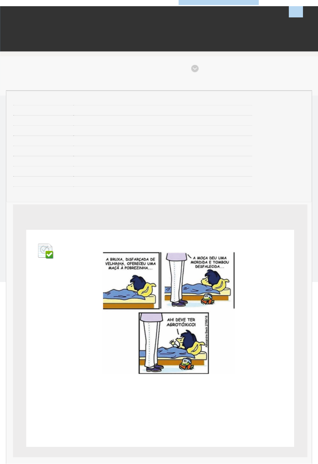 Revisar envio do teste: ATIVIDADE TELEAULA I INTERPRETACAO E PRODUCAO DE TEXTOS D277_34301_R_20241 CONTEÚDO Usuário JULIANA SABINO FURTADO Curso INTERPRETACAO E PRODUCAO DE TEXTOS Teste ATIVIDADE TELEAULA I Iniciado 09/03/24 19:14 Enviado 09/03/24 19:16 Status Completada Resultado da tentativa 0 em 0 pontos Tempo decorrido 2 minutos Autoteste O aluno responde e o resultado do aluno não é visível ao professor. Resultados exibidos Respostas enviadas, Perguntas respondidas incorretamente Pergunta 1 Resposta Selecionada: b. Fonte: BECK, A. Armandinho. São Paulo: Matrix, 2017, p. 27. Considerando-se a situação de comunicação comum do gênero contos de fadas e o contexto especí�co da contação de histórias infantis, o termo “agrotóxico” tem função predominantemente no contexto de: Agricultura. UNIP BIBLIOTECAS MURAL DO ALUNOCONTEÚDOS ACADÊMICOS 0 em 0 pontos 03/05/2024, 05:08 Revisar envio do teste: ATIVIDADE TELEAULA I – ... https://ava.ead.unip.br/webapps/assessment/review/review.jsp?attempt_id=_102284605_1&course_id=_331304_1&content_id=_3808388_1&out… 1/3 http://company.blackboard.com/ https://ava.ead.unip.br/webapps/blackboard/execute/courseMain?course_id=_331304_1 https://ava.ead.unip.br/webapps/blackboard/content/listContent.jsp?course_id=_331304_1&content_id=_3799310_1&mode=reset https://ava.ead.unip.br/webapps/portal/execute/tabs/tabAction?tab_tab_group_id=_49_1 https://ava.ead.unip.br/webapps/portal/execute/tabs/tabAction?tab_tab_group_id=_27_1 https://ava.ead.unip.br/webapps/portal/execute/tabs/tabAction?tab_tab_group_id=_47_1 https://ava.ead.unip.br/webapps/portal/execute/tabs/tabAction?tab_tab_group_id=_25_1 https://ava.ead.unip.br/webapps/login/?action=logout Pergunta 2 Resposta Selecionada: a. Fonte: SARMENTO, L. L. O�cina de redação. 3. ed. São Paulo: Moderna, 2006, p. 112. Na tirinha, quando Helga fala “E você não levanta um dedo”, é correto a�rmar que a resposta do Hagar é tomada em seu sentido: Conotativo. Pergunta 3 Resposta Selecionada: c. Fonte: SARMENTO, L. L. O�cina de redação. 3. ed. São Paulo: Moderna, 2006, p. 416. A noção de gêneros textuais é apoiada em práticas sociais e em saberes socioculturais, porém podem sofrer variações, na medida em que um texto representativo de um gênero pode incorporar outras características. Desse modo, considerando o anúncio, indique a exempli�cação: Intertextualidade. 0 em 0 pontos 0 em 0 pontos 03/05/2024, 05:08 Revisar envio do teste: ATIVIDADE TELEAULA I – ... https://ava.ead.unip.br/webapps/assessment/review/review.jsp?attempt_id=_102284605_1&course_id=_331304_1&content_id=_3808388_1&out… 2/3 Sexta-feira, 3 de Maio de 2024 05h08min37s GMT-03:00 Pergunta 4 Resposta Selecionada: b. Para o signi�cado de suas comunicações, as pessoas recorrem a estratégias textuais que organizam as informações para que o receptor entenda, mas para isso é necessário conhecer o código em que a mensagem está sendo veiculada. Desse modo, considerando a �gura, identi�que uma ordem das etapas de leitura para entender a mensagem a seguir: Fonte: Grupo Unip – Objetivo. Compreensão e interpretação. ← OK 0 em 0 pontos 03/05/2024, 05:08 Revisar envio do teste: ATIVIDADE TELEAULA I – ... https://ava.ead.unip.br/webapps/assessment/review/review.jsp?attempt_id=_102284605_1&course_id=_331304_1&content_id=_3808388_1&out… 3/3