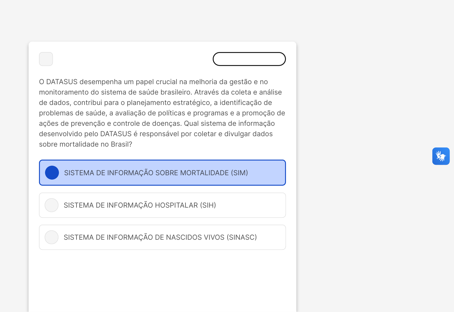 A B C 1 Marcar para revisão O DATASUS desempenha um papel crucial na melhoria da gestão e no monitoramento do sistema de saúde brasileiro. Através da coleta e análise de dados, contribui para o planejamento estratégico, a identificação de problemas de saúde, a avaliação de políticas e programas e a promoção de ações de prevenção e controle de doenças. Qual sistema de informação desenvolvido pelo DATASUS é responsável por coletar e divulgar dados sobre mortalidade no Brasil? SISTEMA DE INFORMAÇÃO SOBRE MORTALIDADE �SIM� SISTEMA DE INFORMAÇÃO HOSPITALAR �SIH� SISTEMA DE INFORMAÇÃO DE NASCIDOS VIVOS �SINASC� D E A B C SISTEMA DE INFORMAÇÃO DE MEDICAMENTOS �VIGIMED� SISTEMA DE NOTIFICAÇÃO DE AGRAVOS DE NOTIFICAÇÃO (SINAN� 2 Marcar para revisão Como é conhecido o monitoramento, análise e investigação dos eventos adversos e queixas técnicas de produtos sob vigilância sanitária após sua liberação para o comércio? VIGIPÓS. VIGIMED. SINAN. D E A B C Farmacovigilância Farmacoepidemiologia 3 Marcar para revisão Os estudos observacionais do tipo relato de casos ou série de casos são uma categoria importante de estudos descritivos em epidemiologia. Os estudos observacionais do tipo relato de casos ou série de casos são particularmente úteis para: Realizar análises simultâneas entre exposição e doença. Avaliar a eficácia de intervenções de saúde pública. Descrever detalhadamente eventos clínicos raros. D E A B C Identificar associações entre exposição e doença. Medir a prevalência de uma doença em uma população. 4 Marcar para revisão Na frase: "Estuda todos os determinantes em saúde e fatores que afetam as diferentes populações", temos a definição de: Epidemiologia. Indicadores em saúde. Incidência. D E A B C Indicadores de mortalidade. Estudos de prevalência. 5 Marcar para revisão Os medicamentos que temos disponíveis para população precisam passar pela ação da farmacovigilância. De acordo com esse contexto qual é o objetivo principal da Farmacovigilância? Detectar e comunicar problemas relacionados ao uso de medicamentos. Treinar profissionais de saúde em Farmacovigilância. Promover a venda de medicamentos mais eficazes. D E A B C Avaliar a eficácia dos medicamentos. Melhorar a saúde pública em relação ao uso de medicamentos. 6 Marcar para revisão A segurança dos medicamentos é uma preocupação global, pois erros de medicação e reações adversas a medicamentos podem causar danos evitáveis aos pacientes e impactar negativamente sua saúde. Assinale um dos problemas fundamentais abordados pelo Desafio Global para a Segurança do Paciente - segurança de medicamentos? A falta de informação sobre medicamentos nos rótulos e embalagens. A falta de treinamento adequado dos profissionais de saúde. A complexidade dos procedimentos cirúrgicos. SM1 Farmacoepidemiologia e Farmacovigilância D E A B A falta de disponibilidade de medicamentos no mercado. A ausência de políticas governamentais para regulamentar o uso de medicamentos. 7 Marcar para revisão O método de uniformização dos dados é uma abordagem fundamental para garantir a consistência e a comparabilidade das informações em diversas áreas, incluindo a área da saúde. Na pesquisa clínica, é essencial que os dados coletados sejam padronizados para facilitar a análise e a interpretação dos resultados Marque a alternativa que apresenta a definição sobre o Método de Uniformização dos Dados na pesquisa científica. Método estatístico utilizado para coletar dados brutos de forma não padronizada. Abordagem que visa padronizar a coleta e o registro dos dados para garantir sua consistência e comparabilidade 00 hora : 31 min : 09 seg Ocultar Questão 8 de 10 Respondidas �10� Em branco �0� Finalizar prova 1 2 3 4 5 6 7 8 9 10 C D E A B Processo de análise dos dados coletados para identificar inconsistências e erros. Prática de documentar e armazenar os dados de pesquisa de forma desorganizada e não sistemática. Técnica que permite a manipulação dos dados para atender aos objetivos do pesquisador. 8 Marcar para revisão O custo-efetividade médio (razão) é uma medida utilizada na análise de custo-efetividade. Qual é a definição de custo-efetividade médio (razão) em relação a uma opção de tratamento? O custo total de uma opção de tratamento em relação à sua eficácia. A relação entre o custo e o benefício para a saúde de uma opção de tratamento. C D E A B A proporção entre o custo e a eficácia de uma opção de tratamento. A medida da eficácia de uma opção de tratamento em relação ao seu custo. A diferença entre o custo e o benefício para a saúde de uma opção de tratamento. 9 Marcar para revisão O uso racional de medicamentos traz diversos benefícios, como a melhoria da qualidade de vida dos pacientes, a redução de eventos adversos, a minimização de desperdícios e custos desnecessários e a otimização dos recursos disponíveis no sistema de saúde. Qual é a finalidade de monitorar regularmente a prescrição, a dispensação e o uso de medicamentos em relação ao uso irracional? Medir a satisfação dos pacientes com os medicamentos. Identificar os medicamentos mais caros. C D E A B C Avaliar a eficácia dos medicamentos. Determinar a quantidade de medicamentos disponíveis. Detectar problemas específicos de uso irracional. 10 Marcar para revisão Em uma área com 10 mil habitantes, foram notificados, em um mês, cerca de 68 novos casos de HIV. De acordo com esses dados, é correto afirmar: O coeficiente de prevalência foi de 68 casos para cada 10 mil habitantes. A mortalidade foi de 68 casos para cada 100 mil habitantes. A letalidade dos novos casos de HIV foi de 6,8%. D E O coeficiente de letalidade foi de 6,8 casos para cada 100 mil habitantes. O coeficiente de incidência foi de 680 casos para cada 100 mil habitantes.