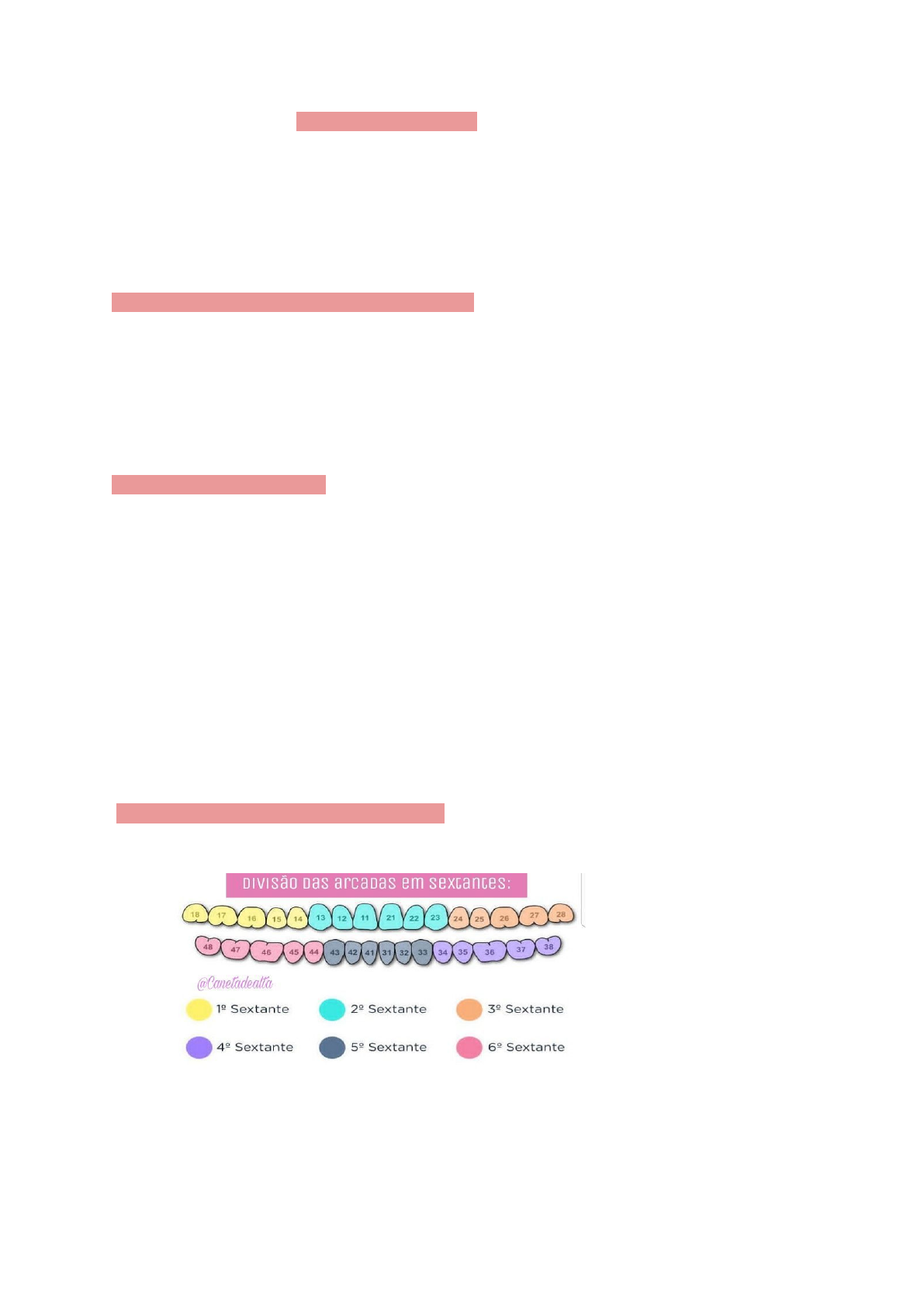 COLA PERIODONTAL Alunas: Priscila Souza Barreto e Nathalia Maria Lemos Mota Professor orientador da prática: Eleonora de Oliveira Bandolin Martins Turma: E07 ANAMNESE, EXAME INTRA E EXTRA ORAL: 1. Preencher histórico médico e odontológico - tabagismo e diabetes são pensados muito em periodontia, já que são dois fatores de risco para a doença periodontal. 2. Exame extra-oral e linfonodos 3. Exame intra-oral: avaliação de mucosa, língua e palato 4. Avaliação específica do tratamento periodontal RISCO CIRÚRGICO (ASA): ➢ ASA I: Paciente saudável ➢ ASA II: Paciente portador de doença sistêmica moderada (geralmente gravidez se enquadra aqui). Exemplo: HAS compensada ou DM compensada. ➢ ASA III: Paciente portador de doença sistêmica severa, que limita suas atividades. Exemplo: HAS descompensada, DM descompensada, insuficiência cardíaca compensada ou infarto agudo no miocárdio prévio. ➢ ASA IV: Paciente com doença sistêmica grave ou incapacitante. Exemplo: DPOC (doença pulmonar obstrutiva crônica) sintomática, insuficiência cardíaca descompensada. ➢ ASA V: Paciente sem expectativa de vida por mais de 4 dias. Exemplo: falência de órgãos ou sepse. ➢ ASA VI: Paciente doador de órgãos, morte cerebral. PSR (Registro periodontal simplificado): ➢ Realizado com a sonda OMS e dividido em 6 sextantes ➢ Código 0 : Saúdavel ➢ Código 1 : Apenas sangramento (tarja preta totalmente visível); ➢ Código 2 : Pode haver sangramento. Presença de cálculo ou fatores retentivos de placa (tarja totalmente visível); ➢ Código 3 : Pode ou não haver sangramento, iatrogenia e cálculo dentário. A sonda chega a 3,5 mm a 5,5 mm (tarja parcialmente visível); ➢ Código 4 : Faixa acima 5,5 mm. (faixa fica totalmente invisível); ➢ * : Mobilidade, lesão de furca, recessão gengival, problema muco-gengival (hiperplasia); ➢ X : Ausência de todos os dentes no sextante. Quando há somente 1 dente no sextante, deverá ser deslocado para o sextante seguinte ou anterior (nunca desce ou sobe). LESÃO DE FURCA: ➢ Realizada com a sonda Nabers ➢ Grau I: A sonda detecta a entrada da furca, mas não penetra (sonda penetra até 3mm); ➢ Grau II: A sonda penetra, mas não ultrapassa (sonda penetra mais de 3mm); ➢ Grau III: A sonda penetra e atravessa para o outro lado; PERIOGRAMA: ➢ O objetivo é avaliar a quantidade de tecido perdido na doença periodontal e também identificar a extensão apical da lesão inflamatória. ➢ É realizado com a sonda PNC-15 (5 mm a cada faixa grossa) ➢ Avalia a profundidade de sondagem da bolsa periodontal e nível clínico de inserção ➢ O periograma só será realizado na boca toda do paciente caso o PSR dele acometa 1 código 4 ou 2 códigos 3, caso tenha somente 1 código 3 só será realizado o periograma do sextante. Para ser utilizado os seguintes dados devem ser inseridos: ➢ Mobilidade dentária ➢ Envolvimento de furca ➢ Margem gengival (mm) ➢ Profundidade de sondagem (mm) ➢ Placa visível ➢ Sangramento à sondagem ➢ As sondas periodontais são: Carolina do norte, Williams, OMS e Nabers Passo a passo de como fazer e preencher o periograma: ÍNDICE DE SANGRAMENTO: ➢ Relevância prognóstica: ➢ Sítios com índice de sangramento menor que 10% - menor risco de perda de recorrência de doença ➢ Sítios com índice de sangramento acima de 25% - risco de recorrência da doença aumentada - a terapia será feita em intervalos menores ➢ Sítios com índice de sangramento repetitivamente positivos com 30% - risco de perda de inserção clínica futura ➢ Para calcular o índice de sangramento: TOTAL DE FACES SANGRANTES X 100= NÚMERO TOTAL DE FACES ÍNDICE DE BIOFILME: ➢ Avalia a quantidade de biofilme, seu controle e qualidade de higiene do paciente. ➢ Faz o uso do evidenciador de placa, para corar as faces que tem acúmulo de placa bacteriana. Após o uso dele, faz a conta abaixo: TOTAL DE FACES COM PLACA X 100 = NÚMERO TOTAL DE FACES x 4 ➢ Resultado até 25% é satisfatório. De 25% a 40% é irregular. Acima de 40% é insatisfatório. ➢ Índice é feito no início do tratamento e no final dele. RADIOLOGIA EM PERIODONTIA: ➢ A radiografia periapical é a mais utilizada na periodontia; ➢ Deve-se analisar se possui restaurações inadequadas (iatrogenia); ➢ Observar se existe perda óssea alveolar e o ligamento periodontal; ➢ Analisar se possui cálculo (só será possível ver na radiografia caso possua muito cálculo). ➢ exemplos: Paciente com perda óssea, lesão de furca; Radiografia com cálculo; Perda óssea vertical em várias áreas (setas maiores), cratera interdental (seta menor reta) e lesão de cárie radicular que pode se desenvolver pela exposição da raiz após perda óssea (seta curva). RESUMO DA NOVA CLASSIFICAÇÃO (2017): Possui três grupos: 1. Saúde periodontal, condições e doenças gengivais 2. Periodontite 3. Outras doenças que afetam o periodonto Grupo 1: Saúde periodontal e saúde gengival: ➢ Saúde clínica em periodonto saudável: ➢ Sangramento à sondagem <10%, ausência de edema, eritema e sintomas do paciente, sem perda de inserção, sem perda óssea radiográfica e sondagem de até 3 mm. Gengivite associada somente a biofilme: ➢ Gengivite em periodonto íntegro: PS de até 3mm, 10% ou mais do sítios com sangramento, não tem perda de inserção e perda óssea ➢ Gengivite em periodonto reduzido : Mesma coisa que o anterior, a diferença é que possui perda de inserção e perda óssea ➢ Gengivite em periodonto reduzido tratado periodontalmente : Histórico de tratamento de periodontite, perda de inserção, sítios com bolsas de até 3mm, 10% ou + dos sítios com sangramento e perda óssea radiográfica Gengivite mediada a fatores locais ou sistêmicos : ➢ Fatores sistêmicos: Tabagismo, hormônios, hiperglicemia e condições histopatológicas ➢ Fatores locais : retenção de biofilme por iatrogenias (aparelho ortodôntico, xeros