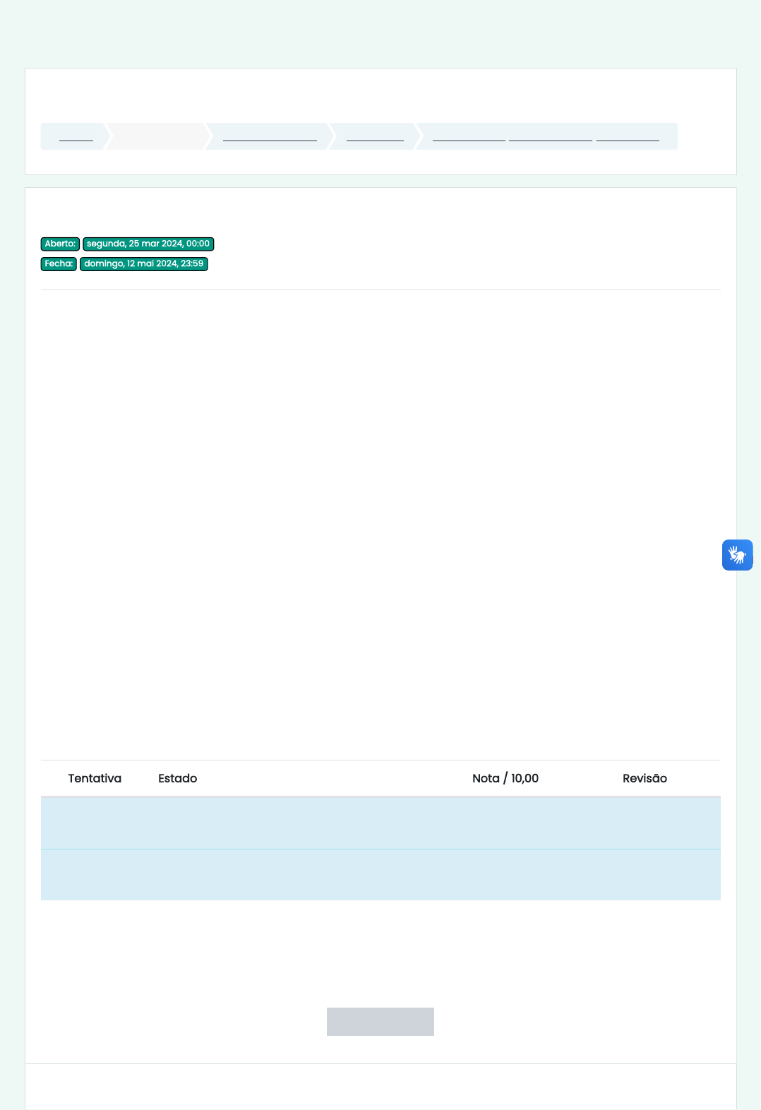V01-Ambientação em EaD Painel Meus cursos V01-AEAD-2024.1 Unidade II AV2 - Avaliação Virtual 2 - Questionário AV2 - Avaliação Virtual 2 - Questionário Aberto: segunda, 25 mar 2024, 00:00 Fecha: domingo, 12 mai 2024, 23:59 Prezado(a)estudante, Após realizar suas leituras e desenvolver seus estudos sobre a fundamentação legal da Educação a Distância (EaD) no Brasil, seu histórico e conceitos, responda ao questionário que possui 10 questões. Você terá 1 hora e 30 minutos para responder seu questionário e duas tentativas, prevalecendo a nota mais alta. O objetivo dessa avaliação é averiguar seus conhecimentos adquiridos durante a Unidade II, desenvolvendo autonomia, disciplina, controle de tempo, reflexão e compreensão sobre os temas estudados. Cada questão valerá 1 ponto, totalizando 10 pontos. Só inicie a tentativa de resposta quando estiver com tempo para concluir o questionário, pois a contagem do tempo de resposta começa a partir do momento em que você iniciar a tentativa. Mesmo que a conexão seja fechada ou encerrada, o tempo continuará contando. Quando a contagem terminar, o questionário será submetido automaticamente com as respostas que foram preenchidas até o término do tempo. Desejamos-lhe sucesso! Tentativas permitidas: 2 Duração máxima: 1 hora 30 minutos Método de avaliação: Nota mais alta Resumo das suas tentativas anteriores Tentativa Estado Nota / 10,00 Revisão 1 Finalizada Enviada(s) terça, 7 mai 2024, 13:48 10,00 Não permitido 2 Finalizada Enviada(s) terça, 7 mai 2024, 13:58 10,00 A sua nota final neste questionário é 10,00/10,00. Não são permitidas outras tentativas Voltar ao curso Atividade anterior https://moodle.ifbaiano.edu.br/moodle/my/ https://moodle.ifbaiano.edu.br/moodle/course/view.php?id=11038 https://moodle.ifbaiano.edu.br/moodle/course/view.php?id=11038§ion=3 https://moodle.ifbaiano.edu.br/moodle/mod/quiz/view.php?id=355922 ◄ Saiba mais - Textos Complementares Seguir para... Próxima atividade AP1 - Avaliação Presencial 1 - Tarefa - Mini Seminário e resumo do tema da equipe ► Manter contato Instituto Federal Baiano Rua do Rouxinol, nº 115, Imbuí, Salvador/BA, CEP: 41720-052 https://ifbaiano.edu.br Baixar o aplicativo móvel. https://moodle.ifbaiano.edu.br/moodle/mod/folder/view.php?id=355921&forceview=1 https://moodle.ifbaiano.edu.br/moodle/mod/assign/view.php?id=357994&forceview=1 https://ifbaiano.edu.br/ https://www.youtube.com/channel/UCtLJy9TA3AnS7NmOFnW-RXA https://www.instagram.com/ifbaiano/ https://download.moodle.org/mobile?version=2021051702.05&lang=pt_br&iosappid=633359593&androidappid=com.moodle.moodlemobile