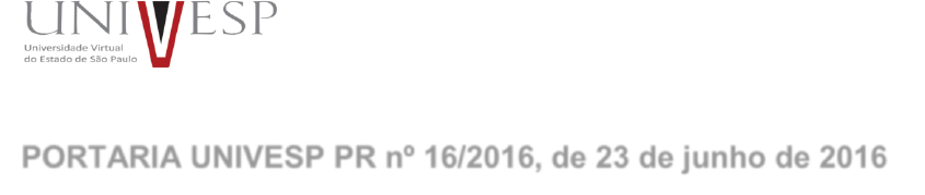 PORTARIA UNIVESP PR nº 16/2016, de 23 de junho de 2016 Convoca os candidatos devidamente inscritos no Processo Seletivo Vestibular, do 2º semestre de 2016, para ingresso nos cursos de graduação em Engenharia da Univesp, dentro do sistema Universidade Aberta do Brasil – UAB, bem como do Centro Estadual de Educação Tecnológica Paula Souza e altera dispositivos do Artigo 18 da Portaria Univesp PR nº 12/2016. O Presidente da Fundação Universidade Virtual do Estado de São Paulo (UNIVESP), no uso de suas atribuições legais e em atendimento ao disposto na Portaria Univesp PR nº 12/2006, de 19 de maio de 2016, expede a presente Portaria, que CONVOCA para realização das provas os candidatos devidamente inscritos no Processo Seletivo Vestibular do 2º semestre de 2016, e DIVULGA os locais de realização de provas. Artigo 1º – As provas serão realizadas no estado de São Paulo, na data de 26 de junho de 2016, às 9h00 (nove horas), e terão a duração de 4 (quatro) horas, observado o horário oficial de Brasília/DF. § 1º - O portão da escola será aberto às 8h e fechado às 9h, impreterivelmente. Após o fechamento do portão, não será permitida a entrada de nenhum candidato. Por esse motivo, recomenda-se a chegada com, pelo menos, 60 (sessenta) minutos de antecedência, para evitar possíveis imprevistos. § 2º - Após o início das provas, o candidato deverá permanecer, no mínimo, 2 (duas) horas dentro da sala de provas, podendo levar o caderno de questões faltando 60 (sessenta) minutos para o término do horário estabelecido para o fim da realização das provas. Artigo 2º – A partir do dia 23 de junho de 2016, o candidato deverá consultar no site www.nossorumo.org.br a Portaria de Convocação para realização das provas, acessando a área do candidato, mediante CPF e senha, para visualização de seu boletim informativo de local de realização de provas. § 1º - A distribuição dos alunos nas salas, em cada escola, far-se-á por ordem alfabética e o intervalo de cada escola consta do Anexo I desta Portaria. § 2º - O candidato será convocado para realizar as Provas na região de sua 1ª opção de Polo, informada no ato da inscrição. § 3º - A confirmação do local onde realizará as provas será de inteira responsabilidade do candidato. § 4º - O candidato deverá, obrigatoriamente, realizar as provas no local determinado. Artigo 3º – Para realização das provas, ficam estabelecidas as regras abaixo, em conformidade com a Portaria nº 12 de 19 de maio de 2016. § 1º - Não será permitida, em hipótese alguma, a realização das provas em outra data, horário ou fora do local designado, sendo de responsabilidade do candidato o acompanhamento e consulta para verificar o seu local de prova. § 2º - O candidato deverá comparecer ao local designado para a prova com antecedência mínima de 60 (sessenta) minutos, munido de: I - Comprovante de inscrição; II - Original de um dos documentos de identidade a seguir: Cédula Oficial de Identidade; Carteira e/ou Cédula de Identidade expedida pela Secretaria de Segurança, pelas Forças Armadas, pela Polícia Militar ou pelo Ministério das Relações Exteriores; Carteira de Trabalho e Previdência Social; Certificado de Reservista com foto; Passaporte; Cédulas de Identidade fornecidas por Órgãos ou Conselhos de Classe, que, por Lei Federal, valem como documento de identidade (CRQ, OAB, CRC, CRA, CRF etc.) e Carteira Nacional de Habilitação - CNH (com fotografia na forma da Lei nº 9.503/97). III - Caneta esferográfica de tinta preta ou azul de corpo transparente. § 3º - Os documentos apresentados deverão estar em perfeitas condições, de forma a permitir a identificação do candidato com clareza, sendo que o comprovante de inscrição, o comprovante de pagamento e o comprovante de isenção não terão validade como documento de identidade. § 4º - Caso o candidato esteja impossibilitado de apresentar, no dia de realização das provas, documento de identidade original, por motivo de perda, roubo ou furto, deverá ser apresentado documento que ateste o registro da ocorrência em órgão policial, expedido há, no máximo, 30 (trinta) dias da realização da prova, ocasião em que será submetido a identificação especial, compreendendo coleta de assinaturas e de impressão digital em formulário próprio. § 5º - A identificação especial também será exigida ao candidato cujo documento de identificação apresente dúvidas relativas à fisionomia e/ou à assinatura do portador, a critério do fiscal da sala e com a anuência do coordenador do local. § 6º - Não serão aceitos como documentos de identidade: certidões de nascimento, títulos eleitorais, carteiras de motorista (modelo antigo), carteiras de estudante, carteiras funcionais sem valor de identidade nem documentos ilegíveis, não identificáveis e/ou danificados. § 7º - Não serão aceitas cópias de documentos de identidade, ainda que autenticadas. § 8º - Não haverá segunda chamada, seja qual for o motivo alegado, para justificar o atraso ou a ausência do candidato. § 9º - No dia da realização das provas, não será permitido ao candidato entrar e/ou permanecer no local de provas com armas ou utilizar aparelhos eletrônicos (agenda eletrônica, bip, gravador, notebook, pager, tablets, iPod®, pendrive, smartphones, palmtop, receptor, telefone celular, walkman, MP3 player, relógio digital, relógio com banco de dados) e outros equipamentos similares, bem como protetor auricular, sendo que o descumprimento desta instrução implicará a eliminação do candidato, caracterizando-se tentativa de fraude. § 10 - Enquanto o candidato estiver realizando as provas, SERÁ TERMINANTEMENTE PROIBIDO utilizar régua, esquadro, transferidor, compasso ou similares, corretivo líquido ou quaisquer outros materiais (papéis) estranhos às provas, chapéu, boné, lenço, gorro, óculos escuros ou qualquer outro acessó