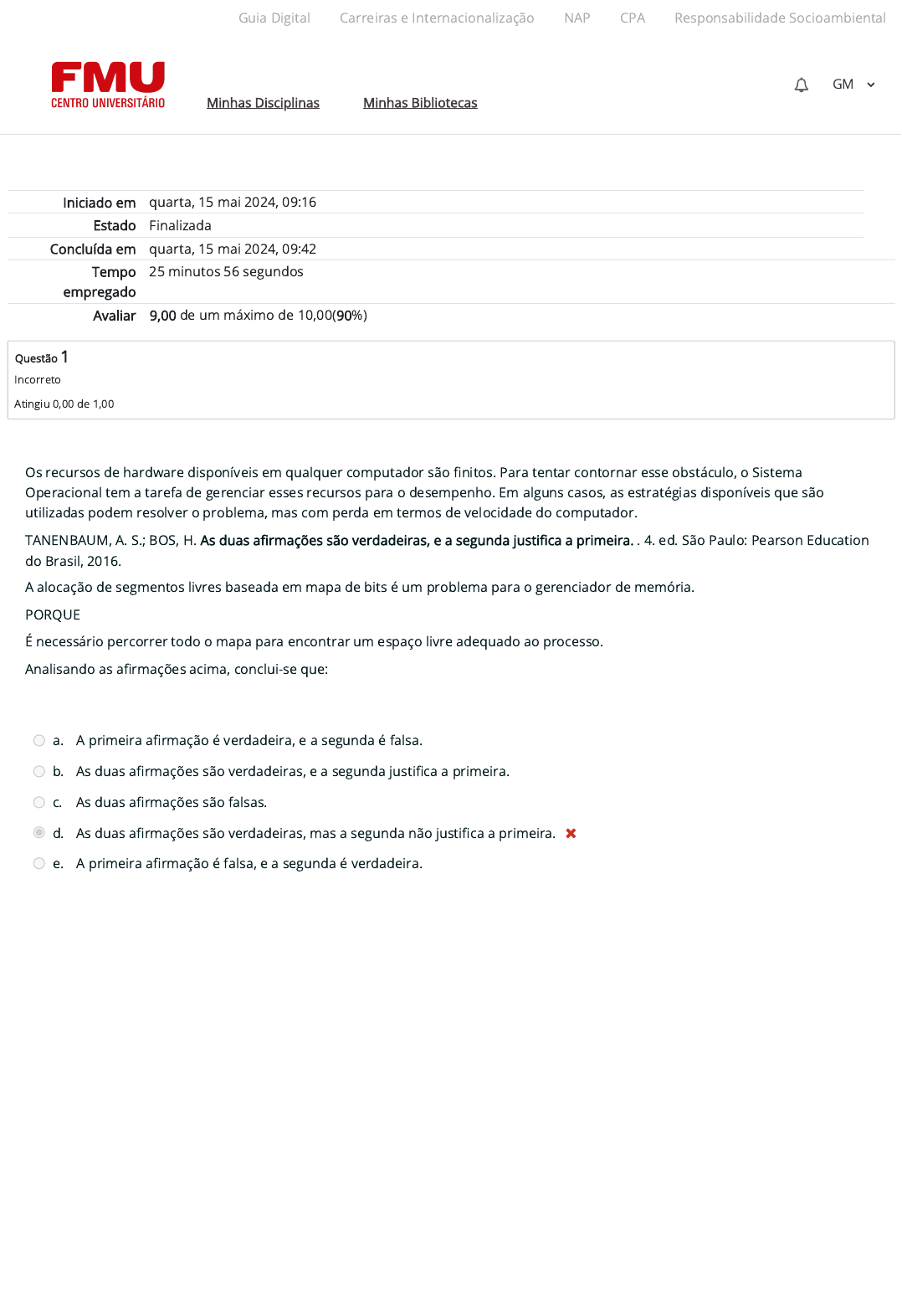 Iniciado em quarta, 15 mai 2024, 09:16 Estado Finalizada Concluída em quarta, 15 mai 2024, 09:42 Tempo empregado 25 minutos 56 segundos Avaliar 9,00 de um máximo de 10,00(90%) Questão 1 Incorreto Atingiu 0,00 de 1,00 Os recursos de hardware disponíveis em qualquer computador são �nitos. Para tentar contornar esse obstáculo, o Sistema Operacional tem a tarefa de gerenciar esses recursos para o desempenho. Em alguns casos, as estratégias disponíveis que são utilizadas podem resolver o problema, mas com perda em termos de velocidade do computador. TANENBAUM, A. S.; BOS, H. As duas a�rmações são verdadeiras, e a segunda justi�ca a primeira. . 4. ed. São Paulo: Pearson Education do Brasil, 2016. A alocação de segmentos livres baseada em mapa de bits é um problema para o gerenciador de memória. PORQUE É necessário percorrer todo o mapa para encontrar um espaço livre adequado ao processo. Analisando as a�rmações acima, conclui-se que: a. A primeira a�rmação é verdadeira, e a segunda é falsa. b. As duas a�rmações são verdadeiras, e a segunda justi�ca a primeira. c. As duas a�rmações são falsas. d. As duas a�rmações são verdadeiras, mas a segunda não justi�ca a primeira. e. A primeira a�rmação é falsa, e a segunda é verdadeira. Guia Digital Carreiras e Internacionalização NAP CPA Responsabilidade Socioambiental Minhas Disciplinas Minhas Bibliotecas GM https://codely-fmu-content.s3.amazonaws.com/Moodle/GuiaDigital/Guia+digital/index.html https://carreiras.fmu.br/ https://codely-fmu-content.s3.amazonaws.com/Moodle/NAP/inicial/nap/fmu/index.html https://codely-fmu-content.s3.amazonaws.com/Moodle/CPA/landing_CPA/index.html https://portal.fmu.br/sustentabilidade https://ambienteacademico.com.br/ https://ambienteacademico.com.br/ https://ambienteacademico.com.br/course/view.php?id=236 Questão 2 Correto Atingiu 1,00 de 1,00 Questão 3 Correto Atingiu 1,00 de 1,00 Adequar o recurso de hardware adequado a cada processo de uma tarefa que está sendo executado não é fácil. Assim, o Sistema Operacional precisa de uma gerência que consiga fazer com que os processos tenham o recurso disponível, sem a ocorrência de sobreposição no uso do recurso. TANENBAUM, A. S.; BOS, H. Sistemas operacionais modernos. 4. ed. São Paulo: Pearson Education do Brasil, 2016. Assim, qual assertiva é correta para expressar as condições de ocorrência para exclusão mútua? a. É permitido até dois processos simultâneos dentro de duas regiões críticas. b. Se uma região crítica já estiver em uso, outro processo pode interromper a ação atual. c. Não tem como supor sobre a velocidade ou o número de CPUs. d. A espera por recurso pode demorar um tempo in�nito. e. Um processo pode bloquear um evento, dentro ou fora de sua região crítica. Para ofertar certa justiça no uso dos recursos de hardware por parte dos processos em curso, o Sistema Operacional utiliza algumas estratégias na alocação dos recursos e do tempo de uso. Entre as várias disponíveis para o gerenciamento de memória na ação de paginação, tem-se o chamado FIFO, que signi�ca First in, First out. TANENBAUM, A. S.; BOS, H. Sistemas operacionais modernos. 4. ed. São Paulo: Pearson Education do Brasil, 2016. Considerando o uso da paginação, avalie as a�rmações a seguir. I. A troca de páginas pode ser realizada por meio da estratégia FIFO. II. A estratégia FIFO pode aplicar a forma de troca por cota de tempo. III. Uma forma de troca com uso do FIFO é por tamanho de processo. IV. Um processo pode ser retirado da execução, mesmo que não seja sua vez. V. O uso de paginação não diminui o desempenho do computador. Agora, assinale a alternativa que apresente as informações corretas para o uso da paginação. a. III, IV e V. b. I, II e III. c. II e III. d. I, II e IV. e. I e II. Guia Digital Carreiras e Internacionalização NAP CPA Responsabilidade Socioambiental Minhas Disciplinas Minhas Bibliotecas GM https://codely-fmu-content.s3.amazonaws.com/Moodle/GuiaDigital/Guia+digital/index.html https://carreiras.fmu.br/ https://codely-fmu-content.s3.amazonaws.com/Moodle/NAP/inicial/nap/fmu/index.html https://codely-fmu-content.s3.amazonaws.com/Moodle/CPA/landing_CPA/index.html https://portal.fmu.br/sustentabilidade https://ambienteacademico.com.br/ https://ambienteacademico.com.br/ https://ambienteacademico.com.br/course/view.php?id=236 Questão 4 Correto Atingiu 1,00 de 1,00 Questão 5 Correto Atingiu 1,00 de 1,00 Todas as partes físicas do computador são gerenciadas pelo Sistema Operacional. O motivo é que esse hardware é um recurso que está ao dispor das ações requisitadas pelos diversos softwares instalados no computador. Outro detalhe importante é que esses recursos têm limites de características à disposição e que afetam diretamente o desempenho do sistema computacional. TANENBAUM, A. S.; BOS, H. Sistemas operacionais modernos. 4. ed. São Paulo: Pearson Education do Brasil, 2016. Considerando as características do gerenciamento da memória real, avalie as a�rmações a seguir. I. Para facilitar o gerenciamento de memória, é criado um mapeamento com blocos, denominado espaço de endereçamento. II. O gerenciador de memória fornece toda a memória real disponível do computador para o processo que solicitou. III. Quando a quantidade de memória solicitada não é su�ciente, o gerenciador de memória pode fazer com que o processo que fez o pedido seja interrompido. IV. Para evitar a falta de recursos para os processos, uma sugestão é que os programas sejam capazes de ter seu processo fragmentado. V. Se o recurso requisitado pelo processo não for atendido conforme o pedido, sempre �ca na espera que tenha o su�ciente para �nalizar sua tarefa. Agora, assinale a alternativa que apresente as informações corretas sobre as características do gerenciamento da memória real. a. I, II e IV. b. I, III e IV. c. III, IV e V. d. II, IV e V. e. II, II