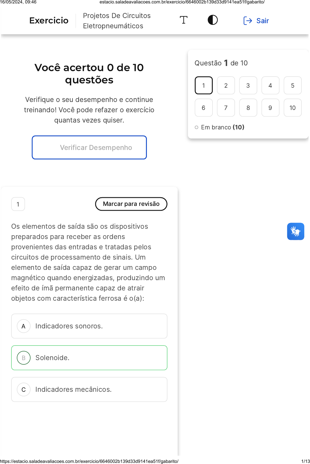 Você acertou 0 de 10 questões Verifique o seu desempenho e continue treinando! Você pode refazer o exercício quantas vezes quiser. Verificar Desempenho A B C 1 Marcar para revisão Os elementos de saída são os dispositivos preparados para receber as ordens provenientes das entradas e tratadas pelos circuitos de processamento de sinais. Um elemento de saída capaz de gerar um campo magnético quando energizadas, produzindo um efeito de ímã permanente capaz de atrair objetos com característica ferrosa é o(a): Indicadores sonoros. Solenoide. Indicadores mecânicos. Questão 1 de 10 Em branco �10� 1 2 3 4 5 6 7 8 9 10 Exercicio Projetos De Circuitos Eletropneumáticos Sair 16/05/2024, 09:46 estacio.saladeavaliacoes.com.br/exercicio/6646002b139d33d9141ea51f/gabarito/ https://estacio.saladeavaliacoes.com.br/exercicio/6646002b139d33d9141ea51f/gabarito/ 1/13 D E Indicadores luminosos. Atuadores. Questão não respondida Opa! A alternativa correta é a letra B. Confira o gabarito comentado! Gabarito Comentado O solenoide é um tipo de bobina eletromagnética que, quando energizado, gera um campo magnético. Este campo magnético produz um efeito semelhante ao de um ímã permanente, sendo capaz de atrair objetos com características ferrosas. Portanto, a alternativa correta é a 'B', que menciona o solenoide como o elemento de saída que possui essa capacidade. 2 Marcar para revisão O acionamento de uma válvula eletropneumática é feito através de uma fonte de alimentação com tensão de 12V. Ao medir-se a corrente elétrica que percorre essa válvula, faz-se uma leitura de 6mA. O consumo de energia dessa válvula é definido pela sua potência. Com base nos parâmetros apresentados, é possível definir que a potência dissipada na válvula eletropneumática é igual a: 16/05/2024, 09:46 estacio.saladeavaliacoes.com.br/exercicio/6646002b139d33d9141ea51f/gabarito/ https://estacio.saladeavaliacoes.com.br/exercicio/6646002b139d33d9141ea51f/gabarito/ 2/13 A B C D E 12 mW. 72 mW. 6 mW. 2 mW. 8 mW. Questão não respondida Opa! A alternativa correta é a letra B. Confira o gabarito comentado! Gabarito Comentado A potência elétrica é calculada pela fórmula P � V . I, onde P é a potência, V é a tensão e I é a corrente. Neste caso, a tensão é de 12V e a corrente é de 6mA. Substituindo esses valores na fórmula, temos P � 12 . 6 m, que resulta em P � 72 mW. Portanto, a potência dissipada na válvula eletropneumática é de 72 mW. 3 Marcar para revisão Em uma esteira móvel na linha de produção de vasos de vidro transparentes, deseja-se colocar um sensor que seja capaz de detectar todas as vezes que um dos vasos passar por esse 16/05/2024, 09:46 estacio.saladeavaliacoes.com.br/exercicio/6646002b139d33d9141ea51f/gabarito/ https://estacio.saladeavaliacoes.com.br/exercicio/6646002b139d33d9141ea51f/gabarito/ 3/13 A B C D E sensor. O mais recomendado para esse projeto seria: Um sensor magnético Um sensor indutivo Um sensor óptico reflexivo Um sensor capacitivo Um pressostato Questão não respondida Opa! A alternativa correta é a letra D. Confira o gabarito comentado! Gabarito Comentado O sensor capacitivo é o mais indicado para este projeto. Isso se deve ao fato de que os vasos de vidro são transparentes e não metálicos. O sensor capacitivo é capaz de detectar a presença de objetos não metálicos e transparentes, como o vidro, pois ele funciona com base na variação da capacitância, que ocorre quando um objeto se aproxima do sensor. Portanto, sempre que um vaso de vidro passar pelo sensor, haverá uma variação na capacitância, que será detectada pelo sensor, indicando a presença do vaso. 16/05/2024, 09:46 estacio.saladeavaliacoes.com.br/exercicio/6646002b139d33d9141ea51f/gabarito/ https://estacio.saladeavaliacoes.com.br/exercicio/6646002b139d33d9141ea51f/gabarito/ 4/13 A B C D E 4 Marcar para revisão No diagrama abaixo, é possível afirmar que o acionamento do botão B3, será responsável por: romper o selo de retenção do botão B1 acionar o contato K2 promover o recuo do cilindro caso o selo K2 não esteja ativo acionar a bobina K1 e promover o avanço do cilindro acionar a bobina K2 e promover o avanço do cilindro Questão não respondida Opa! A alternativa correta é a letra C. Confira o gabarito comentado! 16/05/2024, 09:46 estacio.saladeavaliacoes.com.br/exercicio/6646002b139d33d9141ea51f/gabarito/ https://estacio.saladeavaliacoes.com.br/exercicio/6646002b139d33d9141ea51f/gabarito/ 5/13 A B C D E Gabarito Comentado O botão B3 é responsável por promover o retorno do cilindro se, e somente se, o contato por retenção não estiver ativo. 5 Marcar para revisão Uma fonte de alimentação de 48V está sendo utilizada para alimentar um circuito eletropneumático de 24Vdc. Dessa forma, é possível definir que é necessário um amplificador com ganho igual a: 2 4 � 0,5 � 2 0,5 Questão não respondida Opa! A alternativa correta é a letra E. Confira o gabarito comentado! Gabarito Comentado 16/05/2024, 09:46 estacio.saladeavaliacoes.com.br/exercicio/6646002b139d33d9141ea51f/gabarito/ https://estacio.saladeavaliacoes.com.br/exercicio/6646002b139d33d9141ea51f/gabarito/ 6/13 A B C D E 6 Marcar para revisão Os elementos de saída são os dispositivos preparados para receber as ordens provenientes das entradas e tratadas pelos circuitos de processamento de sinais. Um elemento de sinalização usado em locais com muito ruído são: Indicadores sonoros. Solenoide. Indicadores mecânicos. Indicadores luminosos. Atuadores. Questão não respondida Opa! A alternativa correta é a letra D. Confira o gabarito comentado! Gabarito Comentado Os indicadores luminosos são dispositivos que fornecem indicações visuais diversas. Esses indicadores podem variar desde 16/05/2024, 09:46 estacio.saladeavaliacoes.com.br/exercicio/6646002b139d33d9141ea51f/gabarito/ https://estacio.saladeavaliacoes.com.br/exercicio/6646002b139d33d9141ea51f/gabarito/ 7/13 A B lâmpad