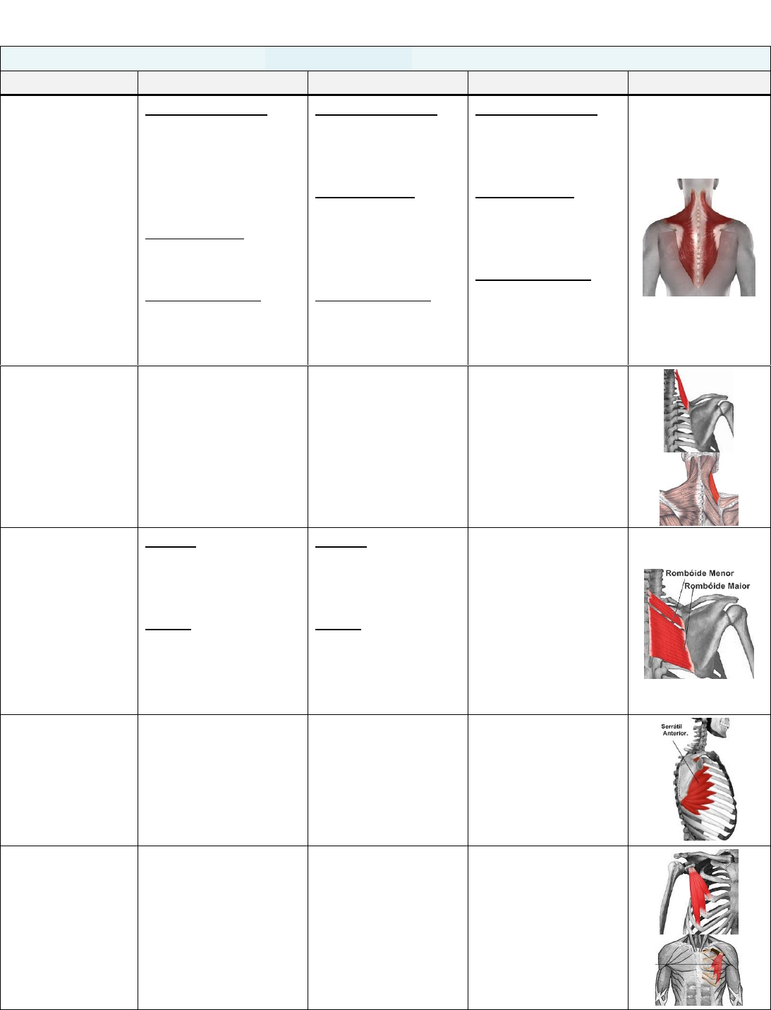 Músculos que unem o tronco a cintura escapular: MÚSCULO ORIGEM INSERÇÃO AÇÃO LOCALIZAÇÃO TRAPÉZIO Fibras superiores: - base do crânio; - protuberância occipital externa; - ligamentos posteriores; Fibras médias: - processos espinhosos de T1-T5; Fibras inferiores: - processos espinhosos de T6-T12; Fibras superiores: - terço lateral da clavícula; - acrômio; Fibras médias: - margem medial do acrômio; - borda superior da espinha da escápula; Fibras inferiores: - base da espinha da escápula; Fibras superiores: - elevação e rotação para cima da escápula; Fibras médias: - elevação, rotação para cima e adução da escápula; Fibras inferiores: - depressão, adução e rotação para cima da escápula; ELEVADOR DA ESCÁPULA - processos transversos de C1-C4; - borda medial da escápula entre o ângulo superior e a base da espinha da escápula; - elevação e rotação para baixo da escápula; ROMBÓIDE MENOR E MAIOR Menor: - ligamento nucal, processos espinhosos de C7-T1; Maior: - processos espinhosos de T2-T5; Menor: - extremidade medial da espinha da escápula; Maior: - margem medial da escápula a partir do nível da espinha até o ângulo inferior; - adução e rotação para baixo da escápula; SERRÁTIL ANTERIOR - superfície externa das oito ou nove costelas superiores; - superfície anterior da borda vertebral da escápula; - abdução e rotação para cima da escápula; PEITORAL MENOR - superfície anterior da terceira à quinta costela; - processo coracoide da escápula; - abdução, depressão e rotação para baixo da escápula; Músculos que unem o tronco a cintura escapular: COMPLEXO DO OMBRO - MÚSCULOS Músculos que unem o tronco e o úmero: MÚSCULO ORIGEM INSERÇÃO AÇÃO LOCALIZAÇÃO GRANDE DORSAL (latíssimo do dorso) - processos espinhosos de T6-T12; - vértebras lombares; - sacro; - crista ilíaca posterior - 4 costelas inferiores via fáscia toracolombar; - sulco intertubercular do úmero; - estende, aduz e roda medialmente o braço; PEITORAL MAIOR - metade medial da clavícula; - esterno; - 6 primeiras costelas; - crista do tubérculo maior do úmero; - flexiona, aduz e roda medialmente o braço; Músculos que unem a escápula e o úmero: MÚSCULO ORIGEM INSERÇÃO AÇÃO LOCALIZAÇÃO DELTÓIDE Fibras anteriores: - extremidade acromial da clavícula; Fibras laterais: - acrômio da escápula; Fibras posteriores: - espinha da escápula; - tuberosidade para o músculo deltoide; Fibras anteriores : - flexionam e rodam medialmente o braço; Fibras laterais: - abduzem o braço, na articulação do ombro; Fibras posteriores: - estendem e rodam lateralmente o braço; SUPRAES- PINHOSO - fossa supraespinhal da escápula; - tubérculo maior do úmero; - abdução do braço; INFRAES- PINHOSO - fossa infraespinhal da escápula; - tubérculo maior do úmero; - rotação lateral do braço; SUBESCA- PULAR - fossa subescapular da escápula; - tubérculo menor do úmero; - rotação medial do braço; REDONDO MENOR - margem lateral inferior da escápula; - tubérculo maior do úmero; - roda lateralmente o braço; REDONDO MAIOR - ângulo inferior da escápula (face dorsal); - tubérculo menor do úmero; - aduz, estende e roda medialmente o braço; CORACO- BRAQUIAL - processo coracoide da escápula; - porção média do úmero (face medial); - flexiona e aduz o braço. LEGENDA: ORIGEM: FIXAÇÃO DO TENDÃO DE UM MÚSCULO AO OSSO ESTACIONÁRIO (GERALMENTE). INSERÇÃO: FIXAÇÃO DO OUTRO TENDÃO DO MÚSCULO AO OSSO MÓVEL (GERALMENTE). ABDUÇÃO: MOVIMENTO PARA LONGE DA LINHA MÉDIA DO CORPO. ADUÇÃO: MOVIMENTO DE APROXIMAÇÃO DA LINHA MÉDIA DO CORPO. TRM