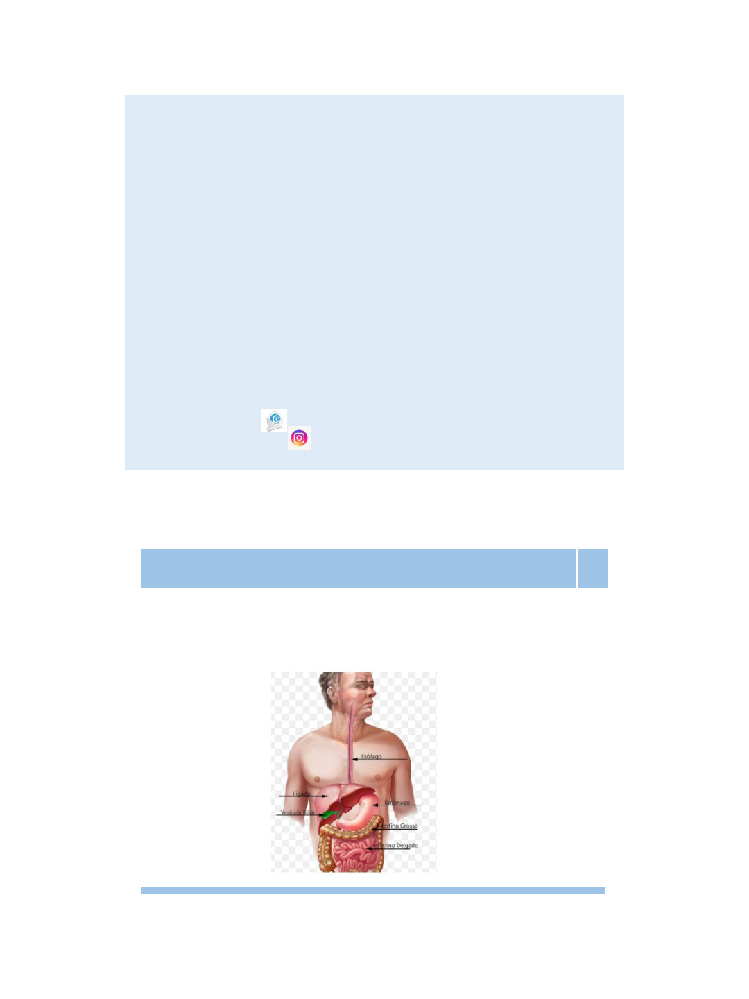 14/03/2024 1 Aula 4 - Fisiologia do sistema digestório (parte 1) Uninassau - Petrolina Disciplina: Funções biológicas Professora Drª. Jamile Maiara da Silva Santos Doutorado em Biotecnologia Mestrado em Ciência Áreas: Histologia, Embriologia e Citologia jamile_maiara@hotmail.com jamile_maiara_myle Introdução ao sistema digestório • O sistema digestório inicia com a cavidade oral (boca e faringe), que servem de receptor para a comida. O alimento ingerido entra no trato gastrintestinal (TGI), que consiste em: 2 14/03/2024 2 Introdução ao sistema digestório • Lúmen do intestino • Órgãos glandulares acessórios • Quimo 3 Cavidade oral • Na cavidade oral, os primeiros estágios da digestão iniciam com a mastigação e a secreção da saliva por três pares de glândulas salivares: 4 14/03/2024 3 Esôfago • O alimento deglutido passa pelo esôfago (tubo estreito que atravessa o tórax ao abdômen): 5 1: Mucosa (epitélio de revestimento) 2: Mucosa (lâmina própria) 3: Mucosa (muscular da mucosa) 4: Submucosa 5: Muscular 6: Adventícia ou serosa 5 Plexo de meissner ou submucoso Plexo de auerbach ou mioenterico Estômago • O estômago é um órgão em forma de saco que pode conter até dois litros de alimento e líquidos quando totalmente expandido. Apresenta três partes: • O estômago continua a digestão que iniciou na boca, misturando o alimento com ácido e enzimas para criar o quimo. 6 E-ID ML 14/03/2024 4 Intestino delgado • A maior parte da digestão ocorre no intestino delgado, que possui três seções: • A digestão é realizada por enzimas intestinais, auxiliadas por secreções exócrinas de dois órgãos glandulares acessórios 7 Intestino grosso • No colón o quimo aquoso transforma-se em fezes semissólidas à medida que a água e os eletrólitos são absorvidos do quimo para o líquido extracelular (LEC). • As fezes são propelidas para a seção terminal do intestino grosso, conhecida como reto 8 14/03/2024 5 Curiosidade 9 Em uma pessoa viva, o sistema digestório da boca até o ânus tem cerca de 450 cm de comprimento. Deste comprimento, 395 cm consistem nos intestinos grosso e delgado. Tente imaginar 3,95 metros de corda, com 2,5 a 7,5 centímetros de diâmetro, toda enrolada dentro do seu abdome, do umbigo para baixo. O arranjo apertado dos órgãos abdominais ajuda a explicar por que você sente necessidade de soltar o seu cinto após ingerir uma grande quantidade de comida. Função do sistema digestório • Levar nutrientes, água e eletrólitos do ambiente externo para o ambiente interno corporal. Para alcançar esse objetivo, o sistema usa quatro processos básicos: digestão, absorção, secreção e motilidade 10 14/03/2024 6 Enzimas digestórias Enzimas digestórias • As enzimas digestórias são proteínas secretadas tanto por glândulas exócrinas (glândulas salivares e o pâncreas) quanto por células epiteliais no estômago e no intestino delgado. 12 Glândulas gástricas e mucosas 14/03/2024 7 Muco • É uma secreção viscosa composta primariamente de glicoproteínas, chamadas de mucinas que tem a função de formar uma cobertura protetora sobre a mucosa GI e lubrificar o conteúdo do intestino. É produzida por: 13 Muco • Os sinais para a liberação de muco incluem: • Inervação parassimpática • Neuropeptídeos encontrados no sistema nervoso entérico • Citocinas provenientes dos imunócitos. 14 14/03/2024 8 Motilidade do tecido muscular liso Motilidade do tecido muscular liso • A motilidade do tecido muscular liso é importante para: • Transportar o alimento da boca até o ânus • Misturá-lo mecanicamente para quebrá-lo uniformemente em partículas pequenas • Tipos de contração • Tônicas (região apical do estômago) • Fásicas (região distal do estômago e ID) • Tipo de célula 16 14/03/2024 9 Ciclos de contração e relaxamento do tecido muscular liso • São associados a ciclos de despolarização e repolarização, denominados ondas lentas ou potenciais de ondas lentas que coordenam a motilidade 17 Pesquisas com ICC Ciclos de contração e relaxamento do tecido muscular liso • Vídeo 1: potencial de membrana 18 14/03/2024 10 Contração do tecido muscular liso 19 Pesquisas com ICC Cálcio Calmodulina Complexo cálcio - calmodulina Caldesmona Liberação do sitio ativo para a actina F Ativação da quinase de cadeia leve da miosina Fosforila a cadeia reguladora, permitindo o desdobramento da porção da meromiosina leve em miosina II Relaxamento do tecido muscular liso 20 Cálcio Calmodulina Complexo cálcio - calmodulina Caldesmona Liberação do sitio ativo para a actina F Inativação da quinase de cadeia leve da miosina Mascaramento do sítio de ligação da miosina com a actina: relaxamento 14/03/2024 11 Contração do tecido muscular liso gastrointestinal • As contrações musculares no trato gastrintestinal ocorrem em três padrões que levam a diferentes tipos de movimentos no trato 1) Complexo motor migratório 2) Peristaltismo 3) Contrações segmentares 21 Contração do tecido muscular liso gastrointestinal 1) O complexo motor migratório tem função de “limpeza da casa” 22 14/03/2024 12 Contração do tecido muscular liso gastrointestinal 2) O peristaltismo são ondas progressivas de contração que se movem de uma seção do TGI para a próxima 23 Contração do tecido muscular liso gastrointestinal 3) As contrações segmentares, ou seja, segmentos curtos (1-5 cm) de intestino contraem e relaxam alternadamente 24 14/03/2024 13 CURIOSIDADE 25 Complexo motor migratório ausente Dúvidas? 14/03/2024 14 Excelente estudo! Uninassau - Petrolina Disciplina: Funções biológicas Professora Drª. Jamile Maiara da Silva Santos Doutorado em Biotecnologia Mestrado em Ciência Áreas: Histologia, Embriologia e Citologia jamile_maiara@hotmail.com jamile_maiara_myle Slide 1: Aula 4 - Fisiologia do sistema digestório (parte 1) Slide 2: Introdução ao sistema digestó