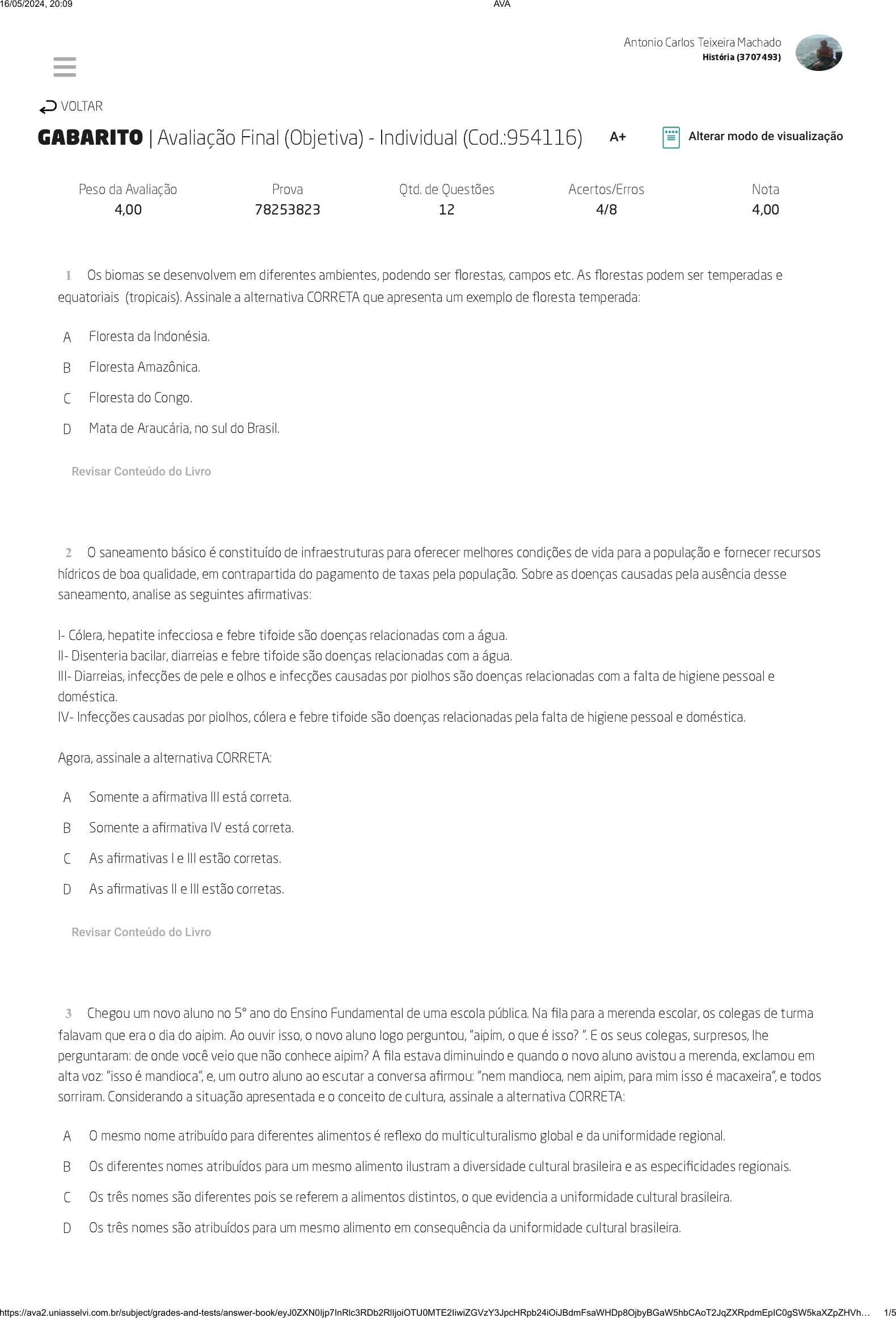 GABARITO | Avaliação Final (Objetiva) - Individual (Cod.:954116) Peso da Avaliação 4,00 Prova 78253823 Qtd. de Questões 12 Acertos/Erros 4/8 Nota 4,00 Os biomas se desenvolvem em diferentes ambientes, podendo ser florestas, campos etc. As florestas podem ser temperadas e equatoriais (tropicais). Assinale a alternativa CORRETA que apresenta um exemplo de floresta temperada: A Floresta da Indonésia. B Floresta Amazônica. C Floresta do Congo. D Mata de Araucária, no sul do Brasil. O saneamento básico é constituído de infraestruturas para oferecer melhores condições de vida para a população e fornecer recursos hídricos de boa qualidade, em contrapartida do pagamento de taxas pela população. Sobre as doenças causadas pela ausência desse saneamento, analise as seguintes afirmativas: I- Cólera, hepatite infecciosa e febre tifoide são doenças relacionadas com a água. II- Disenteria bacilar, diarreias e febre tifoide são doenças relacionadas com a água. III- Diarreias, infecções de pele e olhos e infecções causadas por piolhos são doenças relacionadas com a falta de higiene pessoal e doméstica. IV- Infecções causadas por piolhos, cólera e febre tifoide são doenças relacionadas pela falta de higiene pessoal e doméstica. Agora, assinale a alternativa CORRETA: A Somente a afirmativa III está correta. B Somente a afirmativa IV está correta. C As afirmativas I e III estão corretas. D As afirmativas II e III estão corretas. Chegou um novo aluno no 5° ano do Ensino Fundamental de uma escola pública. Na fila para a merenda escolar, os colegas de turma falavam que era o dia do aipim. Ao ouvir isso, o novo aluno logo perguntou, "aipim, o que é isso? ". E os seus colegas, surpresos, lhe perguntaram: de onde você veio que não conhece aipim? A fila estava diminuindo e quando o novo aluno avistou a merenda, exclamou em alta voz: "isso é mandioca", e, um outro aluno ao escutar a conversa afirmou: "nem mandioca, nem aipim, para mim isso é macaxeira", e todos sorriram. Considerando a situação apresentada e o conceito de cultura, assinale a alternativa CORRETA: A O mesmo nome atribuído para diferentes alimentos é reflexo do multiculturalismo global e da uniformidade regional. B Os diferentes nomes atribuídos para um mesmo alimento ilustram a diversidade cultural brasileira e as especificidades regionais. C Os três nomes são diferentes pois se referem a alimentos distintos, o que evidencia a uniformidade cultural brasileira. D Os três nomes são atribuídos para um mesmo alimento em consequência da uniformidade cultural brasileira. VOLTAR A+ Alterar modo de visualização 1 Revisar Conteúdo do Livro 2 Revisar Conteúdo do Livro 3 Antonio Carlos Teixeira Machado História (3707493) 16/05/2024, 20:09 AVA https://ava2.uniasselvi.com.br/subject/grades-and-tests/answer-book/eyJ0ZXN0Ijp7InRlc3RDb2RlIjoiOTU0MTE2IiwiZGVzY3JpcHRpb24iOiJBdmFsaWHDp8OjbyBGaW5hbCAoT2JqZXRpdmEpIC0gSW5kaXZpZHVh… 1/5 O neoliberalismo propõe que o bem-estar humano pode ser melhor promovido liberando-se as capacidades empreendedoras individuais no âmbito de uma estrutura caracterizada por sólidos direitos à propriedade privada, livres mercados e comércio. O neoliberalismo forjou-se a partir dos elementos já existentes no interior do liberalismo clássico do século XVIII, porém, privilegiou alguns ideais. Sobre esses ideais, assinale a alternativa CORRETA: A Culturais. B Econômicos. C Políticos. D Sociais. A tecnocracia afirma que a ciência é a razão para tudo. É ela que nos permite explicar nosso dia a dia e porque muitos fatos acontecem de determinado modo e não de outro. No entanto, a tecnocracia utiliza um modelo de sequenciamento contínuo que consegue exemplificar como a evolução da sociedade se deu por consequência da ciência. Com relação a essas etapas de sequenciamento, analise as sentenças a seguir: I- No sequenciamento estudado pela tecnocracia, primeiro se deu o desenvolvimento da tecnologia. II- No sequenciamento estudado pela tecnocracia, o segundo desenvolvimento que aconteceu foi o desenvolvimento econômico. III- No sequenciamento estudado pela tecnocracia, o que dá início a todo desenvolvimentos a seguir é a ciência. IV- No sequenciamento estudado pela tecnocracia, a última etapa a se desenvolver é a sociedade. Agora, assinale a alternativa CORRETA: A As sentenças III e IV estão corretas. B As sentenças I e II estão corretas. C As sentenças I e III estão corretas. D As sentenças II, III e IV estão corretas. O multiculturalismo significa a existência de grupos de diversas culturas, assim como o embate político, econômico e social travado pelos diferentes grupos sociais na luta pelo respeito à diversidade. Sobre multiculturalismo, classifique V para as sentenças verdadeiras e F para as falsas: ( ) Multiculturalismo significa a existência de grupos de diversas culturas convivendo de forma desarmônica. ( ) O multiculturalismo é pluralista, porque as diferenças coexistem em um mesmo país ou região. ( ) Multiculturalismo implica na conquista de reivindicações das minorias ou grupos marginalizados, como os negros e índios. ( ) No multiculturalismo há diálogo e convivência pacífica entre as culturas diversas. No entanto, esta coexistência pacífica significa negar as diferenças. Assinale a alternativa que apresenta a sequência CORRETA: A F - V - V - F. B F - V - F - V. C F - V - V - V. D V - F - V - F. O Brasil possui uma divisão sociopolítica, na qual encontramos o Primeiro Setor (caracterizado pelo Estado), o Segundo Setor (que abarca as instituições privadas) e o Terceiro Setor contempla as Organizações Não Governamentais (ONGs), que têm algumas particularidades: "No que concerne às formas como as ONGs se movem no espaço público, vale chamar a atenção para o potencial de construção de redes, 4 5 Revisar Conteúdo do Livro 6 7 Antonio Carlos Teixeira Machado História (3707493) 16/05/2024, 20:09 AVA https: