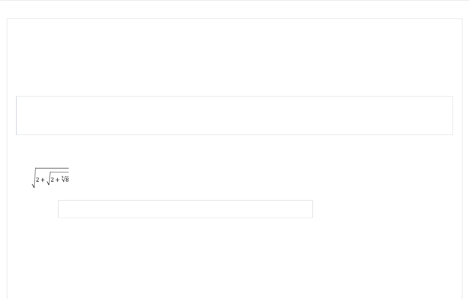 29/04/2024, 22:39 3.4 Teste seus conhecimentos - propriedades da radiciação: Revisão da tentativa https://moodle.ifrs.edu.br/mod/quiz/review.php?attempt=15808484&cmid=376126 1/7 Iniciado em segunda, 29 abr 2024, 21:49 Estado Finalizada Concluída em segunda, 29 abr 2024, 22:23 Tempo empregado 34 minutos 16 segundos Avaliar 9,00 de um máximo de 10,00(90%) Questão 1 Correto Atingiu 1,00 de 1,00 Reduza a expressão a seguir usando as propriedades da radiciação: Resposta: 2 29/04/2024, 22:39 3.4 Teste seus conhecimentos - propriedades da radiciação: Revisão da tentativa https://moodle.ifrs.edu.br/mod/quiz/review.php?attempt=15808484&cmid=376126 2/7 Questão 2 Correto Atingiu 1,00 de 1,00 Ao reduzir a expressão , usando as propriedades da radiciação, temos como resultado: Escolha uma opção: a. 30 b. c. 15 d. 5 e. Sua resposta está correta. 29/04/2024, 22:39 3.4 Teste seus conhecimentos - propriedades da radiciação: Revisão da tentativa https://moodle.ifrs.edu.br/mod/quiz/review.php?attempt=15808484&cmid=376126 3/7 Questão 3 Correto Atingiu 1,00 de 1,00 Questão 4 Correto Atingiu 1,00 de 1,00 Reduza a expressão a seguir usando as propriedades da radiciação: Resposta: 2 Ao reduzir a expressão , usando as propriedades da radiciação, temos como resultado: Escolha uma opção: Verdadeiro Falso 29/04/2024, 22:39 3.4 Teste seus conhecimentos - propriedades da radiciação: Revisão da tentativa https://moodle.ifrs.edu.br/mod/quiz/review.php?attempt=15808484&cmid=376126 4/7 Questão 5 Correto Atingiu 1,00 de 1,00 Questão 6 Correto Atingiu 1,00 de 1,00 A operação a seguir está correta? ( √(16) )^2 = 16 a. Depende do contexto b. Não se pode afirmar c. Não d. Sim Reduza a expressão a seguir usando as propriedades da radiciação: Resposta: 2 29/04/2024, 22:39 3.4 Teste seus conhecimentos - propriedades da radiciação: Revisão da tentativa https://moodle.ifrs.edu.br/mod/quiz/review.php?attempt=15808484&cmid=376126 5/7 Questão 7 Incorreto Atingiu 0,00 de 1,00 Questão 8 Correto Atingiu 1,00 de 1,00 Ao reduzir a expressão , usando as propriedades da radiciação, temos como resultado: Escolha uma opção: Verdadeiro Falso Reduza a expressão a seguir usando as propriedades da radiciação: Resposta: 10 29/04/2024, 22:39 3.4 Teste seus conhecimentos - propriedades da radiciação: Revisão da tentativa https://moodle.ifrs.edu.br/mod/quiz/review.php?attempt=15808484&cmid=376126 6/7 Questão 9 Correto Atingiu 1,00 de 1,00 Questão 10 Correto Atingiu 1,00 de 1,00 Ao reduzir a expressão , usando as propriedades da radiciação, temos como resultado: Escolha uma opção: Verdadeiro Falso Reduza a expressão a seguir usando as propriedades da radiciação: Resposta: 2 ◄ 3.3 Propriedades da Radiciação https://moodle.ifrs.edu.br/mod/page/view.php?id=376125&forceview=1 29/04/2024, 22:39 3.4 Teste seus conhecimentos - propriedades da radiciação: Revisão da tentativa https://moodle.ifrs.edu.br/mod/quiz/review.php?attempt=15808484&cmid=376126 7/7 Seguir para... 3.5 Racionalização ► https://moodle.ifrs.edu.br/mod/page/view.php?id=376127&forceview=1