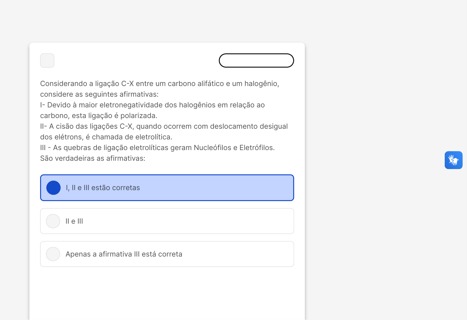 A B C 1 Marcar para revisão Considerando a ligação C�X entre um carbono alifático e um halogênio, considere as seguintes afirmativas: I� Devido à maior eletronegatividade dos halogênios em relação ao carbono, esta ligação é polarizada. II� A cisão das ligações C�X, quando ocorrem com deslocamento desigual dos elétrons, é chamada de eletrolítica. III � As quebras de ligação eletrolíticas geram Nucleófilos e Eletrófilos. São verdadeiras as afirmativas: I, II e III estão corretas II e III Apenas a afirmativa III está correta D E I e III I e II 2 Marcar para revisão Derivados halogenados são bons substratos para a preparação de éteres, em laboratório, através de reação com reagentes nucleofílicos fortes, como o metóxido de sódio. A velocidade dessas reações pode ser drasticamente aumentada pela escolha apropriada do solvente. Considere os substratos 3-bromo-3-etil-hexano e brometo de etila. Dado: DMSO corresponde a �CH ) S�O As opções abaixo repetem em frases as opções dispostas na tabela. Marque aquela que apresenta o tipo de mecanismo e o solvente adequado para a reação desses substratos halogenados com o metóxido de sódio. 3 2 A B C D E 3-bromo-3-metil-hexano- mecanismo: S 1 � Solvente: hexano/ brometo de metila mecanismo: S 2� Solvente: hexano. N N 3-bromo-3-metil-hexano- mecanismo: S 1 � Solvente: DMSO/ brometo de metila mecanismo: S 2� Solvente: DMSO. N N 3-bromo-3-metil-hexano- mecanismo: S 1 � Solvente: hexano/ brometo de metila mecanismo: S 1 � Solvente: metanol. N N 3-bromo-3-metil-hexano- mecanismo: S 2 � Solvente: metanol/ brometo de metila mecanismo: S 2 � Solvente: hexano. N N 3-bromo-3-metil-hexano- mecanismo: S 2 � Solvente: DMSO/ brometo de metila mecanismo: S 1 � Solvente: metanol. N N 3 Marcar para revisão Observe a fórmula dos dois compostos aromáticos a seguir. A B C D E Marque a alternativa que indica, respectivamente, a nomenclatura correta. 2,4�6-trinitro-metilbenzeno e 2-cloro-6-etil-aminobenzeno. 2,4�6-trinitro-metilbenzeno e 1-cloro-3-etil-aminobenzeno. 2-metil-1,3,5-trinitrobenzeno e 3-cloro-5-etil-benzenamina. 2-metil-1,3,5-trinitrobenzeno e 1 cloro-3 etil- benzoamina. 4-metil-1,3,5-trinitrobenzeno e 6-amino-5-cloro-etilbenzeno. 4 Marcar para revisão A B Considerando a reação de nitração a seguir, frente a um substituinte X no benzeno e analisando os produtos formados, podemos afirmar que: O fluorbenzeno é o mais reativo da série e o mais seletivo para o produto para. Os halogênios �F, Cl, Br, I� ativam o anel benzênico pois são grupos doadores de elétrons. C D E Os halogênios são orientadores da posição meta. O bromobenzeno é o composto mais reativo da série devido a seu volume e polarizabilidade. O fluorbenzeno é o composto menos reativo da série devido a sua alta eletronegatividade. 5 Marcar para revisão Reações de oxidação e redução são importantes pois permitem a interconversão de grupos funcionais. Analise as afirmativas a seguir sobre as reações de oxidação e redução: I � A redução de uma cetona utilizando composto de Grignard levará à formação de um álcool secundário. II � A oxidação de um aldeído a ácido carboxílico depende da formação do diol gem, ou seja, não pode ser realizada em meio anidro. III � Na oxidação de Baeyer-Villiger é possível oxidar cetonas através do uso de perácidos ou uma combinação de água oxigenada e um ácido de Lewis. IV � As reduções por hidreto podem ser feitas utilizando tanto o hidreto de alumínio e lítio quanto borohidreto de sódio, porém o segundo é preferido pois não reage violentamente com a água. A B C D E II, III e IV, apenas. I, II e IV, apenas. II e III, apenas. III e IV, apenas. I, II e III, apenas. 6 Marcar para revisão Os compostos orgânicos desempenham papéis cruciais em muitos processos industriais. Sua reatividade e a capacidade de interagir com outras moléculas os tornam valiosos para a síntese de novos compostos. Qual a função das aminas na síntese de amidas a partir de ácidos carboxílicos? A B C D E Transformam os ácidos em ânions carboxilatos não reativos Aceleram a reação Atuam como catalisadores Convertem ácidos em aldeídos Neutralizam o pH da solução 7 Marcar para revisão A indústria química da borracha utiliza várias classes de compostos como antidegradantes, que são antioxidantes e antiozonantes. Esses compostos desempenham uma função importante porque protegem a borracha natural ou sintética dos efeitos danosos da exposição à atmosfera e à luz do sol. Os antioxidantes retardam a oxidação da borracha. Os antiozonantes também são utilizados em combinação com as borrachas insaturadas para evitar reação com o ozônio da atmosfera, que provoca fissuras na superfície do composto de borracha. Um dos intermediários A B C D E mais importantes na síntese desses antidegradantes está representado a seguir: A nomenclatura correta desse composto é: 1-aminodibenzilamina 4-aminodibenzilamina 4-aminodifenilamina 1-aminodifenilamida 1,4-diaminofenilbenzeno 8 Marcar para revisão �UFPA � /2017� Técnicas como a espectrometria de massas auxiliam na determinação da estrutura química de diversas substâncias. O espectro de 00 hora : 09 min : 26 seg Ocultar Questão 9 de 10 Respondidas �10� Em branco �0� Finalizar prova 1 2 3 4 5 6 7 8 9 10 SM1 Reações Químicas e Análise De Compostos Orgânicos A B C D E massa abaixo é de um composto puro, cuja fórmula química é : Dados: Massas atômicas (u) H � 1; C � 12; O � 16; F � 19; Br � 80 CH Br.3 C H .6 6 CH F .2 2 C H CH CH .6 5 2 3 C H CHO.6 5 A B C D E 9 Marcar para revisão Observe a reação abaixo e assinale a alternativa correta: A reação ocorrerá tanto para substituição nucleofílica quanto para eliminação. A reação é uma solvólise e o mecanismo favorecido é o SN2. A presença do nucleófilo forte favorece a SN2. A presen
