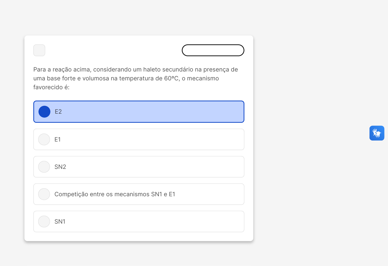 A B C D E 1 Marcar para revisão Para a reação acima, considerando um haleto secundário na presença de uma base forte e volumosa na temperatura de 60ºC, o mecanismo favorecido é: E2 E1 SN2 Competição entre os mecanismos SN1 e E1 SN1 A B C D E 2 Marcar para revisão Considerando a ligação C�X entre um carbono alifático e um halogênio, considere as seguintes afirmativas: I� Devido à maior eletronegatividade dos halogênios em relação ao carbono, esta ligação é polarizada. II� A cisão das ligações C�X, quando ocorrem com deslocamento desigual dos elétrons, é chamada de eletrolítica. III � As quebras de ligação eletrolíticas geram Nucleófilos e Eletrófilos. São verdadeiras as afirmativas: I, II e III estão corretas II e III I e III Apenas a afirmativa III está correta I e II A B C D E 3 Marcar para revisão Observe a fórmula dos dois compostos aromáticos a seguir. Marque a alternativa que indica, respectivamente, a nomenclatura correta. 2-metil-1,3,5-trinitrobenzeno e 1 cloro-3 etil- benzoamina. 2,4�6-trinitro-metilbenzeno e 1-cloro-3-etil-aminobenzeno. 4-metil-1,3,5-trinitrobenzeno e 6-amino-5-cloro-etilbenzeno. 2-metil-1,3,5-trinitrobenzeno e 3-cloro-5-etil-benzenamina. 2,4�6-trinitro-metilbenzeno e 2-cloro-6-etil-aminobenzeno. A B C D E 4 Marcar para revisão O que é necessário para que um carbono possa estar deficiente de elétrons e, portanto, seja altamente eletrofílico em uma reação de síntese de alquilbenzenos? Ter uma valência superior a 4. Estar em um composto aromático. Ser ativado por um catalisador ácido de Lewis Possuir alta densidade de elétrons. Apresentar alta eletronegatividade. 5 Marcar para revisão Reações de halogenação alfa à carbonila são extremamente úteis, pois fornecem intermediários para outros tipos de reação. É o caso da A B C bromação alfa, exemplo, no qual o átomo de bromo pode ser perdido na forma de HBr e levar à formação de um composto α,β-insaturados. Um estagiário, interessado em entender melhor essas reações, promoveu uma série de halogenações utilizando tanto catálise ácida quanto catálise básica e variando os halogênios moleculares �Cl , Br e I ). O que ele observou é que a mudança dos halogênios não alterava a velocidade da reação em nenhum dos dois tipos de catálise. Assinale a alternativa que apresenta uma justificativa para essa observação: 2 2 2 O único halogênio que afetaria a velocidade da reação é o flúor, mas como ele não foi utilizado durante as halogenações, não foi possível perceber a diferença. A catálise ácida forma o ácido com o halogênio e todos os ácidos reagem da mesma forma com o aldeído ou cetona. Tanto na catálise ácida quanto na catálise básica, a etapa lenta, determinante da velocidade da reação, é a formação do intermediário enol ou enolato. D E Cloro, bromo e iodo em suas formas moleculares não são capazes de reagir com aldeídos e cetonas, apenas os ácidos HCl, HBr e HI seriam capazes de alterar a velocidade da reação. A etapa lenta da reação é a ruptura homolítica da ligação entre os halogênios e a velocidade com que ela acontece é a mesma em todos os casos. 6 Marcar para revisão Uma equipe de químicos está estudando a reação de condensação de Claisen e a subsequente descarboxilação em ácido malônico. Eles observam a formação de um produto específico e analisam sua estrutura. Considerando o texto, analise as afirmativas abaixo: Afirmativas: I� A reação de condensação de Claisen resulta na formação de cetonas. II� Na descarboxilação de ácido malônico, um ácido carboxílico é um dos produtos formados. III� A condensação de Claisen é uma reação que sempre resulta em compostos cíclicos. A B C D E Apenas a afirmativa II está correta. Afirmativas I e II estão corretas. Apenas a afirmativa I está correta. Afirmativas II e III estão corretas. Apenas a afirmativa III está correta. 7 Marcar para revisão A síntese de sais de aminas é uma etapa importante na obtenção de compostos orgânicos utilizados em diversas áreas, como a indústria farmacêutica e a síntese de materiais. Essas aminas são amplamente empregadas na preparação de fármacos, corantes e produtos químicos. Marque alternativa que apresenta o principal reagente utilizado na síntese de aminas halogenadas. A B C D E NaOH (hidróxido de sódio). AgNO3 (nitrato de prata). NH3 (amônia). HCl (ácido clorídrico). Ácido sulfúrico. 8 Marcar para revisão �CEB � FUNIVERSA/ 2010� A espectrometria de massas é uma técnica para medição de massas e abundância de átomos e moléculas, passando um feixe de íons por meio de um campo magnético. Acerca dessa técnica analítica, assinale a alternativa correspondente à sequência correta das etapas envolvidas em uma análise por espectrometria de massas. A B C D E Vaporização da amostra, conversão dos átomos em uma corrente de íons, separação dos íons formados de acordo com suas razões massa/carga (m/z) e contagem do número de íons de cada tipo. Liquefação da amostra, conversão dos átomos em uma corrente de íons, contagem do número de íons de cada tipo e separação dos íons formados de acordo com suas razões massa/carga (m/z). Conversão dos átomos em uma corrente de íons, vaporização, separação dos íons formados de acordo com suas razões massa/carga (m/z) e contagem do número de íons de cada tipo. Conversão dos átomos em uma corrente de íons, condensação da amostra, contagem do número de íons de cada tipo e separação dos íons formados de acordo com suas razões massa/carga (m/z). Conversão dos átomos em uma corrente de íons, separação dos íons formados de acordo com suas razões massa/carga (m/z), vaporização da amostras e contagem do número de íons de cada tipo. A B C D E 9 Marcar para revisão Observe a reação abaixo e assinale a alternativa correta: A reação é uma solvólise e