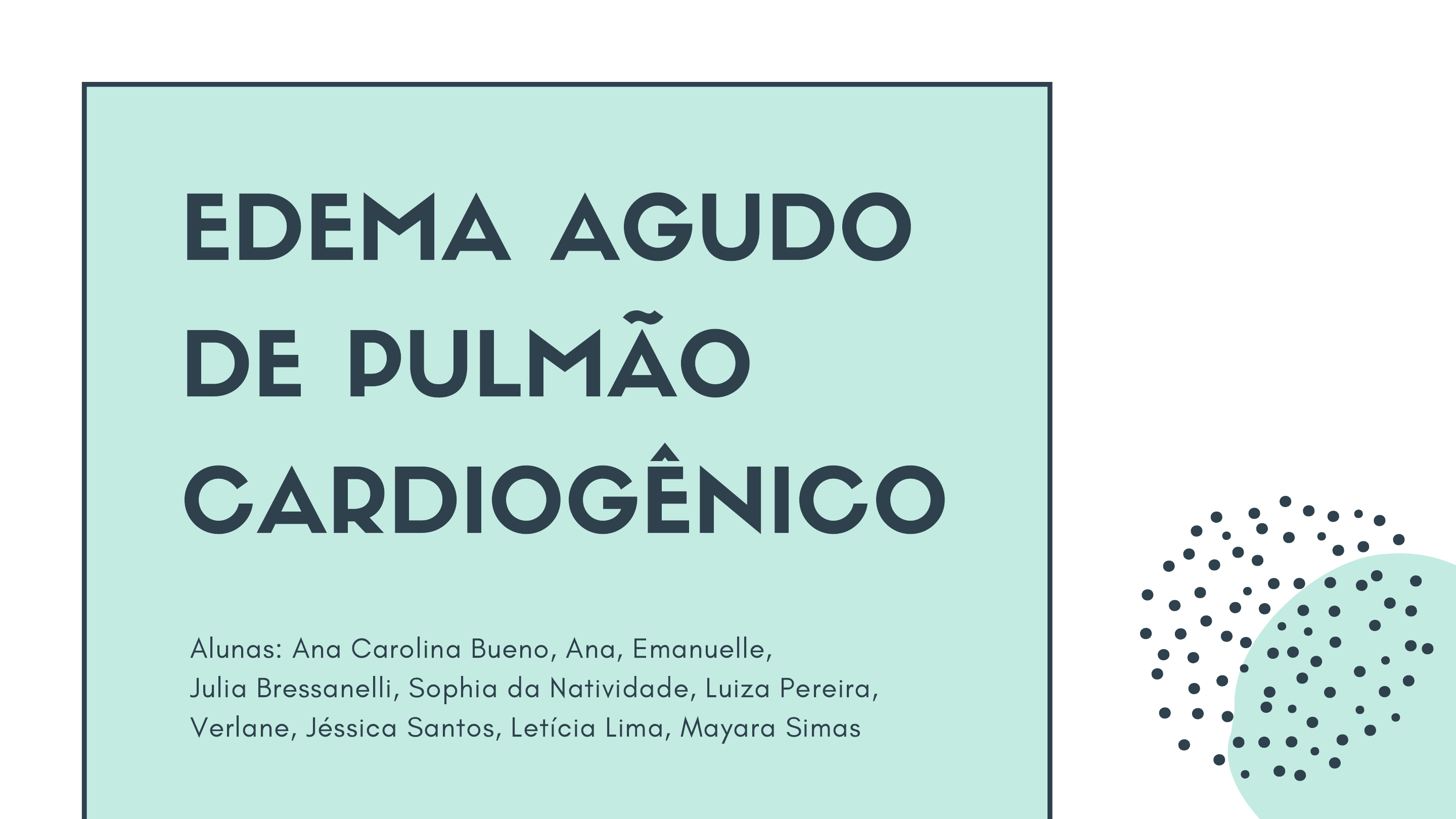 Alunas: Ana Carolina Bueno, Ana, Emanuelle, Julia Bressanelli, Sophia da Natividade, Luiza Pereira, Verlane, Jéssica Santos, Letícia Lima, Mayara Simas EDEMA AGUDO DE PULMÃO CARDIOGÊNICO O edema agudo de pulmão se caracteriza pelo acumulo súbito de fluído extravascular nos alvéolos pulmonares. É cardiogênico por originar-se devido ao aumento da pressão hidrostática nos capilares pulmonares, secundário à uma patologia cardíaca. Onde ocorre a congestão cardíaca, com especial impacto no átrio esquerdo, assim, sem as alterações na permeabilidade da membrana alvéolo-capilar, forma-se um transudado. Conceito Fisiopatologia O Edema Agudo de Pulmão (EAP) é uma síndrome clínica de insuficiência respiratória aguda hipoxemica, ele leva a diminuição da concentração dos níveis de oxigênio no sangue arterial, esta síndrome ocorre devido o fluxo aumentado de líquido. Os acontecimentos envolvidos podem variar com as doenças desencadeantes até que haja um aumento da pressão no átrio esquerdo que é transmitido pelas veias pulmonares aos capilares onde ocorre transudação de líquido para o interstício dos alvéolos. O edema pulmonar agudo é um acúmulo de líquido nos alvéolos, no espaço intersticial dos pulmões. Os alvéolos são sacos de ar dentro dos pulmões que servem para absorver o oxigênio do ar que se inala e remover o dióxido de carbono do sangue. O edema pulmonar cardiogênico divide-se em: Edema pulmonar com baixo débito cardíaco se o sangue bombeado pelo coração for reduzido e não suficiente para as necessidades do corpo. Edema pulmonar com alto débito cardíaco quando o músculo cardíaco bombeia muito sangue, mas não ele é suficiente porque o indivíduo tem doenças como: Anemia, fístulas entre as artérias e veias, excesso de hormôniostireoidianos no sangue (hipertireoidismo). Causas Insuficiência cardíaca congestiva A causa mais comum de EAP é a insuficiência cardíaca. Explicando a circulação cardiopulmonar para que este mecanismo fique compreensível: O lado esquerdo do coração é o responsável por bombear o sangue rico em oxigênio em direção ao corpo. Quando o lado esquerdo do coração torna-se fraco, ele passa a ter dificuldade para bombear adequadamente o sangue para o resto do corpo. Como é o lado esquerdo do coração o responsável por bombear o sangue vindo dos pulmões, a bomba cardíaca falha, há um congestionamento, provocando um acúmulo de sangue nos vasos pulmonares. Esta congestão causa um aumento da pressão sanguínea dentro dos vasos pulmonares, favorecendo o extravasamento de água I NFARTO AGUDO DO M IOCÁRD IO O infarto agudo do miocárdio (popularmente: ataque cardíaco), pode causar edema pulmonar caso haja necrose de uma grande área do músculo cardíaco do lado esquerdo do coração, levando a uma insuficiência cardíaca súbita. CR ISE H IPERTENS IVA O aumento da pressão arterial costuma ser uma frequente causa de edema agudo do pulmão. Em situações normais, o coração do paciente com insuficiência cardíaca moderada pode ainda ser capaz de bombear o sangue adequadamente. Porém, basta uma elevação súbita na pressão arterial para que haja um aumento na resistência ao fluxo do sangue, exigindo um maior trabalho do músculo cardíaco. OUTRAS CAUSAS - Problemas da tireoide (tireotoxicose) - Hipertensão arterial pulmonar - Endocardite (infecção das válvulas) - Insuficiência cardíaca esquerda ou direita - Arritmia cardíaca (batimentos cardíacos irregulares) - Cardiomiopatia dilatada - Mau funcionamento das válvulas do coração, por exemplo a estenose da válvula mitral - Doenças do coração congênitas (presentes no nascimento), por exemplo um defeito do septo atrioventricular ou buracos nas paredes entre as câmaras cardíacas. Estágio 1: Distensão e recrutamento de pequenos vasos pulmonares Estágio 2: Edema intersticial Estágio 3: Indução alvéolar O EAP cardiogênico se divide em 3 estágios: Estágios Distensão e recrutamento de pequenos vasos pulmonares Aumentam trocas gasosas e difusão de CO2 Ocorre apenas dispneia aos esforços O exame físico revela discretos Estertores inspiratórios por abertura das vias aéreas colabadas (colabar=sofrer colapso) Raio x - redistribuição da circulação Estágio 1: Edema intersticial ocorre compressão das vias aéreas menores Pode haver broncoespasmo reflexo Ateração da ventilação perfusão leva a hipoxemia proporcional a pressão capilar Taquipneia por estimulação dos receptores J (são terminações nervosas sensoriais localizadas dentro das paredes alveolares em justaposição com os capilares pulmonares do pulmão e são enervados por fibras do nervo vago) e de estiramento do interstício Raio x mostra borramento para-hilar e linhas de kerley(são linhas horizontais na periferia do pulmão que se estendem até a uperfície pleural) Estágio 2: Inundação alveolar Hipoxemia severa e hipocapnia ( é um estado de redução do CO2 no sangue) Em casos severos pode haver hipercapnia (é a presença de doses excessivas de CO2 no sangue.) Secreção rósea espumosa Estertores crepitantes em “maré montante” (Suspiros pulmonares que se originam da base e se espalham para o ápice do pulmão) Raio x mostra edema alveolar em “asa de borboleta” Estágio 3: Quadro clínico DISPNÉ IA INTENSA S IB I LOS ORTOPNE IA O diagnóstico do edema agudo pulmonar é clínico. O paciente pode apresentar alguns desses sintomas: SUDORESE TAQU ICARD IA TAQU IPNE IA H IPOVENT I LAÇÃO UT I L IZAÇÃO DE MUSCULATURA ACESSÓR IA H IPERTENSÃO OU H IPOTENSÃO CIANOSE TOSSE COM EXPECTORAÇÃO rósea (sanguinolenta) ou espumosa BRAD IPNE IA havendo risco elevado de parada cardiorrespiratória PRESSÃO ARTER IAL ELEVADA pela resposta adrenérgica aumentada Outros exames complementares serão direcionados para a causa mais provável, é desejável a realização de ecocardiograma com Doppler, tomografia de tórax e coronariografia é