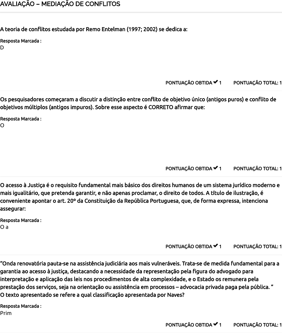 AVALIAÇÃO – MEDIAÇÃO DE CONFLITOS PONTUAÇÃO TOTAL: 1PONTUAÇÃO OBTIDA 1 A teoria de con�itos estudada por Remo Entelman (1997; 2002) se dedica a: Resposta Marcada : Descrição do con�ito, à análise de seus elementos e do seu modo de ser, ao desenvolvimento de métodos criadores de espaços para a aplicação de seus conhecimentos e ao desenvolvimento tecnológico realizado com apoio multidisciplinar. Para além da descrição e análise, procura abordar a administração dos con�itos, aqui entendida como a sua prevenção e gestão. PONTUAÇÃO TOTAL: 1PONTUAÇÃO OBTIDA 1 Os pesquisadores começaram a discutir a distinção entre con�ito de objetivo único (antigos puros) e con�ito de objetivos múltiplos (antigos impuros). Sobre esse aspecto é CORRETO a�rmar que: Resposta Marcada : O autor faz classi�cação em con�itos de objetivo único (soma zero) e de objetivos múltiplos (soma variável). Avalia que nos de soma variável é mais fácil a construção de soluções aplicáveis. Como é obvio, enquanto o con�ito de soma variável (objetivos mesclados) oferece uma rica gama de possibilidades de solução, através dos diversos métodos que denominamos de resolução, o con�ito de soma zero supõe sua terminação com a vitória de uma parte e a derrota da outra. PONTUAÇÃO TOTAL: 1PONTUAÇÃO OBTIDA 1 O acesso à Justiça é o requisito fundamental mais básico dos direitos humanos de um sistema jurídico moderno e mais igualitário, que pretenda garantir, e não apenas proclamar, o direito de todos. A título de ilustração, é conveniente apontar o art. 20º da Constituição da República Portuguesa, que, de forma expressa, intenciona assegurar: Resposta Marcada : O acesso ao direito e à tutela jurisdicional efetiva, demonstrando-se, a toda evidência, a relevância dessa garantia para a proteção dos direitos fundamentais. PONTUAÇÃO TOTAL: 1PONTUAÇÃO OBTIDA 1 “Onda renovatória pauta-se na assistência judiciária aos mais vulneráveis. Trata-se de medida fundamental para a garantia ao acesso à justiça, destacando a necessidade da representação pela �gura do advogado para interpretação e aplicação das leis nos procedimentos de alta complexidade, e o Estado os remunera pela prestação dos serviços, seja na orientação ou assistência em processos – advocacia privada paga pela pública. ” O texto apresentado se refere a qual classi�cação apresentada por Naves? Resposta Marcada : Primeira onda 17/05/2024, 14:18 Course Status – Faculdade Pós Graduação Uni Abeu https://ava.ead.abeu.edu.br/course-status/ 1/3 PONTUAÇÃO TOTAL: 1PONTUAÇÃO OBTIDA 1 “O acesso à justiça concebe, ainda, a representação dos interesses difusos, que perfazem a segunda onda. Esse movimento envolve os direitos coletivos que divergem dos direitos dos menos favorecidos, por estes serem de caráter individualista. Esta onda, exigirá intensas transformações no sistema processual decorrente do surgimento dos con�itos de natureza pública, onde a legitimidade para proteção é plural. Não poderia ser diferente, pois em sua maior parte exige uma série de conhecimentos, muito além da seara jurídica que pode comprometer a atuação de órgãos públicos e seus membros – capacitação de�ciente. ” O texto apresentado se refere a qual classi�cação apresentada por Naves? Resposta Marcada : Segunda onda PONTUAÇÃO TOTAL: 1PONTUAÇÃO OBTIDA 1 A __________ do CPC aos princípios e garantias constitucionais, sobretudo aos do amplo acesso à justiça, da e�ciência, da razoável duração do processo e do contraditório é, certamente, uma das mais relevantes __________, tornando sistema jurídico mais acessível, célere e e�ciente e estimulando a solução amigável dos litígios diante dos fatores que os di�cultam como a cultura __________ brasileira e a crise do judiciário, com os métodos da conciliação, mediação e arbitragem. Trata-se de sistema __________ aos quais as partes são direcionadas de acordo com a particularidade de cada caso para melhor adequação. Assinale a a�rmativa que complementa o texto corretamente: Resposta Marcada : Adequação; inovações; litigiosa; amplo. PONTUAÇÃO TOTAL: 1PONTUAÇÃO OBTIDA 1 Poderá atuar como mediador judicial a pessoa capaz, graduada há pelo menos dois anos em curso de ensino superior de instituição reconhecida pelo Ministério da Educação e que tenha obtido capacitação em escola ou instituição de formação de mediadores, reconhecida pela Escola Nacional de Formação e Aperfeiçoamento de Magistrados – ENFAM ou pelos tribunais, observados os requisitos mínimos estabelecidos pelo Conselho Nacional de Justiça em conjunto com o Ministério da Justiça. Podemos concluir que a a�rmativa é: Resposta Marcada : VERDADEIRA PONTUAÇÃO TOTAL: 1PONTUAÇÃO OBTIDA 1 Tratando-se de mediação extrajudicial, a escolha do mediador compete: Resposta Marcada : As partes, podendo ser feita ainda em cláusula contratual, conforme art. 22, III, da Lei 13.140/15. Não havendo previsão contratual, a parte convidada o escolherá entre lista de 5 nomes. Não o fazendo, o primeiro nome será considerado. 17/05/2024, 14:18 Course Status – Faculdade Pós Graduação Uni Abeu https://ava.ead.abeu.edu.br/course-status/ 2/3 10 / 10 PONTUAÇÃO TOTAL: 1PONTUAÇÃO OBTIDA 1 “Deve alcançar todas as informações produzidas na mediação, seja em reuniões conjuntas ou privadas. Também diz respeito à segurança para explanar os problemas sem omitir detalhes que poderiam ser importantes à resolução. Entretanto, tal princípio comporta exceções, como no caso de cometimento de crime de ação penal pública incondicionada no decorrer da composição, caso em que deverá ser comunicado o fato à autoridade policial. Também, por renúncia das próprias partes, visto que há a possibilidade de a mediação e torne objeto de estudo acadêmico, bastando que seja dada previa