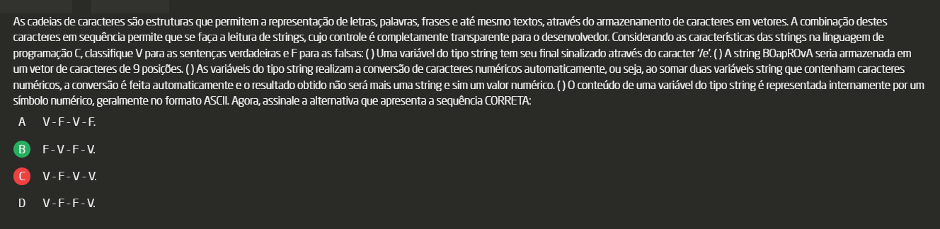 As cadeias de caracteres são estruturas que permitem a representação de letras, palavras, frases e até mesmo textos, através do armazenamento de caracteres em vetores. A combinação destes caracteres em sequência permite que se faça a leitura de strings, cujo controle é completamente transparente para 0 desenvolvedor. Considerando as características das strings na linguagem de programação C, classifique V para as sentenças verdadeiras e F para as falsas: ( ) Uma variável do tipo string tem seu final sinalizado através do caracter ( ) A string BOapROvA seria armazenada em um vetor de caracteres de 9 ( ) As variáveis do tipo string realizam a conversão de caracteres numéricos automaticamente, ou seja, ao somar duas variáveis string que contenham caracteres numéricos, a conversão é feita automaticamente e resultado obtido não será mais uma string e sim um valor numérico. ( ) conteúdo de uma variável do tipo string é representada internamente por um símbolo numérico, geralmente no formato ASCII. A V-F-V-F B V-F-V-V D V-F-F-V