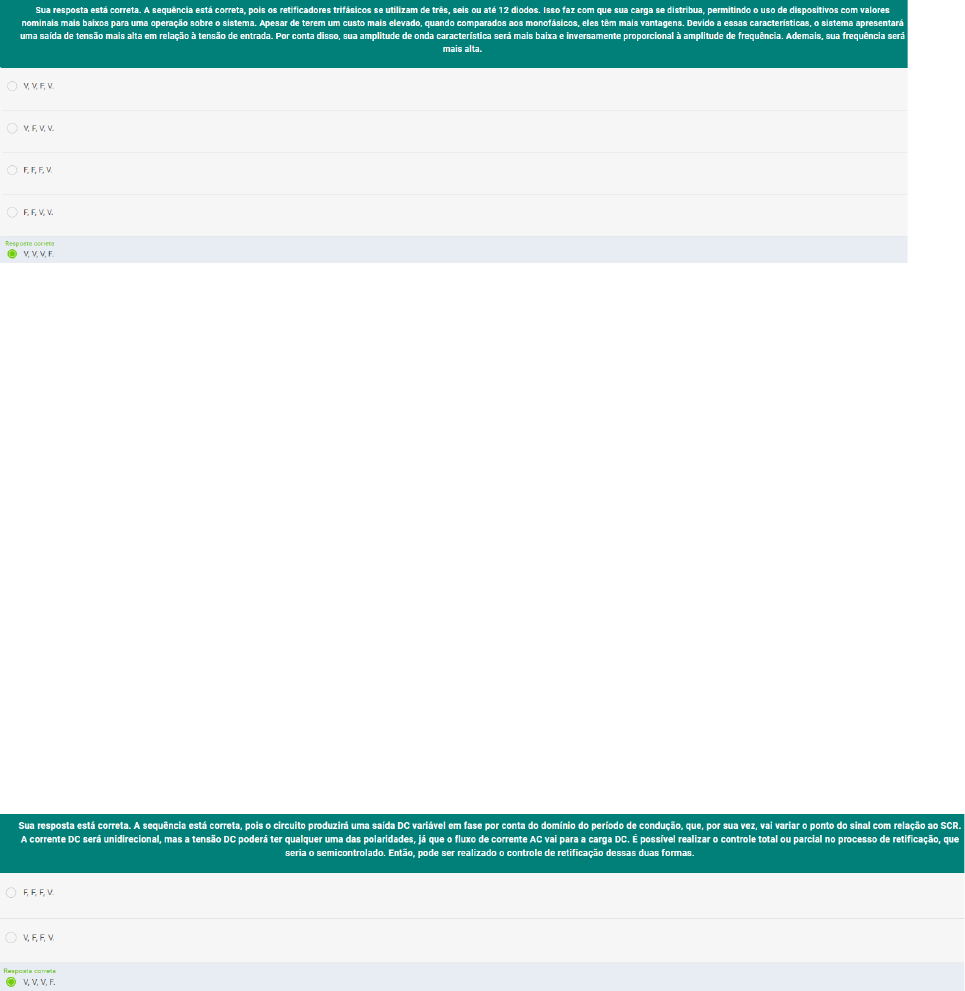 Os circuitos retificadores monofásicos são de confecção um pouco mais simples, especialmente quando comparados aos circuitos retificadores trifásicos. Eles possuem uma capacidade de potência limitada e geram uma ondulação significativa na tensão de saída DC. Com relação aos circuitos retificadores trifásicos, leia e analise as afirmativas a seguir. Depois, assinale V para Verdadeiro e F para Falso. ( ) A tensão de saída será mais alta em relação à tensão de entrada. ( ) Os circuitos trifásicos possuem uma amplitude mais baixa. ( ) A frequência de ondulação será mais alta. ( ) Os circuitos trifásicos possuem uma eficiência mais baixa. Agora, assinale a alternativa que apresenta a sequência correta: Para se projetar um retificador controlado, é necessário substituir o diodo por um outro dispositivo de potência, como um TBJ, um IGBT ou um SCR, como acontece na grande maioria das vezes. Esses dispositivos entram em condução quando um sinal entra em um determinado terminal. Com relação aos dispositivos utilizados para controlar um retificador, leia e analise as afirmativas a seguir. Depois, assinale V para Verdadeiro e F para Falso. ( ) O circuito com SCRs produz uma tensão de saída DC variável, cuja amplitude é obtida por meio de controle de fase. ( ) Um SCR não conduzirá de maneira automática quando a tensão ânodo-cátodo ficar positiva. ( ) Os retificadores controlados ou conversores são classificados em dois tipos: completamente controlados ou semicontrolados. ( ) A polaridade da tensão DC de saída e a direção da corrente não podem mudar, dessa forma, o fluxo de potência ocorrerá da fonte de carga DC para a fonte de tensão AC. Agora, assinale a alternativa que apresenta a sequência correta: Quando queremos aplicações de alta potência, é desejável o uso de retificadores trifásicos, pois eles propiciam uma saída DC com um menor índice de ondulação, se comparados aos circuitos monofásicos. Isso minimiza o uso de filtros de alta potência, já que o próprio circuito trabalha nessa faixa de alta potência. Fonte: Adaptada de Rashid (2014, p. 85). #PraCegoVer: a figura mostra um transformador, em que o enrolamento primário é ligado em Δ, e o secundário, em Y. Cada um dos três terminais do secundário do trafo será conectado ao ponto central entre dois diodos, o que performa uma ponte com seis diodos conectados a uma carga resistiva. Com relação aos circuitos retificadores trifásicos, assinale a alternativa correta: Um dado retificador de onda completa em ponte se encontra com uma alimentação de entrada por uma fonte de 150 V. O circuito possui um valor de resistência de 10 Ω, utilizando um ângulo de disparo de 30°. Assim, determine o valor da corrente rms sobre a carga e, depois, assinale a alternativa que corresponde corretamente ao valor da tensão média sobre a carga. Os diodos de roda livre são amplamente empregados, e sua função principal é fazer com que a corrente não venha a crescer da mesma forma que a tensão quando o semiciclo positivo atuar sobre a forma de onda dentro do circuito, pois é fornecido um caminho alternativo para a energia. Sobre os diodos de roda livre, assinale a alternativa correta: Os diodos utilizados no processo de retificação são dispositivos semicondutores que permitem a passagem de corrente elétrica por um único sentido de operação. Durante o semiciclo positivo, a tensão no ânodo será positiva em relação ao cátodo, fazendo com que o diodo apresente o estado ligado de operação. Com relação ao sentido de operação do diodo em retificadores de meia-onda, leia e analise as afirmativas a seguir: I. A tensão da fonte é uma onda senoidal com valor máximo (). Quando a corrente passa pelo cátodo do diodo, isso faz com que a corrente flua até a resistência. II. Durante o semiciclo negativo, a tensão no ânodo torna-se negativa em relação ao cátodo, e o diodo passa para o estado desligado. III. Não há fluxo de corrente sobre o resistor quando o diodo se encontra desligado. IV. O semiciclo referente a retificação não está conectado ao sentido de operação do diodo. É correto o que se afirma em: A retificação é o processo de converter a tensão e a corrente em forma alternada para forma contínua. Um sinal de corrente alternada é constituído de um sinal senoidal. A retificação desse sinal pode se dar por meio de diodos como elementos de retificação. Nesse sentido, leia e analise as afirmativas a seguir: I. Dentro da análise trigonométrica, uma forma de onda senoidal pode estar presente nos quatro quadrantes e ser representada em semiciclos. II. A retificação por diodos ocorre quando realizamos a retificação de um sinal, e essa retificação não é controlada. III. A amplitude da tensão de saída DC (sinal contínuo) será pura logo após a retificação do sinal alternado AC. IV. A retificação controlada não ocorre com o uso de diodos. É correto o que se afirma em: Considere um circuito retificador controlado de meia-onda, o qual é alimentado com uma tensão alternada em sua entrada de 100 V ligada a uma carga resistiva de 25 Ω. Com base nisso, determine o ângulo de disparo, sabendo que o circuito fornece uma potência de saída sobre a carga de 75 W. Depois, assinale a alternativa correta referente ao valor do ângulo de disparo. A finalidade de um retificador é converter a potência AC em potência DC. Adotando um retificador de meia-onda, cuja fonte de tensão AC é de 100 V, uma vez que estamos adotando que os dispositivos são ideais, encontra-se conectada a uma carga resistiva de 75 Ω. Assinale a alternativa que corresponda ao valor da corrente rms sobre a carga apresentada. Para circuitos retificadores de onda completa controlados com terminal (tap) central monofásico que utiliza uma carga resistiva, no controle de fase, com relação à alimentação AC positiva e negativa, é possível atingir novos parâmetros de con