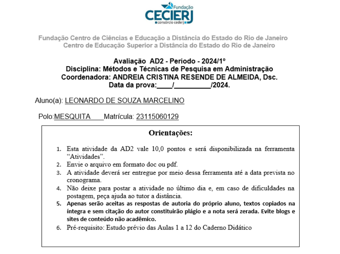 QUESTÃO 1 (4 PONTOS) Imagine que você, graduando em Administração EAD pelo consórcio CEDERJ, tem um BLOG em que o tema principal é Métodos de Pesquisa em Administração e resolve postar um texto dissertativo, de no máximo 12 linhas, descrevendo as técnicas de coletas de dados e tipos de fontes que qualquer estudante poderá utilizar para preparar uma pesquisa. OBSERVAÇÃO: a. Em sua elaboração, leve em consideração o que você estudou nas aulas 10, 11 e 12. b. Adeque seu texto à norma culta, embora saiba que o uso da linguagem coloquial é permitido. Na pesquisa de Administração, utililizamos diferentes métodos para compreender melhor as organizações e seus desafios, existem técnicas de coleta de dados e diversas fontes que são ótimos para se preparar uma pesquisa. Com relação a coleta de dados pode-se utilizar Pesquisa questionário, esse tipo de coleta possui alguns pontos positivos como economia, uniformidade, anonimato, respostas mais complexas, facilidade em exame, filtragem das perguntas. Observações diretas, a finalidade dessa pesquisa é obter mais conhecimento, suas vantagesn são instrumentos não reativos e economia de tempo e dinheiro, Elaboração de instrumentos de pesquisa, as suas vantagens são ajuda direta do pesquisador com a possibilidade de formular perguntas mais complexas. E com relação as fontes de pesquisa pode-se utilizar biblioteca, fontes privadas ou oficias (arquivos , relatórios, estatísticas direta ou indiretamente pertinentes , referindo-se á instituição ou á situação estudadas. QUESTÃO 2 (6 PONTOS) Responda as questões abaixo: a) O início da pesquisa surge de uma necessidade de resposta. No emaranhado de dúvidas, você começa a deixar claro o que deseja alcançar. Começa aí a definição do tema. Segundo o professor Gil (2000), o tema ideal em uma pesquisa, isto é, aquele cujo desenvolvimento tem maior probabilidade de alcançar bons resultados, deve atender a três critérios: atende ao gosto, à aptidão e ao tempo do pesquisador, é relevante para uma sociedade, para uma ciência ou para a escola, sobre ele é possível obter dados. A luz da afirmação, escreva o seu tema de pesquisa para o seu trabalho final da disciplina de MTPA, que corresponde ao seu projeto final de pesquisa, faça a delimitação do tema e apresente o problema de pesquisa. Lembre-se que se trata de um projeto de trabalho de conclusão de curso de graduação, para que seu tema seja bem delimitado. b) Escolhido o tema, devem-se buscar as fontes bibliográficas a respeito do assunto para uma primeira análise exploratória e para familiarizar-se com o assunto. Essa primeira leitura permitirá esclarecer os aspectos centrais e os secundários na delimitação do assunto a ser pesquisado. Sendo assim, e ainda tendo em vista seu projeto final da disciplina de MTPA, faça duas indicações de referência bibliográfica (autores de livros ou artigos científicos – não utilize como fonte blogs ou outra fonte não confiável) conforme as normas da ABNT e faça uma citação direta literal do(s) autor(es) que utilizou como exemplo de referência bibliográfica. c) A um profissional (administrador) em início de carreira foi dado como tarefa pesquisar sobre o empreendedorismo feminino. Como ele deve proceder para delimitar o assunto? A partir do momento que o administrador delimitou o assunto, elabore uma justificativa para ele. image1.png