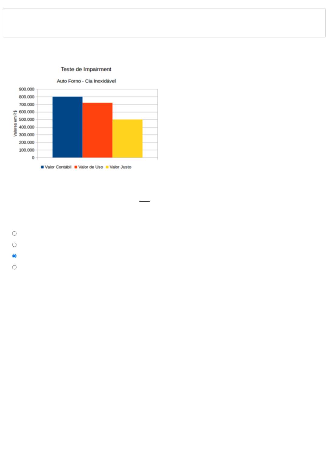 08/03/2024, 20:55 Teste 2 | avaead-unisanta https://avaead.unisanta.br/mod/quiz/attempt.php?attempt=698115&cmid=372047 1/7 Questão 1 Ainda não respondida Vale 1,00 ponto(s). Observe o Gráfico a seguir e reflita A empresa Auto Forno apresenta Gráfico de Teste de Impairment, apresentando níveis de análise de Valor Contábil, Valor de Uso e Valor Justo. Fonte: CARVALHO, Alexandro Farias. Contabilidade Societária. Núcleo de Educação a Distância UNISANTA. (Material didático). Com relação ao Gráfico apresentado assinale a alternativa que NÃO corresponde com a verdade. Escolha uma opção: O Valor Contábil é igual a R$ 800.000,00 O Valor Justo é igual a R$ 500.000,00 Os Valores de Uso corresponde exatamente a metade do Valor Contábil O Valor de Uso está entre o Valor Contábil e o Valor Justo Limpar minha escolha 08/03/2024, 20:55 Teste 2 | avaead-unisanta https://avaead.unisanta.br/mod/quiz/attempt.php?attempt=698115&cmid=372047 2/7 Questão 2 Ainda não respondida Vale 1,00 ponto(s). Questão 3 Ainda não respondida Vale 1,00 ponto(s). Segundo o Pronunciamento Técnico CPC 46 – Mensuração do Valor Justo é o preço que seria recebido pela venda de um ativo ou que seria pago pela transferência de um passivo em uma transação não forçada entre participantes do mercado na data da mensuração. A fim de aumentar a consistência e a comparabilidade nas mensurações do valor justo e nas divulgações correspondentes, o CPC 46 estabelece uma hierarquia de informações de valor justo Considerando ocontexto Dados Observáveis no Valor Justo, avalie as asserções a seguir e a relação proposta entre elas. I. Informações que são desenvolvidas utilizando-se dados de mercado, tais como informações disponíveis publicamente sobre eventos ou transações reais. PORQUE: II. Essas informações refletem as premissas que participantes do mercado utilizariam ao precificar o ativo ou o passivo” Fonte: CARVALHO, Alexandro Farias. Contabilidade Societária. Núcleo de Educação a Distância UNISANTA. (Material didático). A respeito dessas asserções, assinale a opção correta com relação a verdade Escolha uma opção: As asserções I e II são proposições verdadeiras e não se complementam A asserção I é verdadeira e a II é falsa As asserções I e II são proposições verdadeiras, e a proposição II complementa a I As asserções I e II são proposições falsas e não se complementam Limpar minha escolha Valor justo é o preço que seria recebido pela venda de um ativo ou pago pela transferência de um passivo em uma transação não forçada no MERCADO PRINCIPAL na data de mensuração nas condições atuais de mercado (ou seja, preço de saída), independentemente de esse preço ser diretamente observável ou estimado utilizando-se outra técnica de avaliação. Tendo por base o contexto de Mercado Principal, leia as assertivas e verifique a sua relação com a verdade: I. É o mercado com o maior volume e nível de atividade para o ativo ou passivo. II. É aquele que maximiza o valor recebido para vender o ativo ou que minimiza o valor pago para transferir o passivo, após levar em consideração os custos de transação e transporte. III. É o mercado que detém parte integrante dos diferentes processos por meio dos quais se transfere a propriedade dos bens e serviços. IV. É o mercado que executa uma função de alocação (destinação) de recursos de capital, trabalho e terra. Fonte: CARVALHO, Alexandro Farias. Contabilidade Societária. Núcleo de Educação a Distância UNISANTA. (Material didático). Qual alternativa a seguir apresenta a correta relação com a verdade Escolha uma opção: Somente a afirmativa IV está CORRETA Somente a afirmativa II está CORRETA Somente a afirmativa I está CORRETA Somente a afirmativa III está CORRETA Limpar minha escolha 08/03/2024, 20:55 Teste 2 | avaead-unisanta https://avaead.unisanta.br/mod/quiz/attempt.php?attempt=698115&cmid=372047 3/7 Questão 4 Ainda não respondida Vale 1,00 ponto(s). Questão 5 Ainda não respondida Vale 1,00 ponto(s). O mercado mais vantajoso é o que maximiza o valor que seria recebido na venda do ativo ou que minimiza o valor a ser pago pela transferência do passivo, após serem deduzidos os custos de transação e custos de transporte. Nesse contexto, leia as afirmativas a seguir e a sua relação com os aspectos que podem ser verificados no Mercado mais Vantajoso, classificando as assertivas como “V” para Verdadeiro e “F” para Falso: ( ) É o mercado que executa uma função de alocação (destinação) de recursos de capital, trabalho e terra. ( ) É o mercado com o maior volume e nível de atividade para o ativo ou passivo. ( ) É aquele que maximiza o valor recebido para vender o ativo ou que minimiza o valor pago para transferir o passivo, após levar em consideração os custos de transação e transporte. ( ) É o mercado que detém parte integrante dos diferentes processos por meio dos quais se transfere a propriedade dos bens e serviços. Fonte: CARVALHO, Alexandro Farias. Contabilidade Societária. Núcleo de Educação a Distância UNISANTA. (Material didático). Assinale a opção CORRETA, com relação à ordem de Verdadeiros (V) e Falsos (F) encontrada Escolha uma opção: (V) – (F) – (F) – (V). (F) – (F) – (V) – (F). (F) – (V) – (V) – (F). (F) – (F) – (V) – (V). Limpar minha escolha O objetivo do CPC 46 é definir valor justo e estabelecer em um único Pronunciamento que estrutura para a mensuração do valor justo e estabelece divulgações sobre suas mensurações. Tendo por base o contexto Do CPC 46 que aborda tipos de técnicas de avaliação, leia as assertivas a seguir e reflita sobre a sua relação com a verdade: I. Abordagem de Mercado. II. Abordagem Cambial. III. Abordagem de Custo. IV. Abordagem Tributária. V. Abordagem de Receita. Fonte: CARVALHO, Alexandro Farias. Contabilidade Societária. Núcleo de Educação a Dis