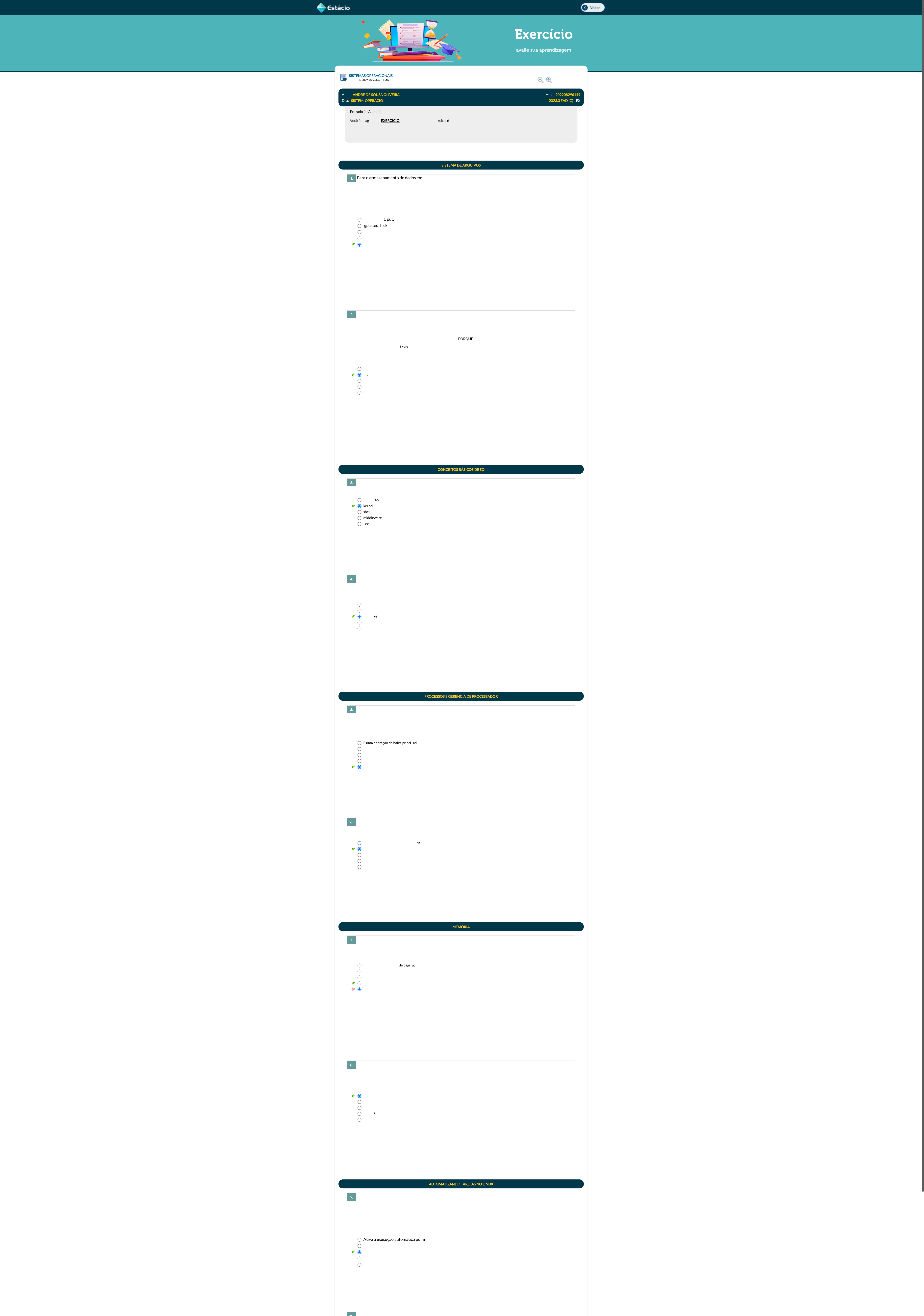18/10/2023, 15:01 Estácio: Alunos https://simulado.estacio.br/alunos/ 1/1 Exercício avalie sua aprendizagem Para o armazenamento de dados em partições Linux, um disco precisa ser particionado. Depois as partições precisam ser formatadas e posteriormente montadas. Somente após a conclusão destes 3 processos o sistema de arquivos poderá ser acessado pelos processos do sistema. Os comandos do Linux que podem ser utilizados, respectivamente, para particionamento, formatação e montagem de sistema de arquivos são: (UFBA/2014 - adaptada) Em um sistema operacional a identi�cação de um arquivo é de suma importância para a recuperação e armazenamento da informação. Nesse sentido, avalie as asserções a seguir e a relação proposta entre elas. I -Em um sistema operacional, o nome do arquivo geralmente é composto por duas partes: o nome propriamente dito e a extensão do arquivo. Essas duas partes são separadas por um ponto, que é um caracter especial utilizado para identi�car a extensão do arquivo.. PORQUE II - Num sistema operacional existem diversos tipos do arquivo, sendo um exemplo de extensão de arquivo o "�le.txt" que de�ne arquivos do tipo executável. Marque a alternativa que apresenta a relação correta entre as asserções I e II. (SELECON/2021 - Adaptada) Sistema operacional é de�nido com um conjunto de programas que faz a comunicação entre os componentes do hardware, gerenciando e distribuindo os recursos e os demais softwares, criando uma plataforma comum a todos os programas utilizados. No que diz respeito à terminologia e aos fundamentos utilizados, o núcleo de um sistema operacional é conhecido por: O Linux é um sistema operacional de código aberto amplamente utilizado por engenheiros de redes, e que preza pela e�ciência e robustez. Ao longo dos anos a comunidade desenvolveu e disponibilizou diferentes versões para utilização como, por exemplo, o Ubuntu uma distribuição popular baseada no Debian. Essas versões são conhecidas como: Um subprocesso é uma instância separada de execução criada por um processo existente. Ele herda muitas propriedades do processo pai, mas opera de forma independente. A habilidade de criar e gerenciar subprocessos é fundamental para muitos sistemas e aplicações modernas, permitindo paralelismo e modularidade. O que é um subprocesso? O Bloco de Controle de Processo (BCP) é uma estrutura vital em sistemas operacionais que permite a multitarefa, garantindo que todos os processos sejam gerenciados de maneira justa e e�ciente. Qual é o propósito do Bloco de Controle de Processo (BCP) no Linux? Concurso: INMETRO - 2010 - Edital 01-2010 | Prova: CESPE - 2010 - INMETRO - Pesquisador - Ciência da Computação Em um sistema operacional que implementa a gerência de memória, por meio de um sistema de paginação por demanda, observou-se que, durante a execução de um processo, a utilização da CPU é 20%, do disco de paginação 75% e dos demais dispositivos de E/S 5%. Assinale a opção que otimiza a utilização da CPU. (Instituto Consulplan/2022 - Adaptada) Sistemas operacionais são tipos de software que têm a função primordial de ser a base para o funcionamento de computadores e, consequentemente, a manipulação por parte dos usuários. A memória RAM é um item de hardware que possui tamanho limitado, enquanto os processos executados, muitas vezes, ultrapassam o limite de tamanho proporcionado por esse componente. Para que o computador consiga lidar com esse cenário, é necessário que os processos permaneçam em disco, sendo carregados dinamicamente para a memória, possibilitando que sejam executados somente quando necessário. Um dos métodos utilizados para realizar o processo de gerenciamento de memória é: Ao desenvolver um SCRIPT, seu responsável utilizou o comando abaixo: $ chmod u+x script Sobre esse comando, é correto a�rmar que: Dos comandos abaixo qual permite alterar a con�guração de CRONTAB do usuário? SISTEMAS OPERACIONAIS Lupa ARA1386_202208296149_TEMAS Aluno: ANDRÉ DE SOUSA OLIVEIRA Matr.: 202208296149 Disc.: SISTEM. OPERACIO 2023.3 EAD (G) / EX Prezado (a) Aluno(a), Você fará agora seu EXERCÍCIO! Lembre-se que este exercício é opcional, mas não valerá ponto para sua avaliação. O mesmo será composto de questões de múltipla escolha. Após responde cada questão, você terá acesso ao gabarito comentado e/ou à explicação da mesma. Aproveite para se familiarizar com este modelo de questões que será usado na sua AV e AVS. SISTEMA DE ARQUIVOS 1. part, format, put. gparted, fsck e du. df, frmt e ls. ln, mkswap e link. fdisk, mkfs e mount. Data Resp.: 18/10/2023 14:57:57 Explicação: A resposta correta é: fdisk, mkfs e mount. Em um terminal, podemos realizar o particionamento de discos através do comando fdisk, programa padrão para sistemas Linux. Para formatar partições usamos o comando mkfs e para montagem de sistema de arquivos o comando mount. 2. Ambas as asserções são falsas. A asserção I é verdadeira e a asserção II é falsa. Ambas as asserções são verdadeiras, e a asserção II é uma justi�cativa para a asserção I. Ambas as asserções são verdadeiras, mas a asserção II não é uma justi�cativa para a asserção I. A asserção I é falsa e a asserção II é verdadeira. Data Resp.: 18/10/2023 14:58:42 Explicação: Em alguns sistemas operacionais, o nome do arquivo é composto por duas partes separadas com um ponto. A parte após o ponto é denominada extensão do arquivo e tem como �nalidade identi�car seu conteúdo. No sistema operacional, a extensão do arquivo é uma parte importante do nome do arquivo, pois indica o tipo ou formato do arquivo. Por exemplo, a extensão ".txt" é comumente associada a arquivos de texto simples. CONCEITOS BÁSICOS DE SO 3. bootstrap kernel shell middleware Socket Data Resp.: 18/10/2023 14:59:00 Explicação: O núcleo, também conhecido como kernel, é o componente central d