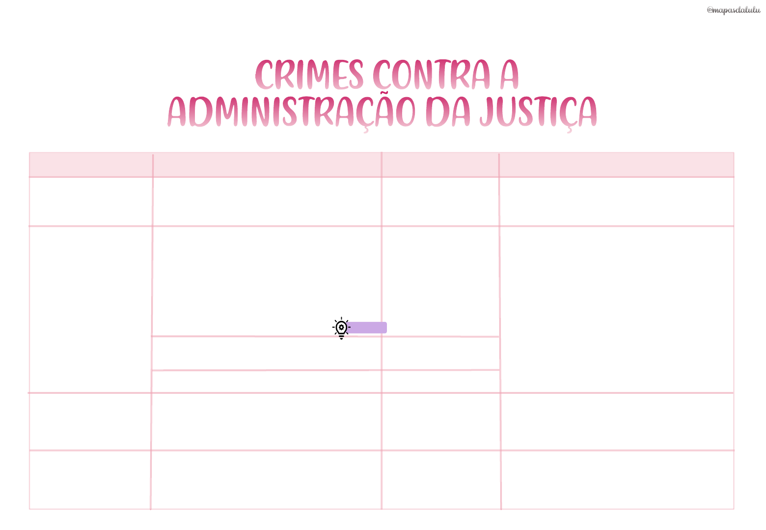 TIPO PENAL CONDUTA PENA OBSERVAÇÕES IMPORTANTES Reingresso de estrangeiro expulso Reingresso no território nacional de estrangeiro expulso Sem prejuízo de nova expulsão, após o cumprimento da pena Denunciação caluniosa Dar causa à instauração de: inquérito policial, de procedimento investigatório criminal, de processo judicial, de processo administrativo disciplinar, de inquérito civil ou de ação de improbidade administrativa contra alguém, imputando-lhe crime, infração ético-disciplinar ou ato ímprobo de que o sabe inocente É crime material O agente quer prejudicar a vítima. O crime efetivamente ocorreu. Comunicação falsa de crime ou contravenção Provocar a ação de autoridade, comunicando-lhe a ocorrência de crime ou de contravenção que sabe não se ter verificado Acusar-se, perante a autoridade, de crime inexistente ou praticado por outrem Autoacusação falsa de crime Reclusão (1 a 4 anos) Reclusão (2 a 8 anos) e multa Detenção (1 a 6 meses) ou multa O crime não ocorreu. A comunicação perante autoridades militares não configura este crime. Detenção (3 meses a 2 anos) ou multa Se o agente se serve de anonimato ou de nome suposto Aumentada de 1/6 Se a imputação é de contravenção Diminuída de metade )Exige que o procedimento seja instaurado( Não pratica crime quem assume sozinho a prática de crime do qual participou. O objeto não pode ser contravenção penal NOVIDADE! crimes contra a administração da justiça TIPO PENAL CONDUTA PENA OBSERVAÇÕES IMPORTANTES Falso testemunho ou falsa perícia Fazer afirmação falsa ou negar/calar a verdade como: Deixa de ser punível se, antes da sentença no processo em que ocorreu o ilícito, o agente se retrata ou declara a verdade. É crime próprio É crime de mão própria. Falso testemunho: só cabe participação. Falsa perícia: cabe coautoria e participação )Só pelas pessoas citadas( Aumentada de 1/6 a 1/3 Corrupção ativa de testemunha, contador, perito, intérprete ou tradutor Prometer, oferecer ou dar dinheiro ou qualquer outra vantagem a: Reclusão (3 a 4 anos) e multa Exige o dolo específico. Crime formal Coação no curso do processo Usar de violência/grave ameaça para favorecer interesse público ou alheio contra: Reclusão (1 a 4 anos) e multa + pena da violência Exige o dolo específico. Se consuma quando a coação é exercida Se mediante suborno ou para obter prova destinada a produzir efeito em: Reclusão (2 a 4 anos) e multa • Testemunha • Tradutor • Perito • Contador • Processo judicial ou administrativoEm: • Intérprete • Inquérito policial • Juízo arbitral • Processo penal • Processo civil em que for parte a Administração Pública Direta ou Indireta • Testemunha • Tradutor• Perito • Contador • Intérprete Para fazer afirmação falsa/negar/calar a verdade Se para obter prova para produzir efeito em processo penal ou processo civil em que for parte a Administração Pública Aumentada de 1/6 a 1/3 • Outro que intervenha• Autoridade • Parte • Processo judicial ou administrativoEm: • Inquérito policial • Juízo arbitral + Não importa se a vítima cede à exigência ou se sente ameaçada( ) crimes contra a administração da justiça TIPO PENAL CONDUTA PENA OBSERVAÇÕES IMPORTANTES Exercício arbitrário das próprias razões Fazer justiça com as próprias mãos para satisfazer pretensão, embora legítima, salvo quando a lei o permita Detenção (15 dias a 1 mês) ou multa + pena da violência Se não há emprego de violência, só se procede mediante queixa. É fundamental que a pretensão seja legítima Fraude processual Inovar artificiosamente estado de lugar, coisa ou pessoa para induzir a erro o juiz ou perito em processo civil/administrativo Favorecimento pessoal Auxiliar a subtrair-se à ação de autoridade pública autor de crime a que é cominada pena de reclusão Detenção (1 a 6 meses) e multa Se não é cominada pena de reclusão Detenção (15 dias a 3 meses) e multa Favorecimento real Se o agente que presta o auxílio também participou do crime não há favorecimento pessoal. O auxílio deve ter sido eficaz Prestar ao criminoso auxílio destinado a tornar seguro o proveito do crime, fora dos casos de coautoria ou receptação Detenção (1 a 6 meses) e multa Exercício arbitrário ou abuso de poder Ordenar ou executar medida privativa de liberdade individual, sem as formalidades legais ou com abuso de poder Detenção (3 meses a 2 anos) e multa Isento de pena Detenção (1 mês a 1 ano) + Se em processo penal Em dobro Se quem presta auxílio é ascendente, descendente, cônjuge ou irmão do criminoso Se o agente que presta o auxílio também participou do crime não há favorecimento real. Se o agente adquire o proveito do crime, responde por receptação. É crime formal crimes contra a administração da justiça TIPO PENAL CONDUTA PENA OBSERVAÇÕES IMPORTANTES Fuga de pessoa presa ou submetida a medida de segurança Promover/facilitar a fuga de pessoa legalmente presa ou submetida a medida de segurança detentiva Detenção (6 meses a 2 anos) Somente por funcionário público Se praticado à mão armada, ou por mais de uma pessoa, ou mediante arrombamento Evasão mediante violência contra a pessoa Em caso de culpa do funcionário público incumbido da custódia ou guarda Detenção (3 meses a 1 ano) ou multa Evadir-se (ou tentar) o preso/indivíduo submetido a medida de segurança detentiva usando de violência contra a pessoa Detenção (3 meses a 1 ano) + pena da violência Arrebatamento de preso Arrebatar preso do poder de quem o tenha a fim de maltratá-lo. Reclusão (1 a 4 anos) + pena da violência Motim de presos Amotinarem-se presos, perturbando a ordem ou disciplina da prisão Reclusão (2 a 6 anos) Detenção (6 meses a 2 anos) + pena da violência Se praticado por pessoa sob cuja custódia ou guarda está o preso/internado Reclusão (1 a 4 anos) Exige o dolo específico Se há emprego de 