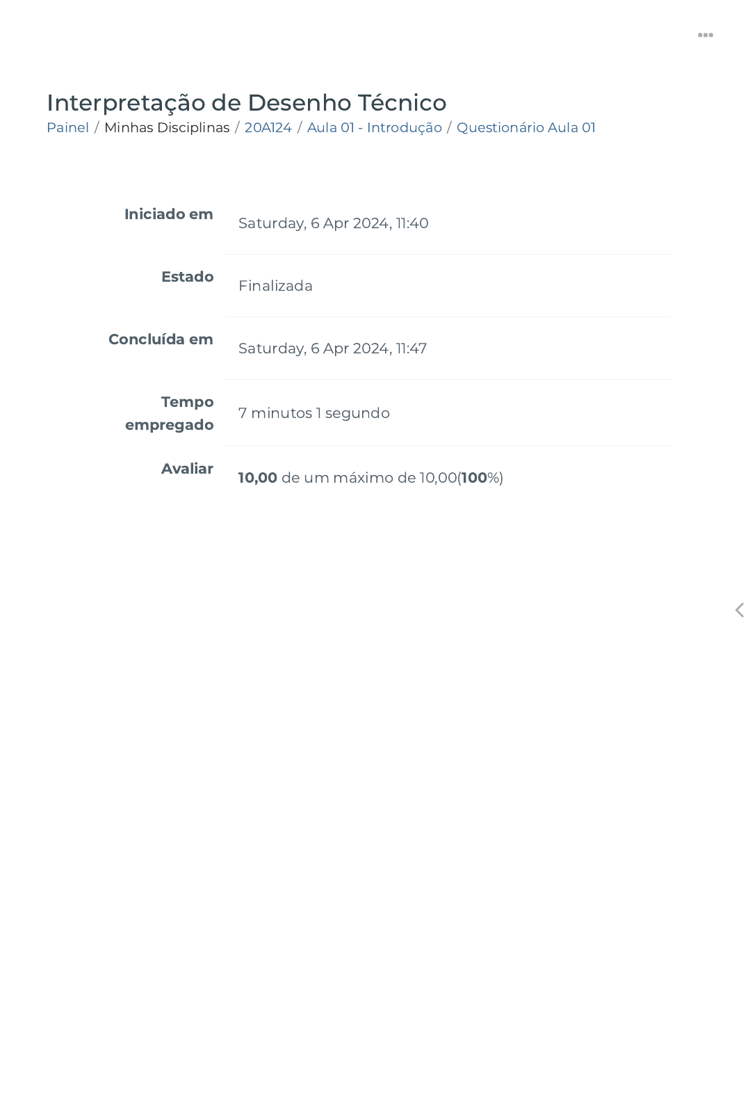 06/04/2024, 11:47 Questionário Aula 01 https://ava.politecnicabr.com.br/mod/quiz/review.php?attempt=6579725 1/6 Painel / Minhas Disciplinas / 20A124 / Aula 01 - Introdução / Questionário Aula 01 Interpretação de Desenho Técnico Iniciado em Saturday, 6 Apr 2024, 11:40 Estado Finalizada Concluída em Saturday, 6 Apr 2024, 11:47 Tempo empregado 7 minutos 1 segundo Avaliar 10,00 de um máximo de 10,00(100%) https://ava.politecnicabr.com.br/my/ https://ava.politecnicabr.com.br/my/ https://ava.politecnicabr.com.br/course/view.php?id=961 https://ava.politecnicabr.com.br/course/view.php?id=961#section-2 https://ava.politecnicabr.com.br/mod/quiz/view.php?id=25582 https://ava.politecnicabr.com.br/ 06/04/2024, 11:47 Questionário Aula 01 https://ava.politecnicabr.com.br/mod/quiz/review.php?attempt=6579725 2/6 Questão 1 Correto Atingiu 2,50 de 2,50 A partir da análise da imagem é correto a�rmar que os elementos representados pelos números 1, 2 e 3 são, respectivamente, Escolha uma opção: a. Continua larga, continua estreita e traço e ponto. b. Continua larga, continua estreita e tracejada larga. c. Continua larga, tracejada larga e continua estreita d. Continua, continua estreita e tracejada. e. Tracejada larga, continua larga e continua estreita https://ava.politecnicabr.com.br/ 06/04/2024, 11:47 Questionário Aula 01 https://ava.politecnicabr.com.br/mod/quiz/review.php?attempt=6579725 3/6 Questão 2 Correto Atingiu 2,50 de 2,50 A NBR 8196/1999 de�ne três tipos de escala para desenho técnico, a saber: Escolha uma opção: a. Escala grá�ca, escala numérica e escala de conversão. b. Escala numérica, escala natural e escala grá�ca. c. Escala natural, escala de ampliação e escala de redução. d. Escala de ampliação, escala grá�ca e escala numérica. e. Escala grá�ca, escala numérica e escala cromática. https://ava.politecnicabr.com.br/ 06/04/2024, 11:47 Questionário Aula 01 https://ava.politecnicabr.com.br/mod/quiz/review.php?attempt=6579725 4/6 Questão 3 Correto Atingiu 2,50 de 2,50 São escalas representadas no escalímetro exceto: Escolha uma opção: a. 1:75 b. 1:100 c. 1:50 d. 1:150 e. 1:20 https://ava.politecnicabr.com.br/ 06/04/2024, 11:47 Questionário Aula 01 https://ava.politecnicabr.com.br/mod/quiz/review.php?attempt=6579725 5/6 Questão 4 Correto Atingiu 2,50 de 2,50 A linguagem visual e de forma mais abrangente, o uso de meios visuais como auxílio à ideia deve ser considerada como indissociável do processo de desenvolvimento de objetos e construções. Um enfoque importante em relação ao projeto e à representação de edi�cações na antiguidade é a construção de modelos em escala. Sobre isso são encontradas referências desde a Grécia antiga. Sobre o uso de escalas nos projetos de arquitetura e urbanismo é incorreto a�rmar: Escolha uma opção: a. Sendo a escala uma fração, quanto maior for seu denominador, menor será o valor resultante. b. Como regra: "em termos de relação, as escalas maiores apresentam denominadores menores, enquanto as escalas menores apresentam denominadores maiores". c. Na escolha de uma escala deve-se ter em vista o tamanho do objeto a representar, as dimensões da prancha e a clareza do desenho. d. A indicação da escala dispensa a indicação de cotas, seja qual for o estágio de desenvolvimento do projeto arquitetônico. e. A escala grá�ca tem um papel fundamental nas ampliações e reduções de mapas, pois ela acompanha essa variação na reprodução desse desenho, sendo muito importante sua presença junto à escala numérica. https://ava.politecnicabr.com.br/ 06/04/2024, 11:47 Questionário Aula 01 https://ava.politecnicabr.com.br/mod/quiz/review.php?attempt=6579725 6/6 © 2022 - Escola Politécnica Brasileira Entre em Contato https://www.politecnicabr.com.br 0800 084 2627 0800 084 2627 Links Úteis Dicas da nossa Diretora Acadêmica Planner de Estudos Declaração de Matrícula Orientações do AVA Abertura de Ticket Fale com o Tutor Cronograma de Estudos Manual de Estágio Manual de Competência Siga-nos nas redes sociais https://ava.politecnicabr.com.br/mod/quiz/0 https://ava.politecnicabr.com.br/mod/quiz/0 https://www.politecnicabr.com.br/ https://soundcloud.com/user-501638417/sets/escola-politecnica-brasileira https://soundcloud.com/user-501638417/sets/escola-politecnica-brasileira https://storage.googleapis.com/sirius-pubstore/semestre_plannerdeestudo%20poli.pdf https://storage.googleapis.com/sirius-pubstore/semestre_plannerdeestudo%20poli.pdf https://storage.googleapis.com/sirius-pubstore/declaracao_matricula.pdf https://storage.googleapis.com/sirius-pubstore/declaracao_matricula.pdf https://storage.googleapis.com/sirius-pubstore/orientacoes_ava.pdf https://storage.googleapis.com/sirius-pubstore/orientacoes_ava.pdf https://storage.googleapis.com/sirius-pubstore/abertura_ticket.pdf https://storage.googleapis.com/sirius-pubstore/abertura_ticket.pdf https://storage.googleapis.com/sirius-pubstore/fale_com_tutor.pdf https://storage.googleapis.com/sirius-pubstore/fale_com_tutor.pdf https://storage.googleapis.com/sirius-pubstore/cronograma_estudos.pdf https://storage.googleapis.com/sirius-pubstore/cronograma_estudos.pdf https://storage.googleapis.com/sirius-pubstore/manual_estagio.pdf https://storage.googleapis.com/sirius-pubstore/manual_estagio.pdf https://storage.googleapis.com/sirius-pubstore/manual_competencia.pdf https://storage.googleapis.com/sirius-pubstore/manual_competencia.pdf https://www.facebook.com/politecnicabr https://www.instagram.com/politecnicabr_oficial https://ava.politecnicabr.com.br/