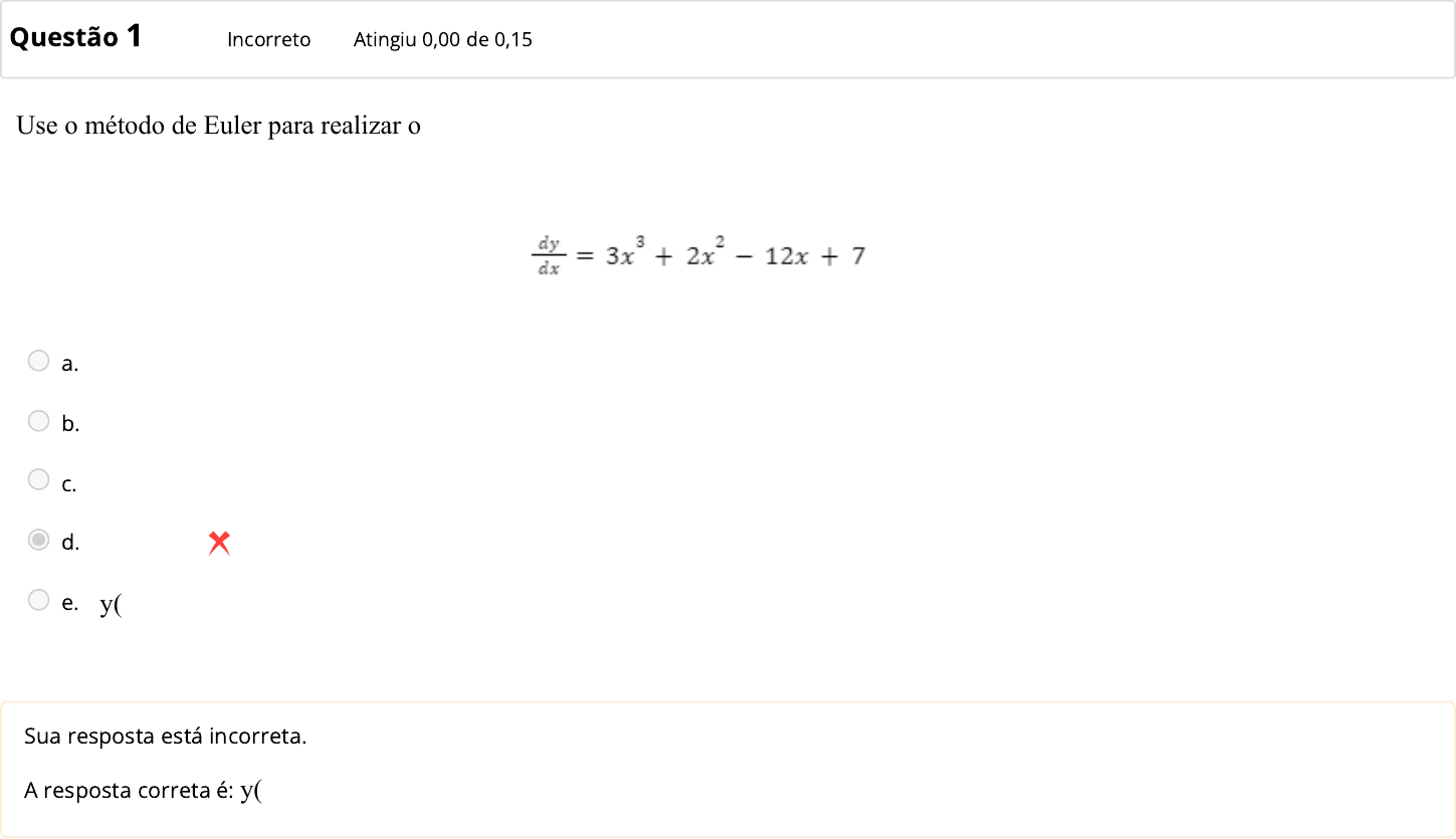 Questão 1 Incorreto Atingiu 0,00 de 0,15 Use o método de Euler para realizar o primeiro passo da integral da equação apresentada. Integre para x=0 a 1 usando 0,5 como passo de integração. Considere a condição inicial em x=0 como y=1. a. y(0,5)=5. b. y(0,5)=4. c. y(0,5)=3,5. d. y(0,5)=3. e. y(0,5)=4,5. Sua resposta está incorreta. A resposta correta é: y(0,5)=4,5. Questão 2 Correto Atingiu 0,15 de 0,15 Em relação ao método de Runge-Kutta de integração, analise as afirmativas a seguir: O método de Runge-Kutta de primeira ordem é o método de Euller. Existem somente 3 valores viáveis de a2na realização do método de Runge-Kutta de segunda ordem. Quanto maior o grau do método de Runge-Kutta, maior a complexidade da obtenção da função incremento. a. F-F-F. b. V-V-V c. V-F-V. d. V-F-F. e. F-V-F. Sua resposta está correta. A resposta correta é: V-F-V. Questão 3 Incorreto Atingiu 0,00 de 0,15 Use o método de Euler para realizar o primeiro passo da integral da equação apresentada. Integre para x=1 a 4 usando 0,5 como passo de integração. Considere a condição inicial em x=1 como y=3. a. y(1,5)=4,5. b. y(1,5)=3,5. c. y(1,5)=4. d. y(1,5)=5. e. y(1,5)=3. Sua resposta está incorreta. A resposta correta é: y(1,5)=3. Questão 4 Incorreto Atingiu 0,00 de 0,15 Use o método de Euler para realizar o primeiro passo da integral da equação apresentada. Integre para x=0 a 1 usando 0,2 como passo de integração. Considere a condição inicial em x=0 como y=1. a. y(0,2)=2,8. b. y(0,2)=2,4. c. y(0,2)=3. d. y(0,2)=3,5. e. y(0,2)=2. Sua resposta está incorreta. A resposta correta é: y(0,2)=2,4. Questão 5 Incorreto Atingiu 0,00 de 0,15 Use o método de Euler para realizar o primeiro passo da integral da equação apresentada. Integre para x=1 a 4 usando 0,2 como passo de integração. Considere a condição inicial em x=1 como y=3. a. y(1,2)=3. b. y(1,2)=3,5. c. y(1,2)=5. d. y(1,2)=4. e. y(1,2)=4,5. Sua resposta está incorreta. A resposta correta é: y(1,2)=3. ◄ QUESTIONÁRIO 5 Seguir para... PROVA ► https://ava.unifacear.edu.br/mod/quiz/view.php?id=927184&forceview=1 https://ava.unifacear.edu.br/mod/quiz/view.php?id=927192&forceview=1
