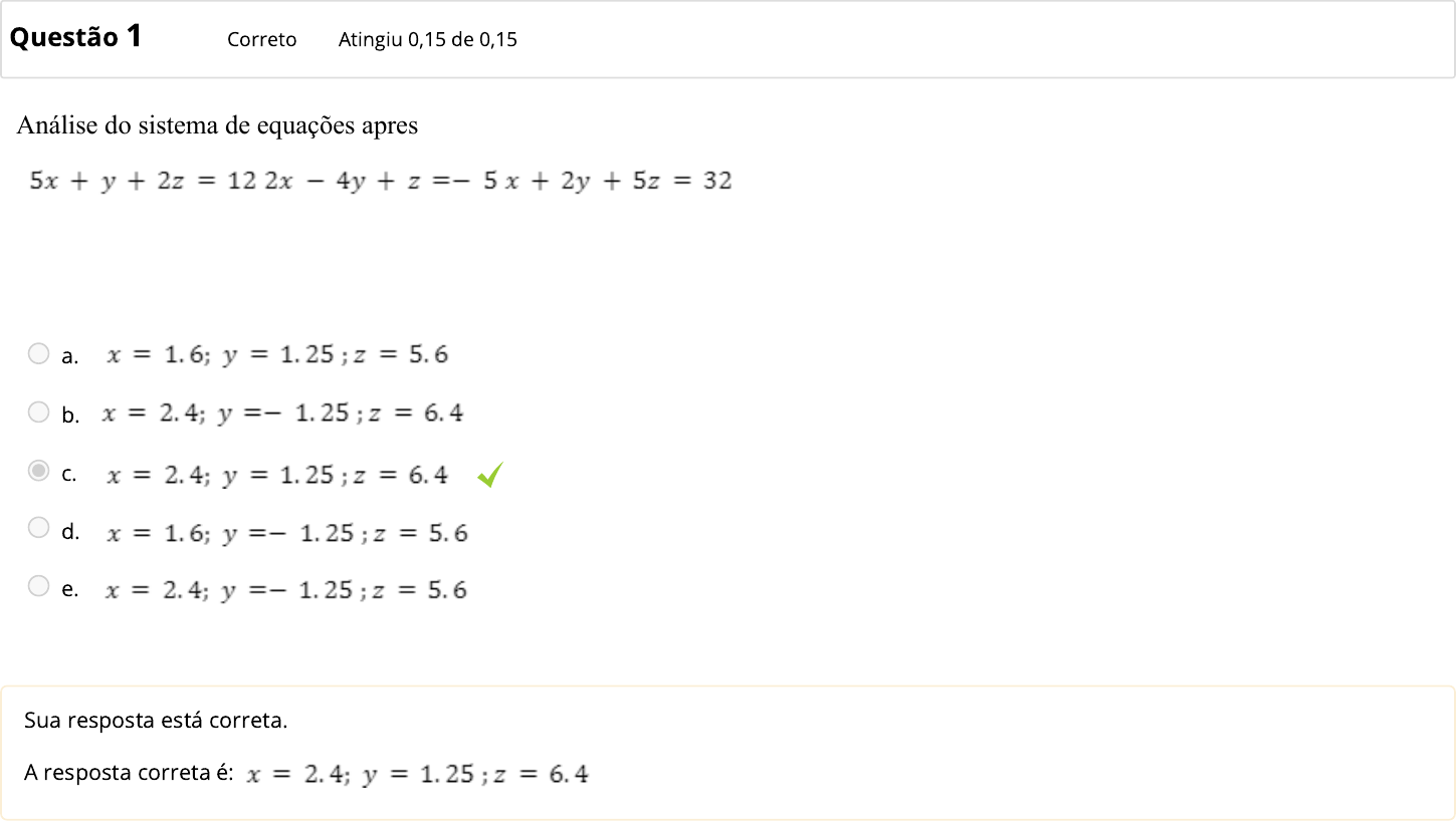 Questão 1 Correto Atingiu 0,15 de 0,15 Análise do sistema de equações apresentado a seguir. Utilizando o método de Gauss-Jacobi, realize uma iteração e informe os valores obtidos para x, y e z. Considere todas as variáveis como 0 na estimativa inicial. a. b. c. d. e. Sua resposta está correta. A resposta correta é: Questão 2 Incorreto Atingiu 0,00 de 0,15 O método da eliminação de Gauss é o método mais simples e didático de resolução de sistemas de equações através de manipulação matricial. Em relação a eliminação de Gauss, analise as afirmativas a seguir: A eliminação de Gauss é um método numérico iterativo. A primeira etapa da eliminação de Gauss consiste em eliminar progressivamente variáveis determinadas equações até que o sistema apresente o formato triangular superior. Após a primeira etapa, de eliminação progressiva, é iniciado o processo de substituição regressiva, de baixo pra cima, para se obter os valores de todas as variáveis do sistema de maneira direta. a. F-V-F. b. V-F-F. c. V-V-V. d. F-V-V. e. F-F-F. Sua resposta está incorreta. A resposta correta é: F-V-V. Questão 3 Incorreto Atingiu 0,00 de 0,15 Analise o sistema de equações não lineares apresentado a seguir. Baseando-se no método de Newton-Raphson, assinale a alternativa que apresenta o primeiro elemento da matriz jacobiana do sistema. a. b. c. d. e. Sua resposta está incorreta. A resposta correta é: Questão 4 Incorreto Atingiu 0,00 de 0,15 Analise o sistema de equações apresentado a seguir. Utilizando o método da eliminação de Gauss, escreva como fica a segunda linha após a primeira operação de eliminação progressiva. a. b. c. d. e. 1.6Y - 3.8Z = 2.2 Sua resposta está incorreta. A resposta correta é: Questão 5 Correto Atingiu 0,15 de 0,15 Sistemas de equações são conjuntos de equações que devem ser resolvidas de maneira conjunta para obter um resultado comum que satisfaça as múltiplas equações apresentadas. Esses sistemas podem ser lineares e não lineares. Em relação a identificação de sistemas de equações, análise os sistemas a seguir: Analisando os sistemas de equações apresentados, assinale as alternativas que contém somente sistemas lineares: a. II, III e IV. b. I e II. c. I e IV. d. III e IV. e. I, II e III. Sua resposta está correta. A resposta correta é: I e II. ◄ QUESTIONÁRIO 2 Seguir para... QUESTIONÁRIO 4 ► https://ava.unifacear.edu.br/mod/quiz/view.php?id=927163&forceview=1 https://ava.unifacear.edu.br/mod/quiz/view.php?id=927177&forceview=1