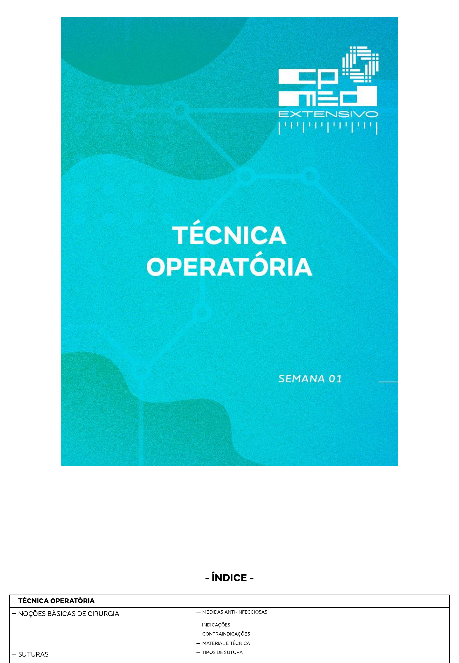 - ÍNDICE - TÉCNICA OPERATÓRIA NOÇÕES BÁSICAS DE CIRURGIA MEDIDAS ANTI-INFECCIOSAS SUTURAS INDICAÇÕES CONTRAINDICAÇÕES MATERIAL E TÉCNICA TIPOS DE SUTURA NÓS CIRÚRGICOS COMPLICAÇÕES CUIDADOS LOCAIS E RETIRADA DOS PONTOS TÉCNICA OPERATÓRIA NOÇÕES BÁSICAS DE CIRURGIA VIDEO_01_CPMED_EXTENSIVO_APOSTILA_01 MEDIDAS ANTI-INFECCIOSAS Em todo procedimento cirúrgico devemos buscar diminuir os riscos de infecção, por isso as cirurgias devem respeitar as técnicas de assepsia e antissepsia. Mas qual é a diferença e o que estes termos significam? → Assepsia: conjunto de medidas preventivas para impedir a entrada de agentes patogênicos no organismo ou na ferida operatória. Compreende desde a esterilização ou desinfecção de materiais até a instalação de um ambiente livre de micróbios. Dizemos que para todo procedimento cirúrgico se utiliza a "técnica asséptica". Daí, definimos mais dois conceitos: esterilização e desinfecção. O primeiro se refere à destruição de qualquer forma de vida, incluindo esporos e inclui irradiação, autoclaves etc. O segundo se refere à destruição apenas de formas vegetativas, utilizando principalmente produtos químicos como aldeídos, fenólicos etc. E quando decidir entre uma e outra? A ANVISA faz recomendações específicas de acordo com a classificação de Spaulding (CDC). Por esta classificação, temos a divisão dos artigos utilizados em cirurgia em: críticos (penetram através da pele ou mucosas), semicríticos (contato com pele íntegra ou não íntegra) e não críticos (contato apenas com pele íntegra). Os artigos críticos devem ser sempre esterilizados (ex.: agulhas e cateteres venosos), os semicríticos, desinfectados (ex.: laringoscópios) e os não críticos submetidos à desinfecção leve ou mesmo limpeza com detergentes. → Antissepsia: são medidas para remover ao máximo o número de micro-organismos sobre a pele ou mucosa. A flora transitória, aderida à gordura da pele, é mais fácil de ser retirada do que a flora permanente. A antissepsia se dá em duas fases: ● Limpeza com soluções degermantes e fricção (mecânica); ● Antissepsia propriamente dita com soluções alcoólicas de iodóforos (PVPI) ou clorexidina. PARAMENTAÇÃO → A entrada no centro cirúrgico: antes de entrar no centro cirúrgico, qualquer pessoa, mesmo que não for participar de nenhum ato cirúrgico deverá trocar a roupa pelas vestimentas adequadas (macacão ou pijama cirúrgico), usar gorros, máscaras e proteger os calçados com uma bota (propé) descartável ou de tecido reutilizável (questionável em algumas unidades atualmente). Nunca devemos nos esquecer de lavar as mãos. → Lavagem e escovação das mãos e antebraços: a escovação cirúrgica é obrigatória para qualquer profissional que entrar no campo cirúrgico. Após a retirada de anéis, pulseiras e relógio, a escovação é iniciada. O tempo mínimo é de cinco minutos na primeira vez do dia e de três minutos nas vezes subsequentes. A sequência apropriada tanto da lavagem quanto da secagem é das mãos para o antebraço. Podemos utilizar como solução degermante o polivinilpirrolidona-iodo a 10% ou a solução de clorexidina a 4%. Como a clorexidina tem efeito residual maior que o iodo (6-8h), costuma ser a solução de escolha para cirurgias mais longas. Não se devem misturar princípios ativos (ex.: PVPI degermante e clorexidina alcoólica). As mãos devem sempre ficar mais elevadas que os cotovelos para o escorrimento da água. Inicia-se pela limpeza das unhas e dos dedos, depois as palmas e dorsos das mãos e depois punhos e antebraços até os cotovelos. Atenção! Você nunca deve retornar de uma área não limpa para outra já escovada. Após a escovação cuidadosa e metódica, o enxague deve ser feito das pontas dos dedos em direção ao cotovelo, sem permitir também, que a água volte para as áreas já enxaguadas. A secagem das mãos é feita com compressa estéril dobrada de forma que cada parte seja utilizada para secar uma única parte. A sequência também deve ser dedos e mãos, antebraços e cotovelos. VIDEO_02_CPMED_EXTENSIVO_APOSTILA_01 → Colocação do avental e das luvas: após escovar e secar as mãos e os antebraços a equipe cirúrgica deverá vestir o avental ou capote cirúrgico que é amarrado nas costas pela circulante. Existem modelos descartáveis em que o avental pode ser amarrado na porção lateral também. Somente agora o cirurgião calça as luvas, tendo o devido cuidado de não tocar em áreas que ficarão expostas no campo cirúrgico. A instrumentadora, previamente aparamentada, poderá ajudar na colocação do capote e das luvas. VIDEO_03_CPMED_EXTENSIVO_APOSTILA_01 VIDEO_04_CPMED_EXTENSIVO_APOSTILA_01 1) Secar as mãos; 2 e 3) Pegar e elevar o capote; 4) Abrir e identificar as mangas; 5) Vestir; 6) Manter braços para o alto e para fora; 7) Circulante traciona e amarra o capote. → Preparo da pele do paciente: deverá ser feito em duas etapas. Na primeira, é realizada a degermação da pele com o uso de solução justamente chamada de "degermante", à base de clorexidina ou iodopovidona. Essa etapa pode ser feita logo após a indução anestésica por qualquer membro da equipe. A segunda etapa, a antissepsia, é feita com chumaços de gaze dobrada e montada em uma pinça longa e forte (Kocher, Cheron etc.), embebida em uma solução com o mesmo princípio ativo, num veículo alcoólico, seja de clorexidina alcoólica (2 a 4%), seja de iodopovidona alcoólica (povidine alcoólico). Se for mucosa, o veículo deve ser o aquoso (tópico). Esta etapa deverá ser feita pelo cirurgião ou pelo auxiliar. Sempre lembrando que a gaze não deverá voltar a uma posição anterior, idealmente do centro para a periferia. 1) Pegar uma das luvas com indicador e polegar pela face interna dobrada e exposta; 2) calçar a luva; 3) pegar a outra luva pela face externa, abaixo da dobra; 4) calçar luva e levá-la até o p
