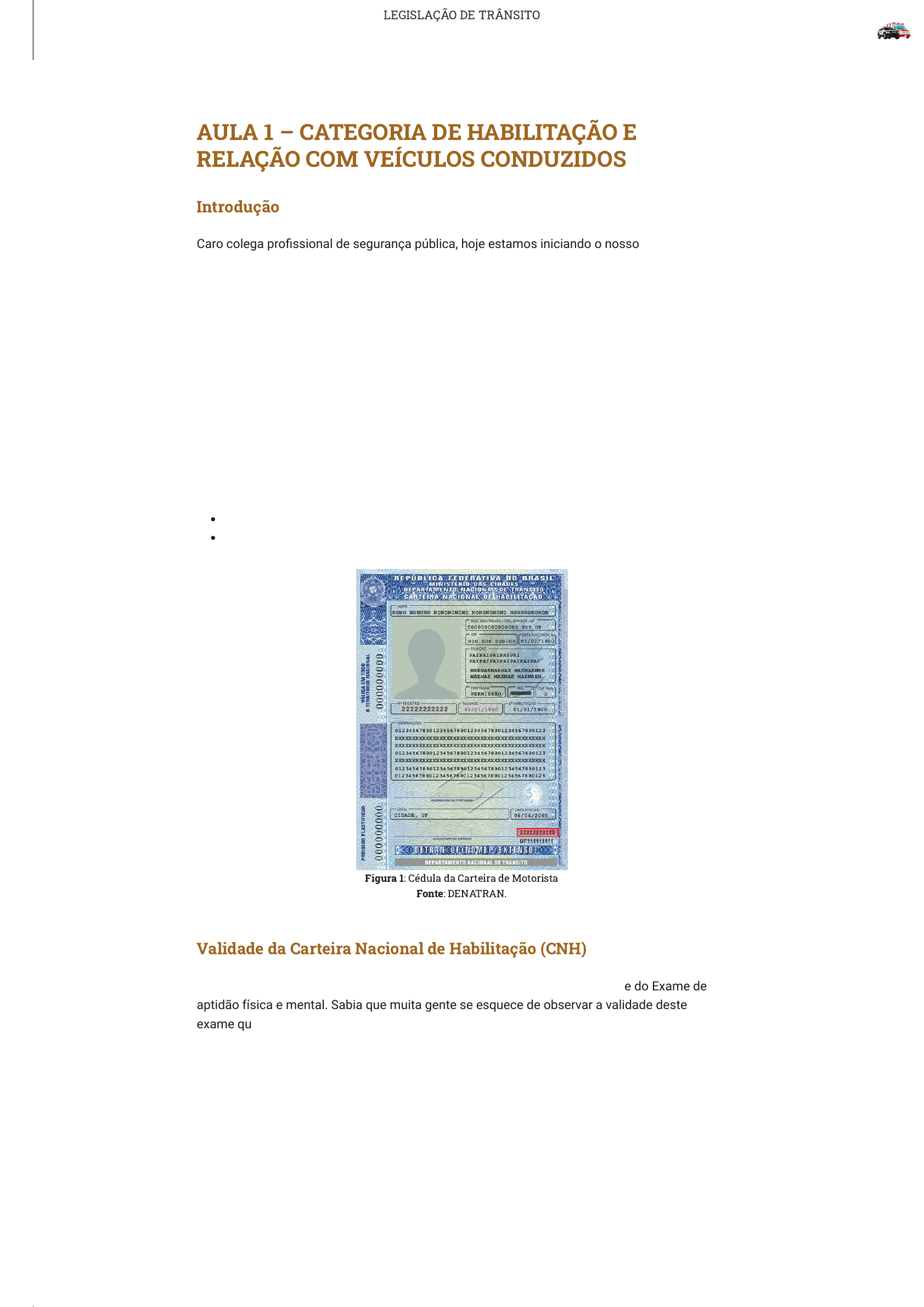 AULA 1 – CATEGORIA DE HABILITAÇÃO E RELAÇÃO COM VEÍCULOS CONDUZIDOS Introdução Caro colega pro�ssional de segurança pública, hoje estamos iniciando o nosso curso de Condutores de Veículos de Emergência (CVE). Temos certeza de que o conteúdo estudado será útil para a sua capacitação e para seu crescimento pessoal e pro�ssional. A primeira coisa que temos que nos perguntar é: eu posso conduzir um veículo de emergência? Eu posso conduzir a viatura da corporação? Existem requisitos para isso? Ou qualquer policial, independentemente de ter feito cursos ou treinamentos, pode conduzir? Se o seu órgão tiver como competências o atendimento de acidentes e o socorro de vítimas, você está habilitado para conduzir uma ambulância, caso seja preciso? Não se preocupe. Todas estas perguntas serão respondidas no decorrer deste módulo! Vamos começar. Em primeiro lugar, pegue a sua carteira de habilitação e veri�que: A validade da sua habilitação; e A categoria à qual você está habilitado. Figura 1: Cédula da Carteira de Motorista Fonte: DENATRAN. Validade da Carteira Nacional de Habilitação (CNH) A validade da Carteira Nacional de Habilitação (CNH) está atrelada à validade do Exame de aptidão física e mental. Sabia que muita gente se esquece de observar a validade deste exame que dá validade à habilitação? Então, a primeira coisa que devemos ter em mente é saber se a nossa CNH está dentro da validade, até porque é infração de trânsito, de natureza gravíssima, conduzir com a CNH vencida há mais de trinta dias. O artigo 162, parágrafo V, do Código de Trânsito Brasileiro lei nº 9.503/97 traz a seguinte redação: Art. 162. Dirigir veículo [...] V- com validade da Carteira Nacional de Habilitação vencida há mais de trinta dias: Infração- gravíssima; Penalidade – multa; LEGISLAÇÃO DE TRÂNSITO javascript:void(0); Restrições da CNH Outro fator importante é a possível existência de restrição, expressa no campo de observações da CNH. Caso tenha encontrado uma letra isolada neste campo da Carteira de Habilitação é sinal de que você possui alguma restrição para a condução de veículo automotor na via pública. Para saber a relação completa dos códigos e das restrições previstas, devemos consultar a tabela 1, a seguir, retirada da Resolução do CONTRAN n. 425/2012, com redação dada pela Resolução do CONTRAN n. 474/2014: Acesse o Material Complementar e con�ra o Anexo XV da Resolução do CONTRAN n. 425/2012. Vamos a alguns exemplos: A violação das condições estabelecidas no campo de observações da CNH, conforme tabela acima, con�gura infração de trânsito de natureza gravíssima, prevista no art. 162, inciso VI, do CTB (com exceção das restrições “T” e “U”, punidas com a infração do art. 195). O artigo 162, parágrafo VI, do Código de Trânsito Brasileiro lei nº 9.503/97 traz a seguinte redação: Medida administrativa – recolhimento da Carteira Nacional de Habilitação e retenção do veículo até apresentação de condutor habilitado. A Lei n. 14.071/2020, de 13 de outubro de 2020, entrou em vigor, no dia 12 de abril de 2021. As CNHs expedidas após essa data passarão a contar com a validade do exame de aptidão física e mental de dez anos, para condutores com menos de 50 (cinquenta) anos e validade de cinco anos para os condutores com idade igual ou superior a 50 (cinquenta) anos e inferior a 70 (setenta) anos de idade. Para os condutores com idade igual ou superior a 70 (setenta) anos o prazo de validade passa a ser de 03 (três) anos, conforme o §2, inciso III do Artigo 147 do CTB. I II Um Policial Federal observa a própria CNH e percebe que no campo de observações há uma letra “A” maiúscula. Isso indica que ele só pode conduzir veículos automotores utilizando lentes corretivas (óculos ou lentes de contato). Art. 162. Dirigir veículo [...] VI- sem usar lentes corretoras de visão, aparelho auxiliar de audição, de prótese física ou adaptações do veículo impostas por ocasião da concessão ou da renovação da Você sabia? LEGISLAÇÃO DE TRÂNSITO https://eadsegen.mj.gov.br/pluginfile.php/2609554/mod_resource/content/22/modulo1/assets/files/Resolu%C3%A7%C3%A3o%20CONTRAN%20N%C2%BA%20425%20DE%2027_11_2012%20-%20Federal%20-%20LegisWeb.pdf https://eadsegen.mj.gov.br/pluginfile.php/2609554/mod_resource/content/22/modulo1/assets/files/Resolu%C3%A7%C3%A3o%20CONTRAN%20N%C2%BA%20425%20DE%2027_11_2012%20-%20Federal%20-%20LegisWeb.pdf javascript:void(0); O artigo 195, do Código de Trânsito Brasileiro lei nº 9.503/97 traz a seguinte redação: Mas qual veículo você pode conduzir? Você estudará sobre essa questão a seguir. 1.1 COMPREENDENDO AS CATEGORIAS As categorias indicam o tipo de veículo que o motorista está habilitado a dirigir. As regras a respeito das categorias de habilitação estão de�nidas no artigo 143 do Código de Trânsito Brasileiro (CTB), que estabelece uma gradação entre as categorias: “Os candidatos poderão habilitar-se nas categorias de A a E, obedecida a seguinte gradação: [...]” (BRASIL, 1997, n.p). Contudo, não é bem assim, uma vez que o texto do CTB é complementado pelo anexo I da Resolução do CONTRAN n. 789, de 18 de junho de 2020. Vejamos, agora, cada uma das categorias de CNH e quais os tipos de veículos que podem ser conduzidos com cada uma delas: 1.1.1 Categoria A Inicialmente, vejamos o que está disposto no inciso I do art. 143 do CTB: “Art. 143. I - Categoria A - condutor de veículo motorizado de duas ou três rodas, com ou sem carro lateral” (BRASIL, 1997, n.p.). Ou seja, a categoria A permite que o condutor conduza motocicletas e motonetas, com motor à combustão ou elétrico, independentemente da potência do motor, além dos triciclos motorizados, dos ciclomotores e dos ciclo-elétricos. licença para conduzir: Infração- gravíssima; Penalidade – multa; Medida administrativa – recolhim