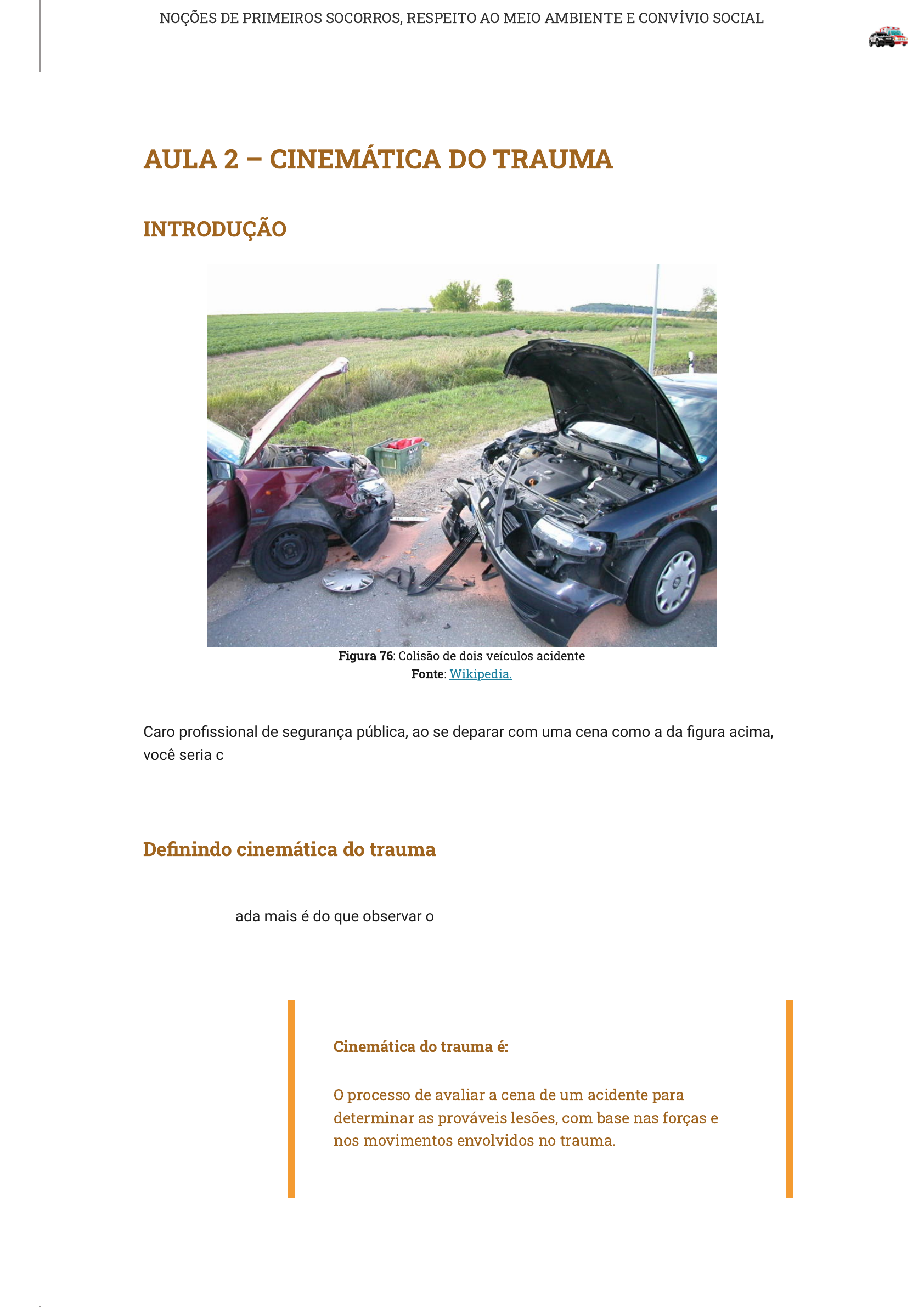 AULA 2 – CINEMÁTICA DO TRAUMA INTRODUÇÃO Figura 76: Colisão de dois veículos acidente Fonte: Wikipedia. Caro pro�ssional de segurança pública, ao se deparar com uma cena como a da �gura acima, você seria capaz de estimar as possíveis lesões sofridas pelos ocupantes do veículo? Se você ainda não sabe, não se preocupe; pois, ao �nal desta aula, você já terá boas noções sobre este tema. De�nindo cinemática do trauma Uma técnica que auxilia na estimativa das possíveis lesões é a análise da cinemática do trauma, que nada mais é do que observar o veículo, visualizando onde as forças atuaram na colisão. De acordo com a localização dos danos, você poderá prever onde se encontram as principais lesões nas vítimas. Cinemática do trauma é: O processo de avaliar a cena de um acidente para determinar as prováveis lesões, com base nas forças e nos movimentos envolvidos no trauma. NOÇÕES DE PRIMEIROS SOCORROS, RESPEITO AO MEIO AMBIENTE E CONVÍVIO SOCIAL https://pt.wikipedia.org/wiki/Colis%C3%A3o_frontal#/media/Ficheiro:Verkehrsunfall1.jpg javascript:void(0); A seguir, você irá conhecer os principais padrões de colisões necessários a um bom entendimento da cinemática do trauma. 2.1 COLISÃO FRONTAL O veículo colide de frente, podendo a trajetória da vítima ser para frente e para cima, quando desce à margem da estrada, por exemplo, ou para frente e para baixo, quando sobe um barranco. Na �gura a seguir, os pontos amarelos indicam os prováveis locais das lesões: Figura 77: Colisão Frontal - Danos ao Condutor. Prováveis locais das lesões provocadas pela colisão frontal Fonte: NAT/UFSC. A – Para frente e para cima: Lesões: Principalmente crânio, cervical, tórax e pelve. B – Para frente e para baixo: Lesões: Principalmente pelve, fêmur e joelho. 2.2 COLISÃO TRASEIRA O veículo é colidido por trás, o que geralmente ocorre em congestionamentos. Nestas situações, o veículo é subitamente acelerado para frente, provocando uma hiperextensão do pescoço, com possível lesão de cervical devido ao efeito chicote. Se o motorista não estiver contido pelo cinto de segurança, poderá bater com a parte frontal do crânio no para-brisa, sofrendo uma lesão típica de colisão frontal. IMPORTANTE: Em toda colisão traseira com grandes estragos no veículo, deve-se suspeitar de lesão cervical. NOÇÕES DE PRIMEIROS SOCORROS, RESPEITO AO MEIO AMBIENTE E CONVÍVIO SOCIAL javascript:void(0); 2.3 COLISÃO TRANSVERSAL Ocorre quando o veículo é atingido em um dos lados, podendo essa colisão ser no centro de gravidade, ou fora do centro de gravidade. Geralmente, as lesões ocorrem no lado em que o veículo foi colidido, mas podem ocorrer lesões secundárias no lado oposto. A gravidade das lesões varia de acordo com a invasão do habitáculo pela lataria do veículo. Ocorrem geralmente em cruzamentos. 2.3.1 Impacto no centro de gravidade Quando o impacto ocorrer no centro de gravidade do veículo, a energia será absorvida principalmente pela estrutura do veículo, causando grandes estragos e lesões em seus ocupantes. 2.3.2 Impacto fora do centro de gravidade No impacto fora do centro de gravidade, o veículo sofre uma rotação, o que faz com que o ocupante gire no mesmo sentido; e, dependendo da velocidade e da força envolvida, pode haver lesão cervical, por rotação. 2.4 CAPOTAMENTO O veículo sofre impactos de diferentes direções e ângulos, o que torna difícil prever os tipos de lesões; mas, normalmente, a vítima apresenta lesões por todo o corpo, especialmente se ela estiver sem o cinto de segurança. IMPORTANTE: Quando o impacto é fora do centro de gravidade, a energia é dissipada pelo movimento de rotação do veículo, o que causa menos danos na estrutura do veículo. Nota: Nesta aula, você conheceu os principais tipos de colisões com suas prováveis lesões, mas existem muitos outros que não serão abordados neste curso. É possível citar as colisões com motocicletas, que são responsáveis por um número signi�cativo de mortes em todos os anos. No motociclista, as lesões são agravadas em virtude de a energia, em sua maior parte, ser dissipada no corpo do condutor devido à ausência de estrutura que lhe absorva. O atendimento é o mesmo prestado aos condutores de automóveis. NOÇÕES DE PRIMEIROS SOCORROS, RESPEITO AO MEIO AMBIENTE E CONVÍVIO SOCIAL javascript:void(0); IMPORTANTE: Quando solicitar recursos adicionais, é muito importante que você informe a cinemática do trauma, ou seja, aquilo que você está vendo, os estragos no veículo e o tipo de veículo e de acidente. Assim, o pro�ssional da saúde responsável poderá prever o dimensionamento da cena e alocará os recursos necessários. NOÇÕES DE PRIMEIROS SOCORROS, RESPEITO AO MEIO AMBIENTE E CONVÍVIO SOCIAL javascript:void(0);