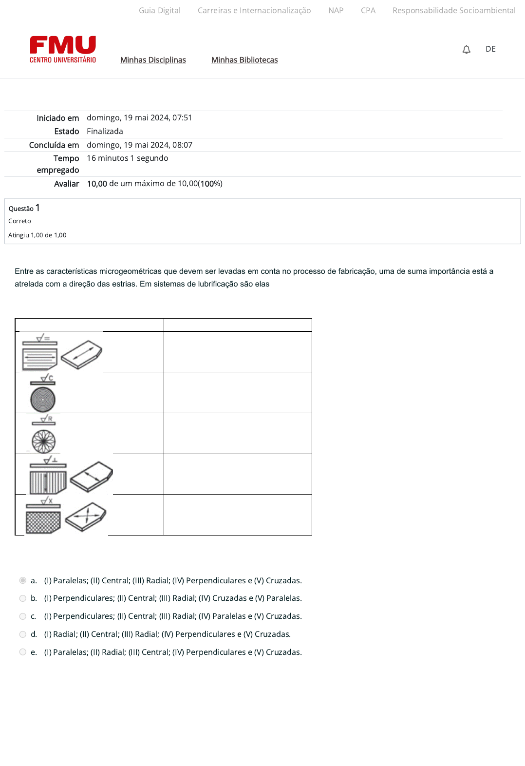 Iniciado em domingo, 19 mai 2024, 07:51 Estado Finalizada Concluída em domingo, 19 mai 2024, 08:07 Tempo empregado 16 minutos 1 segundo Avaliar 10,00 de um máximo de 10,00(100%) Questão 1 Correto Atingiu 1,00 de 1,00 Entre as características microgeométricas que devem ser levadas em conta no processo de fabricação, uma de suma importância está a atrelada com a direção das estrias. Em sistemas de lubrificação são elas que de certa forma direcionam o escoamento do óleo, por exemplo. Neste sentido, qual a sequência ordenada correta que correlaciona a direção de estrias com os símbolos que são indicados em desenho mecânico: Direções das estrias Símbolos I. ( ) Central II. ( ) Cruzadas III. ( ) Paralelas IV. ( ) Perpendiculares V. ( ) Radial Fonte: Elaborado pelo autor, 2019 a. (I) Paralelas; (II) Central; (III) Radial; (IV) Perpendiculares e (V) Cruzadas. b. (I) Perpendiculares; (II) Central; (III) Radial; (IV) Cruzadas e (V) Paralelas. c. (I) Perpendiculares; (II) Central; (III) Radial; (IV) Paralelas e (V) Cruzadas. d. (I) Radial; (II) Central; (III) Radial; (IV) Perpendiculares e (V) Cruzadas. e. (I) Paralelas; (II) Radial; (III) Central; (IV) Perpendiculares e (V) Cruzadas. Guia Digital Carreiras e Internacionalização NAP CPA Responsabilidade Socioambiental Minhas Disciplinas Minhas Bibliotecas DE https://codely-fmu-content.s3.amazonaws.com/Moodle/GuiaDigital/Guia+digital/index.html https://carreiras.fmu.br/ https://codely-fmu-content.s3.amazonaws.com/Moodle/NAP/inicial/nap/fmu/index.html https://codely-fmu-content.s3.amazonaws.com/Moodle/CPA/landing_CPA/index.html https://portal.fmu.br/sustentabilidade https://ambienteacademico.com.br/ https://ambienteacademico.com.br/ https://ambienteacademico.com.br/course/view.php?id=236 Questão 2 Correto Atingiu 1,00 de 1,00 Questão 3 Correto Atingiu 1,00 de 1,00 Questão 4 Correto Atingiu 1,00 de 1,00 Os equipamentos denominados calibres tampão são tipicamente empregados na inspeção de furos, sejam eles cilíndricos ou não, roscados ou não. Eles são fabricados com materiais de alta resistência mecânica no intuito de aumentar sua vida útil. No caso da aferição do diâmetro de um furo cilíndrico não roscado, essa dimensão estará dentro das tolerâncias quando o calibrador tampão (passa/não passa): a. passar o diâmetro menor e não passar o diâmetro maior. b. passar os dois diâmetros. c. passar o diâmetro maior e não passar o diâmetro menor. d. passar o diâmetro maior. e. não passar os dois diâmetros. Quatro conjuntos de peças para serem empregadas em um acoplamento foram fabricadas e, suas dimensões reais do diâmetro da peça com eixo e do diâmetro da peça com furo são apresentadas a seguir. . eixo: 50,012 mm; furo: 50,015 mm. . eixo: 50,016 mm; furo: 50,008 mm. . eixo: 50,018 mm; furo: 50,022 mm. . eixo: 50,011 mm; furo: 50,006 mm. Para cada conjunto, respectivo, descreva com a letra ‘F’ caso o ajuste seja por folga ou ‘I’ caso o ajuste seja por interferência. Das alternativas abaixo, indique qual a sequência correta desta descrição. a. F - I - F - I. b. I - F - I - I. c. F - I - F - F. d. I - F - I - F. e. F - F - F - I. A operação de medição indireta demonstra que o resultado de medição é obtido pela medição direta de uma ou mais grandezas que especificamente possui relação com a grandeza sob medição. Neste sentido, uma medição indireta é realizada com: a. calibrador. b. paquímetro. c. nenhum dos instrumentos acima indicados. d. escala. e. micrômetro. Guia Digital Carreiras e Internacionalização NAP CPA Responsabilidade Socioambiental Minhas Disciplinas Minhas Bibliotecas DE https://codely-fmu-content.s3.amazonaws.com/Moodle/GuiaDigital/Guia+digital/index.html https://carreiras.fmu.br/ https://codely-fmu-content.s3.amazonaws.com/Moodle/NAP/inicial/nap/fmu/index.html https://codely-fmu-content.s3.amazonaws.com/Moodle/CPA/landing_CPA/index.html https://portal.fmu.br/sustentabilidade https://ambienteacademico.com.br/ https://ambienteacademico.com.br/ https://ambienteacademico.com.br/course/view.php?id=236 Questão 5 Correto Atingiu 1,00 de 1,00 Questão 6 Correto Atingiu 1,00 de 1,00 Todos os processos de fabricação inserem, devido a diversos fatores, irregularidades de formas macrogeométricas e microgeométricas. As de ordem microgeométrica estão atreladas a rugosidade da superfície de uma peça. Neste sentido, quanto às seguintes informações, indique qual a correta. Quanto as seguintes informações, indique qual a correta. a. A classe de rugosidade N12 possui uma rugosidade Ra de 0,025 µm. b. Uma superfície de peça bruta apresenta o intervalo de rugosidade de menores índices, dados por N1 a N3. c. A classe de rugosidade N1 possui uma rugosidade Ra de 50 µm. d. Uma superfície peça polida e sem marcas visualmente perceptíveis apresenta intervalo de rugosidade N4 a N6. e. Uma superfície de peça bruta apresenta o intervalo de rugosidade de maiores índices, dados por N10 a N12. Em alguns tipos de montagens os elementos carecem de um ajuste com folga. Dentre as montagens, podemos citar: peças cujos funcionamentos necessitam de folga por força de dilatação, anéis de rolamento, corrediças etc. Sobre esse tema, complete os espaços em branco. Complete os espaços em branco. “A folga ______ de uma montagem ocorre quando cada um dos elementos está na dimensão de máximo material. A folga de montagem tende para ______ quando as dimensões reais dos elementos de montagem estão mais afastadas das suas dimensões de máximo material e quando os erros geométricos são zero.” Das alternativas abaixo, indique qual a sequência correta. a. bilateral, lateral. b. mínima, máxima. c. máxima, lateral. d. bilateral, mínima. e. máxima, mínima. Guia Digital Carreiras e Internacionalização NAP CPA Responsabilidade Socioambiental Minhas Disciplinas Minhas Bibliotecas DE https://codely-fmu-content.s3.amazonaws.com/Moodle/GuiaDigital/Guia+digit