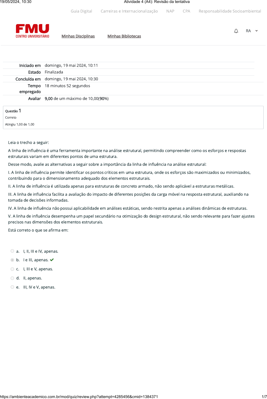 Iniciado em domingo, 19 mai 2024, 10:11 Estado Finalizada Concluída em domingo, 19 mai 2024, 10:30 Tempo empregado 18 minutos 52 segundos Avaliar 9,00 de um máximo de 10,00(90%) Questão 1 Correto Atingiu 1,00 de 1,00 Leia o trecho a seguir: A linha de in�uência é uma ferramenta importante na análise estrutural, permitindo compreender como os esforços e respostas estruturais variam em diferentes pontos de uma estrutura. Desse modo, avalie as alternativas a seguir sobre a importância da linha de in�uência na análise estrutural: I. A linha de in�uência permite identi�car os pontos críticos em uma estrutura, onde os esforços são maximizados ou minimizados, contribuindo para o dimensionamento adequado dos elementos estruturais. II. A linha de in�uência é utilizada apenas para estruturas de concreto armado, não sendo aplicável a estruturas metálicas. III. A linha de in�uência facilita a avaliação do impacto de diferentes posições da carga móvel na resposta estrutural, auxiliando na tomada de decisões informadas. IV. A linha de in�uência não possui aplicabilidade em análises estáticas, sendo restrita apenas a análises dinâmicas de estruturas. V. A linha de in�uência desempenha um papel secundário na otimização do design estrutural, não sendo relevante para fazer ajustes precisos nas dimensões dos elementos estruturais. Está correto o que se a�rma em: a. I, II, III e IV, apenas. b. I e III, apenas. c. I, III e V, apenas. d. II, apenas. e. III, IV e V, apenas. Guia Digital Carreiras e Internacionalização NAP CPA Responsabilidade Socioambiental Minhas Disciplinas Minhas Bibliotecas RA 19/05/2024, 10:30 Atividade 4 (A4): Revisão da tentativa https://ambienteacademico.com.br/mod/quiz/review.php?attempt=4285456&cmid=1384371 1/7 https://codely-fmu-content.s3.amazonaws.com/Moodle/GuiaDigital/Guia+digital/index.html https://carreiras.fmu.br/ https://codely-fmu-content.s3.amazonaws.com/Moodle/NAP/inicial/nap/fmu/index.html https://codely-fmu-content.s3.amazonaws.com/Moodle/CPA/landing_CPA/index.html https://portal.fmu.br/sustentabilidade https://ambienteacademico.com.br/ https://ambienteacademico.com.br/ https://ambienteacademico.com.br/course/view.php?id=236 Questão 2 Correto Atingiu 1,00 de 1,00 Questão 3 Correto Atingiu 1,00 de 1,00 Considere o contexto abaixo: Uma consideração importante é a origem dos piores casos de carga móvel. Isso envolve uma análise de diferentes cenários e combinações de cargas móveis, a �m de identi�car os casos mais críticos que podem resultar nos maiores esforços na estrutura. Nesse contexto, assinale a alternativa correta sobre as cargas móveis: a. As cargas móveis podem variar de acordo com o tempo e as condições especí�cas de uso da estrutura. b. As cargas móveis são estáticas e não variam em magnitude e posição ao longo do tempo. c. A análise das cargas móveis requer apenas o cálculo dos esforços, sem a necessidade de considerar as deformações geradas. d. As cargas móveis são determinadas com base em critérios especí�cos que não variam de acordo com o tipo de estrutura. e. As cargas móveis referem-se apenas ao peso de pessoas que se deslocam dentro ou sobre uma estrutura. Leia o trecho a seguir: Sabemos das diferenças entre cargas concentradas e cargas distribuídas, e de sua importância na análise e no projeto de estruturas. Nesse contexto, ao projetar uma estrutura, é necessário realizar cálculos precisos para determinar a magnitude e a distribuição das cargas concentradas e distribuídas em toda a estrutura. Nesse sentido, avalie as asserções a seguir e a relação proposta entre elas: I. As cargas concentradas são aplicadas uniformemente ao longo da extensão do elemento estrutural. POIS II. As cargas distribuídas são aplicadas em pontos especí�cos da estrutura. Agora, assinale a alternativa correta: a. As duas asserções são verdadeiras, mas a segunda não justi�ca a primeira. b. A primeira asserção é verdadeira, e a segunda é falsa. c. Ambas as asserções são falsas. d. As duas asserções são verdadeiras, e a segunda justi�ca a primeira. e. A primeira asserção é falsa, e a segunda é verdadeira. Guia Digital Carreiras e Internacionalização NAP CPA Responsabilidade Socioambiental Minhas Disciplinas Minhas Bibliotecas RA 19/05/2024, 10:30 Atividade 4 (A4): Revisão da tentativa https://ambienteacademico.com.br/mod/quiz/review.php?attempt=4285456&cmid=1384371 2/7 https://codely-fmu-content.s3.amazonaws.com/Moodle/GuiaDigital/Guia+digital/index.html https://carreiras.fmu.br/ https://codely-fmu-content.s3.amazonaws.com/Moodle/NAP/inicial/nap/fmu/index.html https://codely-fmu-content.s3.amazonaws.com/Moodle/CPA/landing_CPA/index.html https://portal.fmu.br/sustentabilidade https://ambienteacademico.com.br/ https://ambienteacademico.com.br/ https://ambienteacademico.com.br/course/view.php?id=236 Questão 4 Correto Atingiu 1,00 de 1,00 Questão 5 Correto Atingiu 1,00 de 1,00 Leia o trecho abaixo: Assim como todas as outras, as cargas de impacto têm um papel signi�cativo na análise e no projeto de estruturas. Desse modo, a magnitude das cargas de impacto pode variar dependendo da natureza do evento e do tipo de estrutura. Diante disso, avalie as asserções a seguir e a relação proposta entre elas: I. As cargas de impacto são aplicadas de forma constante e uniforme sobre a estrutura. PORQUE II. As cargas de impacto são caracterizadas por sua natureza brusca e de curta duração. Agora, assinale a alternativa correta: a. As duas asserções são verdadeiras, e a segunda justi�ca a primeira. b. A primeira asserção é verdadeira, e a segunda é falsa. c. A primeira asserção é falsa, e a segunda é verdadeira. d. As duas asserções são verdadeiras, mas a segunda não justi�ca a primeira. e. Ambas as asserções são falsas. Considere o contexto abaixo: Conhecer e entender as cargas estáticas e dinâmicas é necessário pa