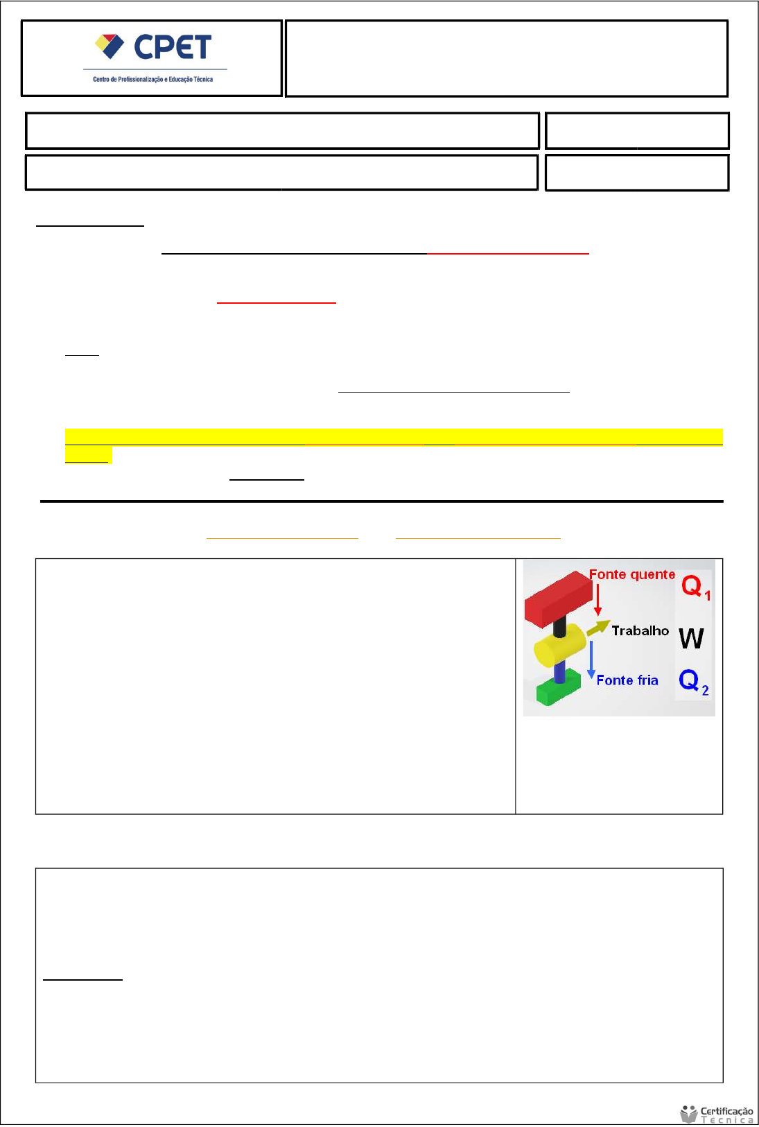 Máquinas Térmicas Data: 19/05/2024Aluno (a): Avaliação Prática Final INSTRUÇÕES: POR FAVOR, LEIA AS INSTRUÇÕES : ❖ Preencha os dados no Cabeçalho para sua identificação; ❖ Esta Avaliação contém 02 (duas) questões, totalizando 10 (dez) pontos; ❖ Leia com atenção os enunciados e faça o que se pede; ❖ As respostas devem ser digitadas abaixo de cada pergunta; ❖ NÃO serão aceitas respostas e textos retirados da íntegra Internet, assim como imagens (desde que seja pedida). A interpretação e execução fazem parte do processo. ❖ Ao terminar grave o arquivo com o nome APF Disciplina – Nome do Aluno; ❖ Só serão aceitas as extensões .docx (M.S. Word) ou .PDF; ❖ Envie o arquivo pelo sistema no local indicado; ❖ Atividades enviadas “em branco”, plagiadas de sites ou repetidas de outros alunos , terão notas ZERO. ❖ Verifiquem no campo de comentário o feedback dado pelo tutor. ❖ Em caso de dúvidas consulte o seu Tutor. 1) Pede-se que calcule o Calor absorvido (Q1) e o rendimento térmico (η) de uma máquina que opera segundo o ciclo de Carnot, representada na figura abaixo. Pela primeira lei da termodinâmica temos que: Q1 = W+Q2 logo: Q1 = 500J+200J Q1 = 700 J O calor absorvido Q1 é 700 J O rendimento térmico de uma máquina térmica é definido como a ra- zão entre o trabalho realizado e o calor absorvido: η = Q1/W η = 700J/500J η=5/7 η = 0,714 η = 71,4% O rendimento térmico da máquina é 70,4% 2) Dados: Q1 = ? J 3) Q2 = 200 J 4) W = 500 2) Apresente as principais diferenças e quais as vantagens na escolha entre os ciclos termodinâmi- cos Otto e Diesel. Os ciclos termodinâmicos Otto e Diesel são dois tipos diferentes de ciclos utilizados em motores de combustão interna, cada um com suas próprias características, vantagens e desvantagens. Podemos citar, a nosso ver, as principais diferenças entre esses ciclos e as vantagens associadas a cada um: Ciclo Otto Características: 1. Tipo de Combustão: O ciclo Otto utiliza combustão por faísca. A mistura de ar e combustí- vel é comprimida e então inflamada por uma faísca fornecida por uma vela de ignição. 2. Compressão e Expansão: No ciclo Otto, a compressão ocorre adiabaticamente até um volu- Máquinas Térmicas me mínimo, onde a combustão ocorre a volume constante (teoricamente). A expansão ocorre após a combustão. 3. Eficiência: A eficiência do ciclo Otto depende diretamente da relação de compressão (r=Vmax/Vmin). Maior relação de compressão tende a aumentar a eficiência. 4. Aplicações: Comumente encontrado em motores a gasolina, motores de motocicletas, carros de passeio, aeronaves leves, entre outros. Vantagens: 1. Custo e Simplicidade: Motores a gasolina (ciclo Otto) tendem a ser mais baratos e mais sim- ples de fabricar. 2. Resposta e Performance: Motores do ciclo Otto geralmente oferecem melhor desempenho e resposta rápida, sendo mais adequados para veículos leves e de alta performance. 3. Peso e Tamanho: Motores a gasolina são geralmente mais leves e compactos do que moto- res a diesel equivalentes. Ciclo Diesel Características: 1. Tipo de Combustão: O ciclo Diesel utiliza combustão por compressão. O ar é comprimido até que alcance uma temperatura alta o suficiente para inflamar o combustível injetado. 2. Compressão e Expansão: No ciclo Diesel, a compressão ocorre adiabaticamente até que o combustível seja injetado. A combustão ocorre a pressão constante (teoricamente), seguida pela expansão. 3. Eficiência: A eficiência do ciclo Diesel é alta devido à alta relação de compressão (r). Além disso, motores Diesel podem operar em uma faixa de mistura ar-combustível mais ampla, o que melhora a eficiência de combustão. 4. Aplicações: Comumente encontrado em veículos pesados, caminhões, ônibus, maquinaria agrícola, embarcações, e geradores de energia. Vantagens: 1. Eficiência de Combustível: Motores Diesel são mais eficientes em termos de consumo de combustível, proporcionando melhor quilometragem por litro. 2. Torque: Motores Diesel produzem mais torque a baixas rotações, o que é ideal para aplica- ções que requerem alta força de tração. 3. Durabilidade: Motores Diesel tendem a ser mais duráveis e têm uma vida útil mais longa devido à construção mais robusta para suportar altas pressões de combustão. Comparação Direta 1. Relação de Compressão: • Otto: Relação de compressão típica de 8:1 a 12:1. • Diesel: Relação de compressão típica de 14:1 a 25:1. 2. Tipo de Combustível: • Otto: Utiliza gasolina, que tem menor densidade de energia por volume. • Diesel: Utiliza diesel, que tem maior densidade de energia por volume. 3. Método de Ignição: • Otto: Combustão por faísca (vela de ignição). • Diesel: Combustão por compressão (sem vela de ignição). 4. Eficiência Térmica: • Otto: Menor eficiência térmica comparada ao ciclo Diesel. • Diesel: Maior eficiência térmica devido à maior relação de compressão e melhores características de combustão. Máquinas Térmicas 5. Aplicações Típicas: • Otto: Veículos de passeio, motocicletas, aeronaves leves. • Diesel: Caminhões, ônibus, veículos agrícolas, geradores de energia. Conclusão A escolha entre um motor que opera segundo o ciclo Otto ou o ciclo Diesel depende das necessida- des específicas da aplicação. Motores a gasolina (ciclo Otto) são preferíveis para veículos leves e de alta performance devido ao seu menor peso, custo e melhor resposta. Motores a diesel (ciclo Diesel) são mais eficientes em termos de consumo de combustível, mais duráveis e produzem mais torque a baixas rotações, sendo ideais para veículos pesados e aplicações industriais. Máquinas Térmicas