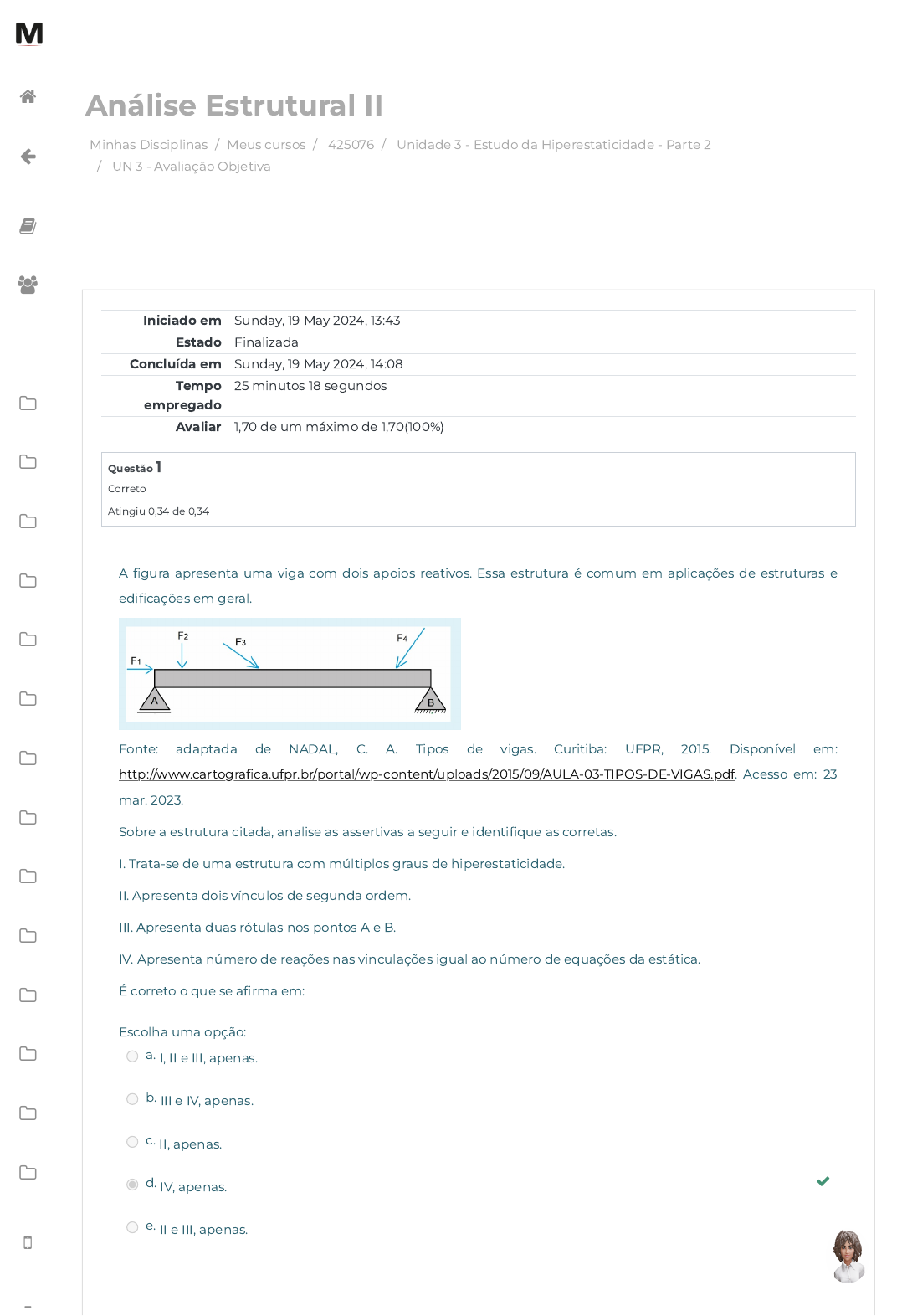 Minhas Disciplinas / Meus cursos / 425076 / Unidade 3 - Estudo da Hiperestaticidade - Parte 2 / UN 3 - Avaliação Objetiva Análise Estrutural II Iniciado em Sunday, 19 May 2024, 13:43 Estado Finalizada Concluída em Sunday, 19 May 2024, 14:08 Tempo empregado 25 minutos 18 segundos Avaliar 1,70 de um máximo de 1,70(100%) Questão 1 Correto Atingiu 0,34 de 0,34 A �gura apresenta uma viga com dois apoios reativos. Essa estrutura é comum em aplicações de estruturas e edi�cações em geral. Fonte: adaptada de NADAL, C. A. Tipos de vigas. Curitiba: UFPR, 2015. Disponível em: http://www.cartogra�ca.ufpr.br/portal/wp-content/uploads/2015/09/AULA-03-TIPOS-DE-VIGAS.pdf. Acesso em: 23 mar. 2023. Sobre a estrutura citada, analise as assertivas a seguir e identi�que as corretas. I. Trata-se de uma estrutura com múltiplos graus de hiperestaticidade. II. Apresenta dois vínculos de segunda ordem. III. Apresenta duas rótulas nos pontos A e B. IV. Apresenta número de reações nas vinculações igual ao número de equações da estática. É correto o que se a�rma em: Escolha uma opção: a. I, II e III, apenas. b. III e IV, apenas. c. II, apenas. d. IV, apenas. e. II e III, apenas. https://avap.multivix.edu.br/my/ https://avap.multivix.edu.br/course/view.php?id=26576 https://avap.multivix.edu.br/course/view.php?id=26576§ion=4 https://avap.multivix.edu.br/mod/quiz/view.php?id=1644743 http://www.cartografica.ufpr.br/portal/wp-content/uploads/2015/09/AULA-03-TIPOS-DE-VIGAS.pdf https://avap.multivix.edu.br/my/ https://avap.multivix.edu.br/course/view.php?id=26576 https://avap.multivix.edu.br/user/index.php?id=26576 https://avap.multivix.edu.br/course/view.php?id=26576§ion=1 https://avap.multivix.edu.br/course/view.php?id=26576§ion=2 https://avap.multivix.edu.br/course/view.php?id=26576§ion=3 https://avap.multivix.edu.br/course/view.php?id=26576§ion=4 https://avap.multivix.edu.br/course/view.php?id=26576§ion=5 https://avap.multivix.edu.br/course/view.php?id=26576§ion=6 https://avap.multivix.edu.br/course/view.php?id=26576§ion=7 https://avap.multivix.edu.br/course/view.php?id=26576§ion=8 https://avap.multivix.edu.br/course/view.php?id=26576§ion=9 https://avap.multivix.edu.br/course/view.php?id=26576§ion=10 https://avap.multivix.edu.br/course/view.php?id=26576§ion=11 https://avap.multivix.edu.br/course/view.php?id=26576§ion=12 https://avap.multivix.edu.br/course/view.php?id=26576§ion=13 https://avap.multivix.edu.br/course/view.php?id=26576§ion=14 https://avap.multivix.edu.br/hooks/portal/ https://avap.multivix.edu.br/mod/page/view.php?id=1252%2F%22%20target%3D%22_blank https://avap.multivix.edu.br/ https://avap.multivix.edu.br/ https://avap.multivix.edu.br/ https://avap.multivix.edu.br/ https://avap.multivix.edu.br/ https://avap.multivix.edu.br/ Questão 2 Correto Atingiu 0,34 de 0,34 A �gura apresenta uma estrutura utilizada em aplicações e obras da área de construção civil. Sobre a estrutura citada, analise as assertivas a seguir e identi�que as corretas. I. Apresenta número de equações de equilíbrio externo igual a 3. II. A estrutura é isostática e apresenta uma rótula. III. A estrutura apresenta um vínculo de terceiro grau. IV. Apresenta número de equações de equilíbrio interno igual a 1. São verdadeiras: Escolha uma opção: a. II e IV, apenas. b. IV, apenas. c. I e II, apenas. d. I, II e IV, apenas. e. II, III e IV, apenas. https://avap.multivix.edu.br/my/ https://avap.multivix.edu.br/course/view.php?id=26576 https://avap.multivix.edu.br/user/index.php?id=26576 https://avap.multivix.edu.br/course/view.php?id=26576§ion=1 https://avap.multivix.edu.br/course/view.php?id=26576§ion=2 https://avap.multivix.edu.br/course/view.php?id=26576§ion=3 https://avap.multivix.edu.br/course/view.php?id=26576§ion=4 https://avap.multivix.edu.br/course/view.php?id=26576§ion=5 https://avap.multivix.edu.br/course/view.php?id=26576§ion=6 https://avap.multivix.edu.br/course/view.php?id=26576§ion=7 https://avap.multivix.edu.br/course/view.php?id=26576§ion=8 https://avap.multivix.edu.br/course/view.php?id=26576§ion=9 https://avap.multivix.edu.br/course/view.php?id=26576§ion=10 https://avap.multivix.edu.br/course/view.php?id=26576§ion=11 https://avap.multivix.edu.br/course/view.php?id=26576§ion=12 https://avap.multivix.edu.br/course/view.php?id=26576§ion=13 https://avap.multivix.edu.br/course/view.php?id=26576§ion=14 https://avap.multivix.edu.br/hooks/portal/ https://avap.multivix.edu.br/mod/page/view.php?id=1252%2F%22%20target%3D%22_blank https://avap.multivix.edu.br/ https://avap.multivix.edu.br/ https://avap.multivix.edu.br/ https://avap.multivix.edu.br/ https://avap.multivix.edu.br/ https://avap.multivix.edu.br/ Questão 3 Correto Atingiu 0,34 de 0,34 A �gura mostra uma estrutura de pórtico com anéis fechados. Essas estruturas são utilizadas comumente em obras de expansão de centros comerciais e obras de segurança. Sobre as estruturas citadas, analise as assertivas a seguir e identi�que as corretas. I. Nesse tipo de estrutura, para cada anel, acrescenta-se mais três incógnitas ao número de apoios. II. A estrutura citada é isostática com um apoio de segunda ordem. III. A estrutura citada apresenta um grau hiperestático. IV. A estrutura apresenta-se hipoestática. É correto o que se a�rma em: Escolha uma opção: a. II, apenas. b. I, III e IV, apenas. c. I, II, III e IV. d. I, apenas. e. IV, apenas. https://avap.multivix.edu.br/my/ https://avap.multivix.edu.br/course/view.php?id=26576 https://avap.multivix.edu.br/user/index.php?id=26576 https://avap.multivix.edu.br/course/view.php?id=26576§ion=1 https://avap.multivix.edu.br/course/view.php?id=26576§ion=2 https://avap.multivix.edu.br/course/view.php?id=26576§ion=3 https://avap.multivix.edu.br/course/view.php?id=26576§ion=4 https://avap.multivix.edu.br/course/view.php?id=26576§ion=5 https://avap.multivix.edu.br/course/view.php?id=26576§ion=6 https://avap.multivix.edu.br/course/view.php?id