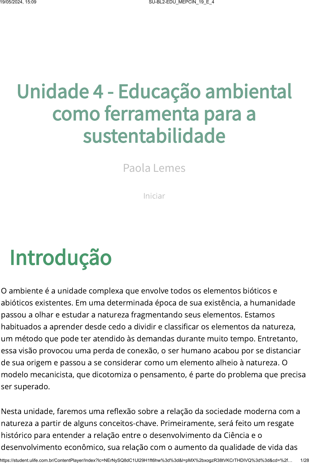 Introdução O ambiente é a unidade complexa que envolve todos os elementos bióticos e abióticos existentes. Em uma determinada época de sua existência, a humanidade passou a olhar e estudar a natureza fragmentando seus elementos. Estamos habituados a aprender desde cedo a dividir e classi�car os elementos da natureza, um método que pode ter atendido às demandas durante muito tempo. Entretanto, essa visão provocou uma perda de conexão, o ser humano acabou por se distanciar de sua origem e passou a se considerar como um elemento alheio à natureza. O modelo mecanicista, que dicotomiza o pensamento, é parte do problema que precisa ser superado. Nesta unidade, faremos uma re�exão sobre a relação da sociedade moderna com a natureza a partir de alguns conceitos-chave. Primeiramente, será feito um resgate histórico para entender a relação entre o desenvolvimento da Ciência e o desenvolvimento econômico, sua relação com o aumento da qualidade de vida das Unidade 4 - Educação ambiental como ferramenta para a sustentabilidade Paola Lemes Iniciar 19/05/2024, 15:09 SU-BL2-EDU_MEPCIN_19_E_4 https://student.ulife.com.br/ContentPlayer/Index?lc=NErNySQ8dC1Ul29H1ft6hw%3d%3d&l=pMX%2bxogzR38tVKCrTHDIVQ%3d%3d&cd=%2f… 1/28 populações e a consequente degradação ambiental que, historicamente, acompanhou este desenvolvimento. Em seguida, serão apresentados conceitos referentes às concepções de meio ambiente e o surgimento da ideia de desenvolvimento sustentável, seguidos de uma discussão a respeito das diferenças entre crescimento econômico e desenvolvimento econômico. Você já havia parado para pensar nessa questão? Seguiremos com a apresentação da abordagem da educação ambiental, seus pilares históricos no Brasil e no mundo e sua importância estratégica como ferramenta de conscientização e transformação socioambiental aliada ao ensino de ciências naturais. Finalmente, fecharemos a unidade apresentando as bases legais brasileiras para a conservação do meio ambiente e pensando em alternativas para diminuir os impactos e os vestígios deixados pela sociedade de consumos que somente começaram a ser questionados muito recentemente. Vamos juntos? Bons Estudos! 1. O papel da Ciência para o desenvolvimento econômico A relação de culto entre o homem e a natureza e a visão de natureza como mãe provedora foram, por muitos séculos, permeadas por certa relação com o elemento divino: a natureza era vista como uma divindade, da qual provinham todos os deuses, bem como os recursos necessários à existência. Como já discutimos brevemente em unidades anteriores, embora a exploração da natureza aconteça desde tempos imemoriais, essa visão de mundo intensi�cou-se a partir da expansão da visão mecanicista de mundo inserida pelo racionalismo cartesiano e concretizada com a revolução trazida pela matemática newtoniana no século XVIII. Neste momento, a sociedade ocidental moderna inaugura uma nova 19/05/2024, 15:09 SU-BL2-EDU_MEPCIN_19_E_4 https://student.ulife.com.br/ContentPlayer/Index?lc=NErNySQ8dC1Ul29H1ft6hw%3d%3d&l=pMX%2bxogzR38tVKCrTHDIVQ%3d%3d&cd=%2f… 2/28 visão de natureza: a natureza como objeto, uma fonte inesgotável de recursos que poderiam ser explorados e dominados pelo homem. Figura 1. Réplica das representações artísticas encontradas no Caldeirão de Gundestrup (150 a. C), exemplo conhecido do trabalho de prata da Idade do Ferro na Europa, mostrando relação de dominação do homem com os elementos da natureza. Fonte: Blog História Ancestral Essa mudança de paradigma interferiu fortemente na relação humana com a natureza, já perdura por mais de dois séculos e revolucionou o mundo em que vivemos em diversos aspectos, inclusive na concepção de Ciência, na formação dos cientistas e na fragmentação dos saberes (por exemplo, a dicotomia entre ciências da natureza, ciências exatas e ciências humanas). As inovações tecnológicas trouxeram a Ciência para toda parte: há Ciência nas construções que elaboramos, nas comunidades que criamos, no alimento que consumimos e no modo como entendemos a natureza e até nosso próprio corpo. 19/05/2024, 15:09 SU-BL2-EDU_MEPCIN_19_E_4 https://student.ulife.com.br/ContentPlayer/Index?lc=NErNySQ8dC1Ul29H1ft6hw%3d%3d&l=pMX%2bxogzR38tVKCrTHDIVQ%3d%3d&cd=%2f… 3/28 Figura 2. O Homem Vitruviano, de Leonardo da Vinci (1490), analisando as proporções do corpo humano masculino. Fonte: Pinterest. A Ciência está sempre questionando por que as coisas são como são e como podem ser melhoradas. O que somos no grande plano do universo. Questiona de onde viemos e para onde iremos. Abrange desde as profundezas do universo, até o dispositivo que você está usando para acessar este trabalho. A partir da era moderna e, principalmente, durante o iluminismo, as revoluções cientí�cas trouxeram ideias sobre cálculo, a teoria atômica e a gravidade. A revolução industrial, por meio das inovações tecnológicas, provocou uma explosão de produção, crescimento e desenvolvimento social. O modo de funcionamento iterativo da Ciência, aliado ao seu método repetível e falseável, favoreceu a criação e o aperfeiçoamento de tecnologias, que podem ser 19/05/2024, 15:09 SU-BL2-EDU_MEPCIN_19_E_4 https://student.ulife.com.br/ContentPlayer/Index?lc=NErNySQ8dC1Ul29H1ft6hw%3d%3d&l=pMX%2bxogzR38tVKCrTHDIVQ%3d%3d&cd=%2f… 4/28 substituídas ao tornarem-se obsoletas. Revolucionou os meios de transporte, inicialmente, cobrindo a Europa com uma malha ferroviária, que se expandiu para o mundo, posteriormente, desenvolvendo carros e aviões. Revolucionou a agricultura, permitindo que aumentássemos exponencialmente a nossa produção de alimentos, contrariando as antigas previsões demográ�cas. E mais recentemente, na era digital, os cientistas ajudaram a conceber a internet como a conhecemos, para compartilharmos ideias e mais pesquisas. Os avanços na medicina e na agricultura salvaram mais 
