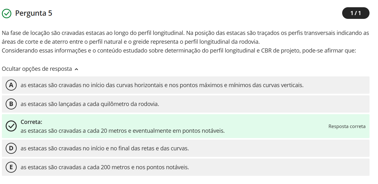 Na fase de locação são cravadas estacas ao longo do perfil longitudinal. Na posição das estacas são traçados os perfis transversais indicando as áreas de corte e de aterro entre o perfil natural e o greide representa o perfil longitudinal da rodovia. Considerando essas informações e o conteúdo estudado sobre determinação do perfil longitudinal e CBR de projeto, pode-se afirmar que: A as estacas são cravadas no início das curvas horizontais e nos pontos máximos e mínimos das curvas verticais. B as estacas são lançadas a cada quilômetro da rodovia. Correta: Resposta correta as estacas são cravadas a cada 20 metros e eventualmente em pontos notáveis. D as estacas são cravadas no início e no final das retas e das curvas. E as estacas são cravadas a cada 200 metros e nos pontos notáveis.