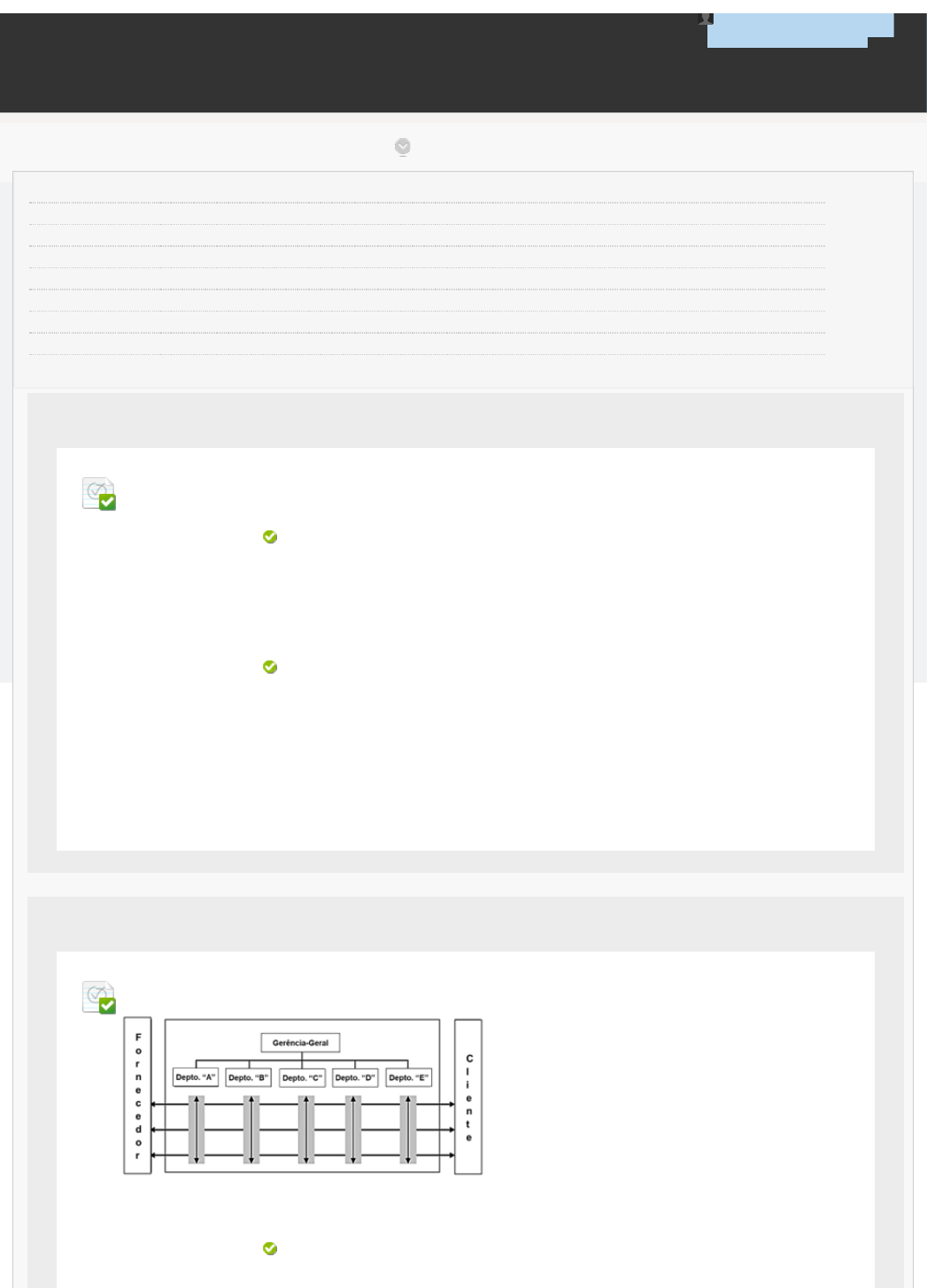 UNIP EAD BIBLIOTECAS MURAL DO ALUNO TUTORIAIS YSABELLE SILVA CONTEÚDOS ACADÊMICOS Revisar envio do teste: QUESTIONÁRIO UNIDADE IPROCESSOS ORGANIZACIONAIS 5381-60_59101_R_E1_20241 CONTEÚDO Usuário YSABELLE BARBOSA DA SILVA Curso PROCESSOS ORGANIZACIONAIS Teste QUESTIONÁRIO UNIDADE I Iniciado 19/05/24 16:09 Enviado 19/05/24 16:12 Status Completada Resultado da tentativa 3 em 3 pontos Tempo decorrido 3 minutos Resultados exibidos Todas as respostas, Respostas enviadas, Respostas corretas, Comentários, Perguntas respondidas incorretamente Pergunta 1 Resposta Selecionada: d. Respostas: a. b. c. d. e. Comentário da resposta: Apesar das complicações e da necessidade de evolução, a estrutura departamental se mantém resistente, em função de alguns benefícios e compensações oferecidos; entre eles podemos citar a(o): Centralização do controle e coordenação de esforços. Flexibilidade dos processos de negócios. Rapidez às respostas das novas demandas dos clientes. Facilidade de adaptação às mudanças ambientais. Centralização do controle e coordenação de esforços. Desenvolvimento multifuncional dos colaboradores. Resposta: D Comentário: existem alguns benefícios e compensações, oferecidos pela estrutura organizacional vertical e departamental, como: desenvolvimento e aproveitamento de habilidades e especializações individuais; divisão e distribuição do trabalho e dos centros de custos; grandes economias de escala na utilização de recursos, instalações e equipamentos; centralização do controle e coordenação de esforços; e a de"nição clara do plano de carreira dos colaboradores em cada área funcional. Pergunta 2 Resposta Selecionada: c. Respostas: Analisando a figura a seguir, verifica-se a representação do funcionamento de: Fonte: livro-texto. Estrutura vertical. 0,3 em 0,3 pontos 0,3 em 0,3 pontos 19/05/2024 16:12 Página 1 de 5 a. b. c. d. e. Comentário da resposta: Estrutura horizontal. Estrutura matricial. Estrutura vertical. Estrutura #exível. Estrutura por processos. Resposta: C Comentário: a "gura demonstra a estrutura vertical e a transversatilidade do seu #uxo vertical e o #uxo horizontal do processo natural do trabalho realizado. Os departamentos mantêm um #uxo de informações e de relacionamentos verticais, de cima para baixo, as decisões e diretrizes, de baixo para cima, as prestações de contas e informações para o controle das atividades realizadas. Pergunta 3 Resposta Selecionada: e. Respostas: a. b. c. d. e. Comentário da resposta: Sobre os processos pode-se a"rmar que: Representam um conjunto de tarefas, logicamente arranjadas e ordenadas para gerar resultados especí"cos. Correspondem a um conjunto de responsabilidades, autoridades, comunicação e decisões. Expressam o poder hierárquico que deve ser exercido pelos colaboradores da organização, em todos os níveis. Referem-se a um grupo de atividades organizadas, para atingir um "m, que têm uma data de início e uma data de término. Declaração de intenções que se pretende alcançar em um futuro próximo. Representam um conjunto de tarefas, logicamente arranjadas e ordenadas para gerar resultados especí"cos. Resposta: E Comentário: os processos correspondem ao conjunto de tarefas, logicamente arranjadas e ordenadas, de forma a gerar resultados identi"cáveis, como: bens, serviços, informações ou conhecimentos, direcionados a clientes internos ou externos, que, ao "nal, avaliarão e orientarão os ajustes necessários. Pergunta 4 Resposta Selecionada: a. Respostas: a. b. c. d. e. Comentário da resposta: Entre os elementos que compõem um processo, encontra-se: Controle e Avaliação. Controle e Avaliação. Responsabilidade. Autoridade. Fornecedores de insumos. Usuários externos. Resposta: A Comentário: são elementos de um processo, os Objetivos: constituem-se na razão da existência do processo; Entradas: recursos e a energia necessários para o seu funcionamento; Transformação: conjunto de atividades 0,3 em 0,3 pontos 0,3 em 0,3 pontos 19/05/2024 16:12 Página 2 de 5 e tarefas, lógica e sequencialmente arranjados, de modo a transformar e agregar valor aos insumos, gerando os produtos e serviços; Saídas: resultados do processo de transformação, que se resumem em produtos, serviços e informações; Controle e avaliação: compostos pelas atividades de medir, avaliar, padrões e corrigir. Pergunta 5 Resposta Selecionada: e. Respostas: a. b. c. d. e. Comentário da resposta: Em um desdobramento natural, a hierarquia do processo orienta a sua subdivisão. Essas subdivisões lógicas, que seguem esta hierarquia, orientam-se pelo método top down, o qual consiste em uma técnica de decomposição, entendimento, análise e solução de problemas. Entre as subdivisões, resultantes do desdobramento de processos, encontram-se os(as): Atividades. Departamentos. Áreas funcionais. Divisões de negócios. Unidades estratégicas. Atividades. Resposta: E Comentário: o desdobramento consiste em uma técnica cartesiana de decomposição e detalhamento para o entendimento, a análise e a solução de problemas. Aqui, é utilizada para a análise e o detalhamento, até um nível que permita ao usuário uma intervenção e uma alteração do funcionamento do processo, no intuito de corrigi-lo e ajustá-lo; as subdivisões são: macroprocesso, processo, subprocesso, atividades, tarefas e ações. Pergunta 6 Resposta Selecionada: b. Respostas: a. b. c. d. e. Comentário da resposta: O estudo sistemático, a análise e a identi"cação do valor ótimo para um resultado, produto ou serviço, veri"cando-se, uma a uma, as atividades envolvidas e os respectivos dispêndios efetivados para a sua geração e a sua conclusão, consiste em: Engenharia e análise de valor. Desdobramento de processos. Engenharia e análise de valor. Elaboração da estrutura organizacional. Análise da matriz SWOT. Todas as alternativas estão corretas. Resposta: B Comentário: na engenhar