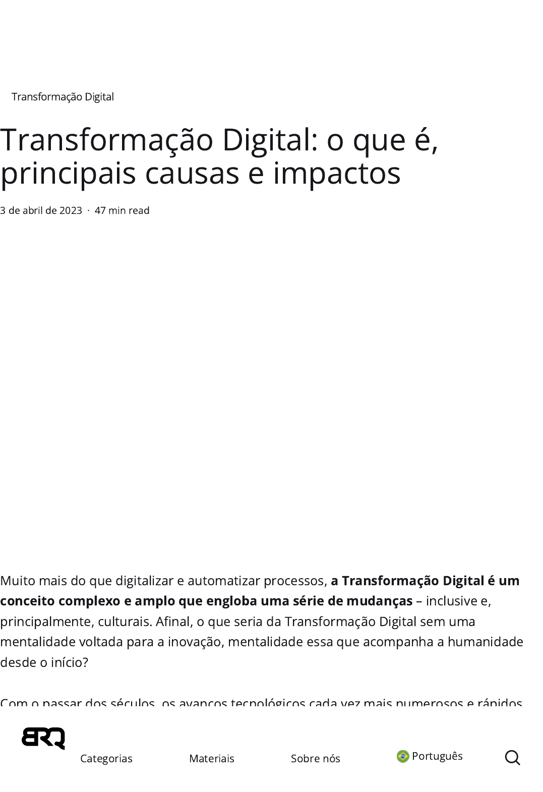 17/09/2023, 16:02 Transformação Digital: o que é, principais causas e impactos https://blog.brq.com/transformacao-digital-o-que-e-principais-causas-e-impactos/#:~:text=Além disso%2C a Transformação Digital também pod… 1/40 Transformação Digital Transformação Digital: o que é, principais causas e impactos 3 de abril de 2023 · 47 min read Muito mais do que digitalizar e automatizar processos, a Transformação Digital é um conceito complexo e amplo que engloba uma série de mudanças – inclusive e, principalmente, culturais. A�nal, o que seria da Transformação Digital sem uma mentalidade voltada para a inovação, mentalidade essa que acompanha a humanidade desde o início? Com o passar dos séculos, os avanços tecnológicos cada vez mais numerosos e rápidos iam fomentando a cultura da inovação; como consequência, aumentando o estímulo à Categorias Materiais Sobre nós Português https://blog.brq.com/categoria/transformacao-digital/ https://blog.brq.com/ https://blog.brq.com/materiais/ 17/09/2023, 16:02 Transformação Digital: o que é, principais causas e impactos https://blog.brq.com/transformacao-digital-o-que-e-principais-causas-e-impactos/#:~:text=Além disso%2C a Transformação Digital também pod… 2/40 criação de novas soluções que transformassem ou melhorassem processos… até o surgimento das primeiras tecnologias digitais. Assim chegamos aos dias atuais, em um mundo cada vez mais digitalizado que vive sua quarta revolução industrial – a era da Inteligência Arti�cial. Mais do que nunca, está claro que não existem limites para o que pode ser transformado digitalmente. Em todos os setores da indústria e da sociedade a Transformação Digital está presente. Em alguns lugares do mundo mais do que em outros, mas é só uma questão de tempo. Por isso, é fundamental entender melhor esse termo tão utilizado e, mais importante: por que essas duas palavras vêm norteando a evolução da humanidade nas últimas décadas. Com esse artigo convidamos você para uma imersão em Transformação Digital. Exploraremos seus principais aspectos, objetivos, benefícios, desa�os e tendências. Também veremos como aplicar a Transformação Digital na empresa para se adaptar a um mundo cada vez mais digital. Tudo certo para o nosso mergulho? Boa leitura! O que é Transformação Digital? Basicamente, trata-se da digitalização de processos, usando ferramentas e tecnologias, com o objetivo de otimizar seu desempenho e e�ciência. Impulsionada pelas inovações tecnológicas, a Transformação Digital é uma realidade para empresas de todos os setores. Além de fortalecer a presença digital de uma marca, ela representa a implementação de soluções e automatizações nas mais diversas tarefas do dia a dia da empresa. Dessa forma, engana-se quem pensa que a Transformação Digital se limita apenas a um per�l em uma rede social ou a novos equipamentos. Na verdade, é um movimento muito mais profundo e que deve alterar não apenas o “�m” (ou o que é entregue ao cliente), mas a forma como um serviço, produto ou qualquer tipo de oferta são produzidos. Da gestão ao atendimento, tudo é transformado: desde �uxos simples até a cultura organizacional. O que ocasionou a Transformação Digital? Categorias Materiais Sobre nós Português https://blog.brq.com/industria-4-0/ https://blog.brq.com/ https://blog.brq.com/materiais/ 17/09/2023, 16:02 Transformação Digital: o que é, principais causas e impactos https://blog.brq.com/transformacao-digital-o-que-e-principais-causas-e-impactos/#:~:text=Além disso%2C a Transformação Digital também pod… 3/40 A Transformação Digital foi ocasionada principalmente pela evolução das tecnologias digitais e sua crescente implementação em todos os setores da indústria por empresas que passaram a usufruir de todos os seus benefícios, tais como: Automação de processos; Melhora na qualidade de produtos e serviços; Criação de novos modelos de negócios. Com o avanço da internet, principalmente na última década, pudemos observar a crescente demanda dos consumidores por experiências personalizadas e interativas. Esse fator impulsionou a Transformação Digital, ao levar as empresas a buscar novas tecnologias digitais para desenvolver produtos e serviços não apenas mais inovadores, mas, que atendam necessidades cada vez mais especí�cas. Nesse contexto surgiram conceitos como User Experience e Customer Experience, fazendo com que a experiência se tornasse o principal fator levado em consideração no desenvolvimento de produtos e serviços. Mais recentemente, a Transformação Digital foi novamente impulsionada – dessa vez, em função da pandemia de COVID-19. Empresas de todo o mundo foram obrigadas, em um Categorias Materiais Sobre nós Português https://blog.brq.com/ https://blog.brq.com/materiais/ 17/09/2023, 16:02 Transformação Digital: o que é, principais causas e impactos https://blog.brq.com/transformacao-digital-o-que-e-principais-causas-e-impactos/#:~:text=Além disso%2C a Transformação Digital também pod… 4/40 curto espaço de tempo, a implementar soluções digitais para se adaptarem ao distanciamento social e outras restrições impostas pela doença. A diferença entre as organizações que já estavam aplicando a Transformação Digital (e que conseguiram se adaptar rapidamente) e as que não estavam atualizadas se tornou muito mais evidente. Entre os motivos pelos quais muitas empresas fecharam as portas durante a pandemia está o “atraso digital”, que impediu que os negócios prosperassem diante da nova realidade. Qual é o objetivo da Transformação Digital? Para as empresas, o principal objetivo da Transformação Digital é aumentar a e�ciência. Atrelado a esse, temos muitos outros: aumentar a produtividade, fomentar a inovação, se adaptar rapidamente às constantes mudanças do mercado e do mundo, desenvolver produtos e serviços cada vez melhores,