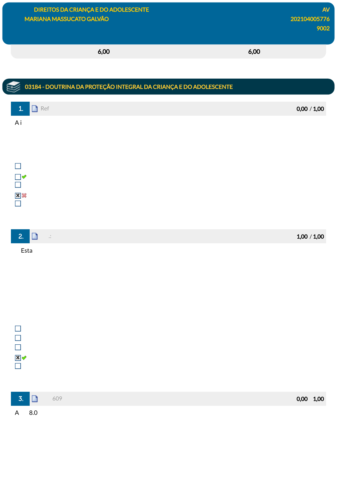 Disciplina: DIREITOS DA CRIANÇA E DO ADOLESCENTE AV Aluno: MARIANA MASSUCATO GALVÃO 202104005776 Turma: 9002 ARA0580_AV_202104005776 (AG) 05/10/2022 15:34:37 (F) Avaliação: 6,00 pts Nota SIA: 6,00 pts 03184 - DOUTRINA DA PROTEÇÃO INTEGRAL DA CRIANÇA E DO ADOLESCENTE 1. Ref.: 6091876 Pontos: 0,00 / 1,00 A ideia aqui, no fundo, deste princípio é a de que aquele ente federativo que está mais próximo das crianças e dos adolescentes deveria tomar maiores atitudes para concretizar e dar efetividade ao complexo de direitos que compõem a proteção integral. Marque a opção que corresponda ao princípio fundamental da criança e do adolescente descrito acima. Princípio da independência dos entes federativos. Princípio da municipalização. Princípio da liberdade do direito de ir e vir. Princípio da separação dos poderes. Princípio da liberdade política. 2. Ref.: 6091869 Pontos: 1,00 / 1,00 O Estatuto da Criança e do Adolescente é o diploma legal responsável por dispor sobre a proteção integral de crianças e adolescentes, segundo seu art. 2o. No que se refere ao ECA, julgue os itens a seguir e, ao �nal, assinale a alternativa correta: I - Considera-se adolescente aquela entre doze e dezoito anos de idade. II - Considera-se adolescente a pessoa entre doze e dezessete anos. III - Em hipótese alguma, o ECA deve ser aplicado em casos envolvendo pessoas entre dezoito e vinte e um anos de díade. Apenas o item II e III. Apenas o item II é verdadeiro. Apenas os itens I e II são verdadeiros. Apenas o item I é verdadeiro. Apenas o item III é verdadeiro. 3. Ref.: 6091672 Pontos: 0,00 / 1,00 A Lei 8.069/90 apresenta em seu art. 4o, garantias prioridade absoluta da criança e do adolescente. Sobre o tema, analise os itens a seguir e, em seguida, assinale a alternativa que apresenta corretamente tais garantias. I - Primazia de receber proteção e socorro em quaisquer circunstâncias. II - Precedência de atendimento nos serviços públicos ou de relevância pública. III - Preferência na formulação e na execução das políticas sociais públicas. IV - Destinação privilegiada de recursos públicos nas áreas relacionadas com a proteção à infância e à juventude. javascript:alert('C%C3%B3digo da quest%C3%A3o: 6091876.'); javascript:alert('C%C3%B3digo da quest%C3%A3o: 6091876.'); javascript:alert('C%C3%B3digo da quest%C3%A3o: 6091869.'); javascript:alert('C%C3%B3digo da quest%C3%A3o: 6091869.'); javascript:alert('C%C3%B3digo da quest%C3%A3o: 6091672.'); javascript:alert('C%C3%B3digo da quest%C3%A3o: 6091672.'); V - Primazia de receber proteção e socorro em quaisquer circunstâncias, ainda que a criança não tenha se ferido e haja outro adulto gravemente ferido. Apenas os itens I, III e IV estão corretos. Apenas os itens III, IV e V estão corretos. Apenas os itens II, III e V estão corretos. Apenas os itens I, II, III e IV estão corretos. Apenas os itens I, II, III e V estão corretos. 03185 - PROTEÇÃO E DEFESA À CRIANÇA E ADOLESCENTE 4. Ref.: 6091885 Pontos: 1,00 / 1,00 (Prefeitura de Santa Luzia D'Oeste-RO / 2020) Prevê o Estatuto da Criança e do Adolescente que imediatamente após o acolhimento da criança ou do adolescente, a entidade responsável pelo programa de acolhimento institucional ou familiar elaborará um plano individual de atendimento. Constarão do plano individual, dentre outros: os compromissos assumidos pelos pro�ssionais das instituições. a previsão das atividades a serem desenvolvidas com os dirigentes do acolhimento. os resultados da avaliação interdisciplinar. a assistência judiciária gratuita e integral aos necessitados. a defesa técnica por advogado. 5. Ref.: 6091774 Pontos: 1,00 / 1,00 (Prefeitura de Crato-CE / 2021) A legislação penal brasileira considera as crianças e os adolescentes como sujeitos inimputáveis, ou seja, são, por presunção absoluta, excluídos penalmente por não possuírem plena capacidade de compreender a gravidade do ato praticado. Desta feita, diante da prática de ato infracional, tais indivíduos estão submetidos à diretrizes expostas em legislação especial. Perante tal a�rmativa, é possível estabelecer a prática de algumas medidas possíveis por parte da autoridade responsável para aplicá-las, à exemplo da advertência. A partir das disposições da Lei 8.069/1990 sobre os atos infracionais, é correto a�rmar que: não é possível determinar que o adolescente promova o devido ressarcimento à vítima ou compense o prejuízo. obrigação de reparar o dano, liberdade assistida e internação em ambiente prisional são medidas cabíveis. a prestação de serviços comunitários está consubstanciada no cumprimento de tarefas onerosas de interesse particular. o regime de semiliberdade pode ser determinado desde o início, ou como forma de transição para o meio aberto, possibilitada a realização de atividades externas, independentemente de autorização judicial. os adolescentes portadores de doença ou de�ciência mental receberão o mesmo tratamento conferido aos demais infratores, sem nenhum tipo de distinção. 6. Ref.: 6091777 Pontos: 0,00 / 1,00 (MPE-RR / 2019 - adaptada) A Lei n. 8.069/90 (Estatuto da Criança e do Adolescente) é o diploma legal responsável por garantir a proteção integral da criança e do adolescente, cujo fundamento é constitucional. Analise os itens a seguir e assinale a alternativa que apresenta corretamente medidas que, segundo o ECA, podem ser aplicadas aos pais ou responsável. I - Obrigação de encaminhar a criança ou adolescente a tratamento especializado. II - Comparecimento em juízo, no prazo e nas condições �xadas pelo juiz, para informar e justi�car as atividades. III - Advertência javascript:alert('C%C3%B3digo da quest%C3%A3o: 6091885.'); javascript:alert('C%C3%B3digo da quest%C3%A3o: 6091885.'); javascript:alert('C%C3%B3digo da quest%C3%A3o: 6091774.'); javascript:alert('C%C3%B3digo da quest%C3%A3o: 6091774.'); javasc