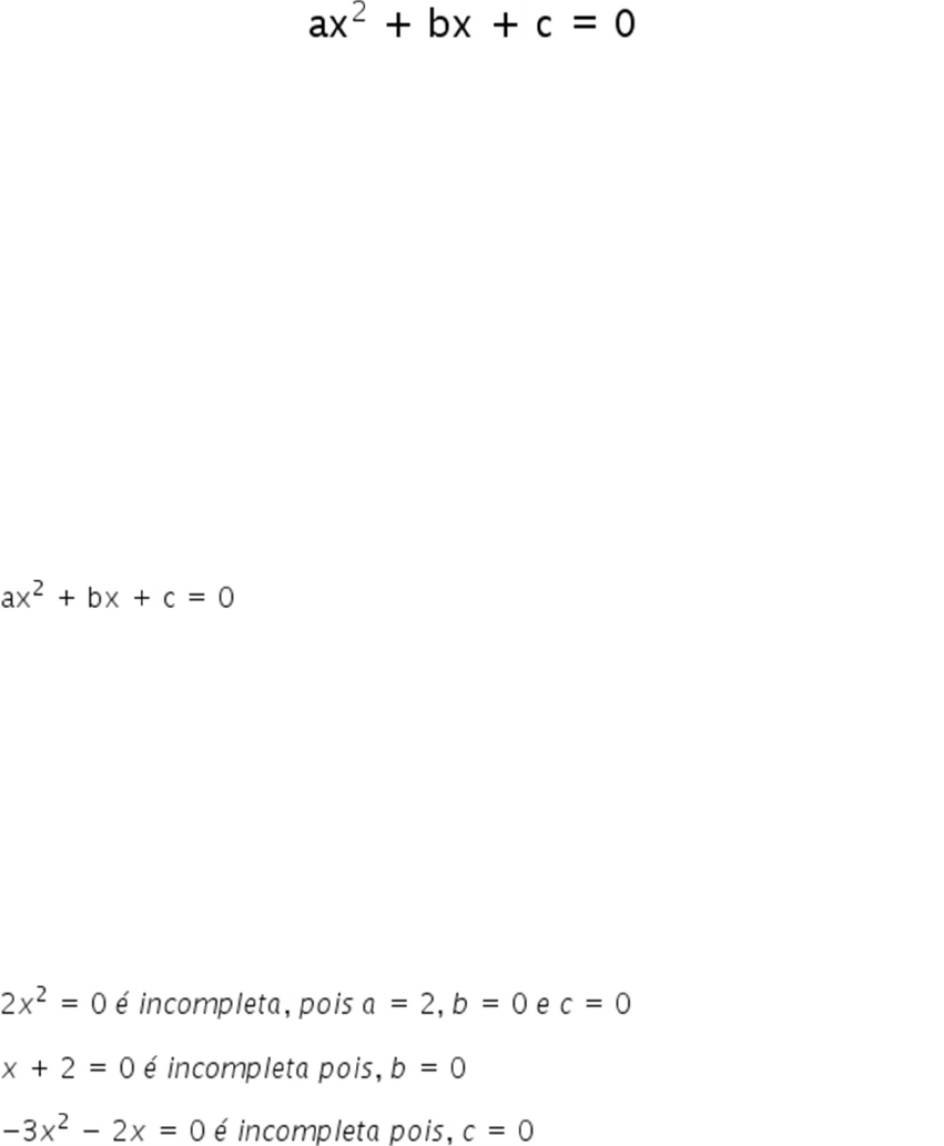 EQUAÇÃO DO 2º GRAU A equação do segundo grau recebe esse nome porque é uma equação polinomial cujo termo de maior grau está elevado ao quadrado. Também chamada de equação quadrática, é representada por: Numa equação do 2º grau, o x é a incógnita e representa um valor desconhecido. Já as letras a, b e c são chamados coeficientes da equação. Os coeficientes são números reais e o coeficiente a tem que ser diferente de zero, pois do contrário passa a ser uma equação do 1º grau. Resolver uma equação de segundo grau, significa determinar os valores reais de x, que tornam a equação verdadeira. Esses valores são denominados raízes da equação. Sempre terão dois valores (raízes) que satisfarão essas equações. Equações do 2º Grau Completas e Incompletas As equações do 2º grau completas são aquelas que apresentam todos os coeficientes, ou seja, a, b e c são diferentes de zero (a, b, c ≠ 0). Por exemplo: 5x2 + 2x + 2 = 0 é completa, pois todos os coeficientes são diferentes de zero (a = 5, b = 2 e c = 2). Uma equação do segundo grau é incompleta quando b = 0 ou c = 0 ou b = c = 0. Por exemplo equações do 2° grau incompletas EXERCÍCIOS 01. Para os coeficientes indicados em cada item, escreva uma equação do 2º grau forma. a) a = 2; b = − 3 e c = 8 b) a = − 1; b = 5 e c = 0 c) a = 1; b = − 4 e c = − 5 d) a = 0,3; b = 1,2 e c = − 3 e) a = 6; b = 0 e c = − 54 02. Indique os coeficientes de cada equação e classifique-as em completa ou incompleta. a) 2𝑥2 − 6𝑥 − 8 = 0 b) −𝑥2 + 3𝑥 = 0 c) 1 3 𝑥2 + 0,3𝑥 − 10 = 0 d) 4𝑥2 − 16 = 0 03. Escreva as equações na forma simples e indique seus coeficientes. a) 2𝑥2 + 4𝑥 = −3𝑥2 + 𝑥 − 5 b) 𝑥2 − 3𝑥 + 4 = −7𝑥 + 10 c) (𝑥 + 2) ∙ (𝑥 − 4) = 𝑥 + 2 d) 𝑥 ∙ (2𝑥 − 8) = −𝑥2 + 15x 04. Identifique a, b e c nas funções quadráticas abaixo: a) x2 – 5x + 6 = 0 b) –2x2 + 8x – 8 = 0 c) x2 = 4 d) x2 – x = – (x + 15) 05. Quais das equações abaixo são do 2º grau? ( ) x – 5x + 6 = 0 ( ) x² - 7x + 10 = 0 ( ) 0x² + 4x – 3 = 0 ( ) 2x³ - 8x² - 2 = 0 ( ) 4x² - 1 = 0 ( ) x² - 7x 06. Classifique as equações do 2º grau em completas ou incompletas e determine os coeficientes a, b, c. a) x² – 7x + 10 = 0 b) 4x² – 4x + 1 = 0 c) –x² – 7x = 0 d) x² – 16 = 0 e) x² + 0x + 0 = 0 f) 5x2 – 3x – 2 = 0 g) 3x2 + 55 = 0 h) x2 – 6x = 0 i) x2 – 10x + 25 = 0 Raízes de equação de 2º grau Encontrar as raízes de uma equação de 2º significa encontrar os valores de x que tornam o valor da expressão “ax2 + bx + c” igual a zero. Dizemos em valores ou raízes, sempre no plural, porque por ser formada por uma expressão de grau 2, toda equação do 2º grau sempre possui duas raízes, ou dois valores de x que fazem com que a expressão resulte no valor zero. Temos algumas maneiras utilizadas para determinar as raízes das equações do 2º grau. Uma delas, é a uma das fórmulas matemáticas mais conhecidas no planeta: a fórmula de Bhaskara. Fórmula de Baskara Para encontrar as raízes de uma equação do segundo grau ax2 + bx + c utilizamos a fórmula de Bhaskara, que tem a forma: 𝑥 = −𝑏 ± √𝑏2 − 4 ∙ 𝑎 ∙ 𝑐 2 ∙ 𝑎 Assim, basta substituir os valores numéricos dos coeficientes a, b e c da equação na fórmula. Exemplos Encontre as raízes da equação 3x2 – 2x – 8 = 0 Sendo a = 3, b = – 2, c = – 8 vamos substituir os valores na fórmula 𝑥 = −𝑏 ± √𝑏2 − 4 ∙ 𝑎 ∙ 𝑐 2 ∙ 𝑎 𝑥 = − (−2) ± √(−2)2 − 4 ∙ 3 ∙ (−8) 2 ∙ 3 𝑥 = 2 ± √4 + 96 6 𝑥 = 2 ± √100 6 𝑥 = 2 ± 10 6 𝑥 = 2+10 6 e 𝑥 = 2−10 6 𝑥 = 12 6 𝑥 = −8 6 x = 2 𝑥 = −4 3 https://blog.professorferretto.com.br/formula-de-bhaskara/ https://blog.professorferretto.com.br/formula-de-bhaskara/ – x2 + 7x = 0 Sendo a = - 1, b = 7, c = 0 vamos substituir os valores na fórmula 𝑥 = −𝑏 ± √𝑏2 − 4 ∙ 𝑎 ∙ 𝑐 2 ∙ 𝑎 𝑥 = −7 ± √72 − 4 ∙ (−1) ∙ 0 2 ∙ (−1) 𝑥 = −7 ± √49 − 0 −2 𝑥 = −7 ± √49 −2 𝑥 = −7 ± 7 −2 𝑥 = −7−7 −2 e 𝑥 = −7+7 −2 𝑥 = −14 −2 𝑥 = 0 −2 x = 7 x = 0 Encontre as raízes da equação x2 – 169 = 0 Sendo a = 1, b = 0, c = – 169 vamos substituir os valores na fórmula 𝑥 = −𝑏 ± √𝑏2 − 4 ∙ 𝑎 ∙ 𝑐 2 ∙ 𝑎 𝑥 = −0 ± √02 − 4 ∙ 1 ∙ (−169) 2 ∙ 1 𝑥 = −0 ± √0 + 676 2 𝑥 = 0 ± √676 2 𝑥 = 0 ± 26 2 𝑥 = 0+26 2 e 𝑥 = 0−26 2 𝑥 = 26 2 𝑥 = −26 2 x = 13 x = – 13 EXERCÍCIOS RESOLVA AS EQUAÇÕES DE 2º GRAU 1) x² – 5x + 6 = 0 (R: 2, 3) 2) x² – 8x + 12 = 0 (R: 2, 6) 3) x² + 2x – 8 = 0 (R: 2, –4) 4) x² – 5x + 8 = 0 (R: sem raízes reais) 5) 2x² – 8x + 8 = 0 (R: 2, 2) 6) x² – 4x – 5 = 0 (R: –1, 5) 7) –x² + x + 12 = 0 (R: –3, 4) 8) –x² + 6x – 5 = 0 (R: 1, 5) 9) 6x² + x – 1 = 0 (R: 1/3, –1/2) 10) 3x² – 7x + 2 = 0 (R: 2, 1/3) 11) 2x² – 7x = 15 (R: 5, –3/2) 12) 4x² + 9 = 12x (R: 3/2, 3/2) 13) x² = x + 12 (R: –3, 4) 14) 2x² = –12x – 18 (R: –3, –3) 15) x² – x – 20 = 0 (R: –4, 5) 16) x² –3x + 4 = 0 (R: –1, 4) 17) x² –14x + 48 = 0 (R: 6, 8) 18) x² + 3x – 28 = 0 (R: –7, 4) 19) x² + 9 = 4x (R: sem raízes reais) 20) 25x² = 20x – 4 (R: 2/5, 2/5)