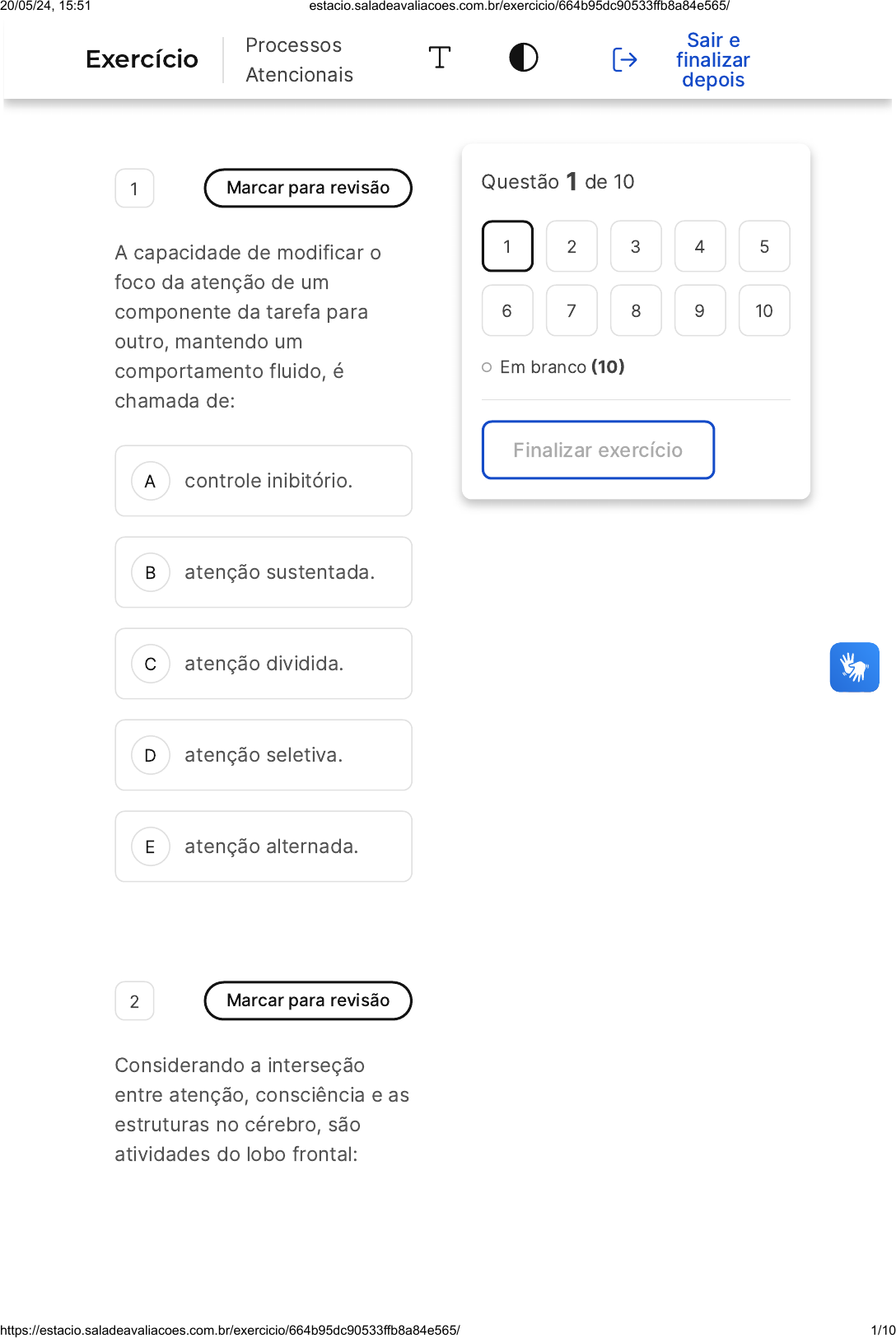 A B C D E 1 Marcar para revisão A capacidade de modificar o foco da atenção de um componente da tarefa para outro, mantendo um comportamento fluido, é chamada de: controle inibitório. atenção sustentada. atenção dividida. atenção seletiva. atenção alternada. 2 Marcar para revisão Considerando a interseção entre atenção, consciência e as estruturas no cérebro, são atividades do lobo frontal: Questão 1 de 10 Em branco �10� Finalizar exercício 1 2 3 4 5 6 7 8 9 10 Exercício Processos Atencionais Sair e finalizar depois 20/05/24, 15:51 estacio.saladeavaliacoes.com.br/exercicio/664b95dc90533ffb8a84e565/ https://estacio.saladeavaliacoes.com.br/exercicio/664b95dc90533ffb8a84e565/ 1/10 A B C D E realizar o movimento dos olhos. direcionar a atenção para a área relevante do espaço. ativar o sistema límbico. regular os estados de alerta. manter a atenção no alvo e direcionar a visão para objetos. 3 Marcar para revisão Alguns autores consideram que a memória de trabalho é uma interseção entre as funções da atenção externa e interna. A capacidade atentiva de selecionar, modular e realizar a manutenção das informações geradas internamente, como, por exemplo, a evocação a partir da memória de curto e longo prazo, é chamada de: 20/05/24, 15:51 estacio.saladeavaliacoes.com.br/exercicio/664b95dc90533ffb8a84e565/ https://estacio.saladeavaliacoes.com.br/exercicio/664b95dc90533ffb8a84e565/ 2/10 A B C D E A B atenção central. atenção dividida. atenção sustentada. atenção interna. atenção externa. 4 Marcar para revisão �Conselho Federal de Psicologia / 2010 � adaptada) Em relação à localização das funções cognitivas, é correto afirmar que: a localização das funções não tem importância, pois existem vias paralelas que fazem parte de toda e qualquer função cognitiva. a localização é um conceito relativo, já que o cérebro também está organizado em redes. 20/05/24, 15:51 estacio.saladeavaliacoes.com.br/exercicio/664b95dc90533ffb8a84e565/ https://estacio.saladeavaliacoes.com.br/exercicio/664b95dc90533ffb8a84e565/ 3/10 C D E Somente as informações sensoriais podem ser devidamente localizadas em áreas específicas do cérebro, e as demais funções são menos específicas. todas as funções estão localizadas em áreas específicas do cérebro, e é possível determinar as áreas encarregadas de cada função. não há possibilidade de localizar funções cognitivas no cérebro, especialmente quando se trata de funções específicas, como seria o caso da atenção. 5 Marcar para revisão �Conselho Federal de Psicologia / 2010� A atenção é uma função cortical importante para a organização do processamento das informações advindas do meio. De acordo com os aspectos teóricos da atenção, assinale a alternativa correta: 20/05/24, 15:51 estacio.saladeavaliacoes.com.br/exercicio/664b95dc90533ffb8a84e565/ https://estacio.saladeavaliacoes.com.br/exercicio/664b95dc90533ffb8a84e565/ 4/10 A B C D E a atenção pode ser classificada como seletiva, sustentada, dividida e alternada. a capacidade de discriminar estímulos relevantes e irrelevantes é atributo da atenção alternada. o termo "funções executivas" é o equivalente de atenção. a atenção pressupõe a capacidade de controle voluntário, de modo que a involuntariedade constitui alteração atencional. atividades cognitivas complexas requerem processamento automático das informações. 6 Marcar para revisão Duas pessoas estão mantendo uma conversa em uma festa. Diante de muitos estímulos 20/05/24, 15:51 estacio.saladeavaliacoes.com.br/exercicio/664b95dc90533ffb8a84e565/ https://estacio.saladeavaliacoes.com.br/exercicio/664b95dc90533ffb8a84e565/ 5/10 A B C D E A B C ambientais, como luzes, música alta e diversão, elas conseguem manter a conversação. O aspecto do sistema atentivo que permite esse processo é chamado de: controle inibitório. atenção sustentada. atenção alternada. atenção seletiva. atenção dividida. 7 Marcar para revisão A capacidade de selecionar dentre diversos estímulos aquele relevante e de não se distrair com estímulos irrelevantes é chamada de: atenção sustentada. atenção seletiva. atenção alternada. 20/05/24, 15:51 estacio.saladeavaliacoes.com.br/exercicio/664b95dc90533ffb8a84e565/ https://estacio.saladeavaliacoes.com.br/exercicio/664b95dc90533ffb8a84e565/ 6/10 D E A B C atenção dividida. controle inibitório. 8 Marcar para revisão O construto da atenção possui algumas variações e determinados conceitos, como focalização, sustentação, concentração, sono, despertar, vigilância, estado de alerta e seletividade. Essa diversidade de possibilidades revela parte daquilo que nomeamos ou possui interseção com o construto da atenção. Para monitorarmos nossa interação com o ambiente, relacionarmos nossas experiências passadas e presentes, e planejarmos nossas experiências futuras, é necessário um conjunto de funções cognitivas composto por: atenção e memória. pensamento e linguagem. memória e consciência. 20/05/24, 15:51 estacio.saladeavaliacoes.com.br/exercicio/664b95dc90533ffb8a84e565/ https://estacio.saladeavaliacoes.com.br/exercicio/664b95dc90533ffb8a84e565/ 7/10 D E A B atenção, memória, consciência e pensamento. percepção e atenção. 9 Marcar para revisão �Conselho Federal de Psicologia / 2010� O Transtorno do Déficit de Atenção e Hiperatividade �TDAH� é um transtorno neuropsiquiátrico bastante frequente na infância. Com base na prática do diagnóstico neuropsicológico, assinale a alternativa correta. O diagnóstico pressupõe a avaliação médica e os resultados em exames de neuroimagem, como o eletroencefalograma �EEG�. A deficiência intelectual é um dos critérios diagnósticos, de forma que os quadros são comórbidos. 20/05/24, 15:51 estacio.saladeavaliacoes.com.br/exercicio/664b95dc90533ffb8a84e565/ https://estacio.saladeavaliacoes.com.br/exercicio