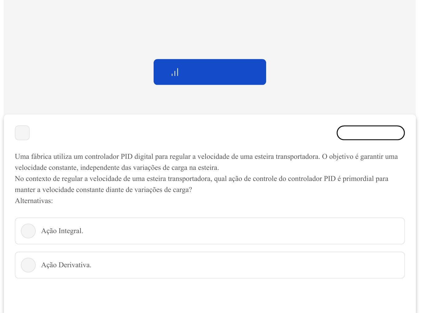 Você acertou 6 de 10 questões Verifique o seu desempenho e continue treinando! Você pode refazer o exercício quantas vezes quiser. Verificar Desempenho A B 1 Marcar para revisão Uma fábrica utiliza um controlador PID digital para regular a velocidade de uma esteira transportadora. O objetivo é garantir uma velocidade constante, independente das variações de carga na esteira. No contexto de regular a velocidade de uma esteira transportadora, qual ação de controle do controlador PID é primordial para manter a velocidade constante diante de variações de carga? Alternativas: Ação Integral. Ação Derivativa. 20/05/2024, 16:20 estacio.saladeavaliacoes.com.br/exercicio/66453369139d33d9141464e5/gabarito/ https://estacio.saladeavaliacoes.com.br/exercicio/66453369139d33d9141464e5/gabarito/ 1/14 C D E Ação Proporcional. Ação de Modulação. Ação de Compensação. Resposta correta Parabéns, você selecionou a alternativa correta. Confira o gabarito comentado! Gabarito Comentado A Ação Proporcional em um controlador PID é fundamental para manter a velocidade constante em uma esteira transportadora, especialmente diante de variações de carga. Ela ajusta a velocidade de forma proporcional ao erro observado, garantindo uma resposta rápida e adequada às mudanças na carga da esteira. 2 Marcar para revisão Em um processo industrial, um controlador PID digital é usado para manter a pressão constante em um reator químico. O desafio é lidar com variações rápidas e imprevisíveis na pressão. Qual componente do controlador PID é mais eficaz para responder a variações rápidas na pressão? Alternativas: 20/05/2024, 16:20 estacio.saladeavaliacoes.com.br/exercicio/66453369139d33d9141464e5/gabarito/ https://estacio.saladeavaliacoes.com.br/exercicio/66453369139d33d9141464e5/gabarito/ 2/14 A B C D E Componente Integral. Componente Proporcional. Componente Derivativo. Componente de Estabilidade. Componente Adaptativo. Resposta incorreta Opa! A alternativa correta é a letra C. Confira o gabarito comentado! Gabarito Comentado O Componente Derivativo de um controlador PID é essencial para lidar com variações rápidas e imprevisíveis, como as encontradas na pressão de um reator químico. Ele responde a taxas de mudança, proporcionando uma ação de controle que previne oscilações e instabilidades decorrentes de mudanças súbitas. 20/05/2024, 16:20 estacio.saladeavaliacoes.com.br/exercicio/66453369139d33d9141464e5/gabarito/ https://estacio.saladeavaliacoes.com.br/exercicio/66453369139d33d9141464e5/gabarito/ 3/14 A B C D E 3 Marcar para revisão Em uma estação de tratamento de água, um novo sistema de controle de pH é implementado. Para garantir a precisão do controle, um controlador PID é escolhido. O engenheiro responsável opta por ajustar manualmente os parâmetros do controlador. Considerando o texto, analise as afirmativas abaixo: I. Ajustar manualmente um controlador PID requer conhecimento detalhado do sistema. II. O termo proporcional do controlador PID responde instantaneamente a variações no erro. III. O ajuste manual de um controlador PID sempre resulta em uma performance ótima. É correto o que se afirma em: Apenas I e II. Apenas II e III. Apenas I. Apenas I e III. Apenas III. Resposta correta Parabéns, você selecionou a alternativa correta. Confira o gabarito comentado! 20/05/2024, 16:20 estacio.saladeavaliacoes.com.br/exercicio/66453369139d33d9141464e5/gabarito/ https://estacio.saladeavaliacoes.com.br/exercicio/66453369139d33d9141464e5/gabarito/ 4/14 A B C Gabarito Comentado A afirmativa I é verdadeira, pois o ajuste manual de um controlador PID exige um entendimento aprofundado do sistema para garantir uma configuração adequada. A afirmativa II também é correta, já que o termo proporcional do controlador PID reage imediatamente a qualquer variação no erro, ajustando o sinal de controle de forma proporcional. No entanto, a afirmativa III é incorreta, pois o ajuste manual de um controlador PID não garante automaticamente uma performance ótima; este depende da habilidade e experiência do engenheiro, além de uma boa compreensão do comportamento do sistema. 4 Marcar para revisão Se um controlador PID for ajustado com K = 10, K = 8 e K = 4, qual deverá ser o valor da constante de tempo derivativo?P i d 0,4 0,8 1,25 20/05/2024, 16:20 estacio.saladeavaliacoes.com.br/exercicio/66453369139d33d9141464e5/gabarito/ https://estacio.saladeavaliacoes.com.br/exercicio/66453369139d33d9141464e5/gabarito/ 5/14 D E 2,5 4,0 Resposta correta Parabéns, você selecionou a alternativa correta. Confira o gabarito comentado! Gabarito Comentado A constante de tempo derivativo é calculada pela divisão do coeficiente derivativo (K ) pelo coeficiente proporcional (K ). Neste caso, temos K = 4 e K = 10. Portanto, a constante de tempo derivativo será 4/10 = 0,4. Assim, a alternativa correta é a "A", que apresenta o valor 0,4. d P d P 5 Marcar para revisão Uma equipe está desenvolvendo um controlador PID para um sistema de regulação de pressão em um processo industrial. Após algumas análises, eles decidem usar o segundo método de Ziegler-Nichols para a sintonia do controlador. Durante o teste, eles ajustam o ganho proporcional até que o sistema comece a oscilar. Qual parâmetro a equipe deve observar atentamente para aplicar corretamente o segundo método de Ziegler-Nichols? Alternativas: 20/05/2024, 16:20 estacio.saladeavaliacoes.com.br/exercicio/66453369139d33d9141464e5/gabarito/ https://estacio.saladeavaliacoes.com.br/exercicio/66453369139d33d9141464e5/gabarito/ 6/14 A B C D E Tempo de resposta do sistema ao ganho proporcional ajustado. Frequência de oscilação no ponto crítico. Amplitude das oscilações no ponto crítico. Tempo de atraso do sistema antes do início da oscilação. Ganho integral necessário para estabilizar as oscilações. Resposta correta Parabéns, você selecionou a alternativa correta. Confira o gabarito comentado! Gaba