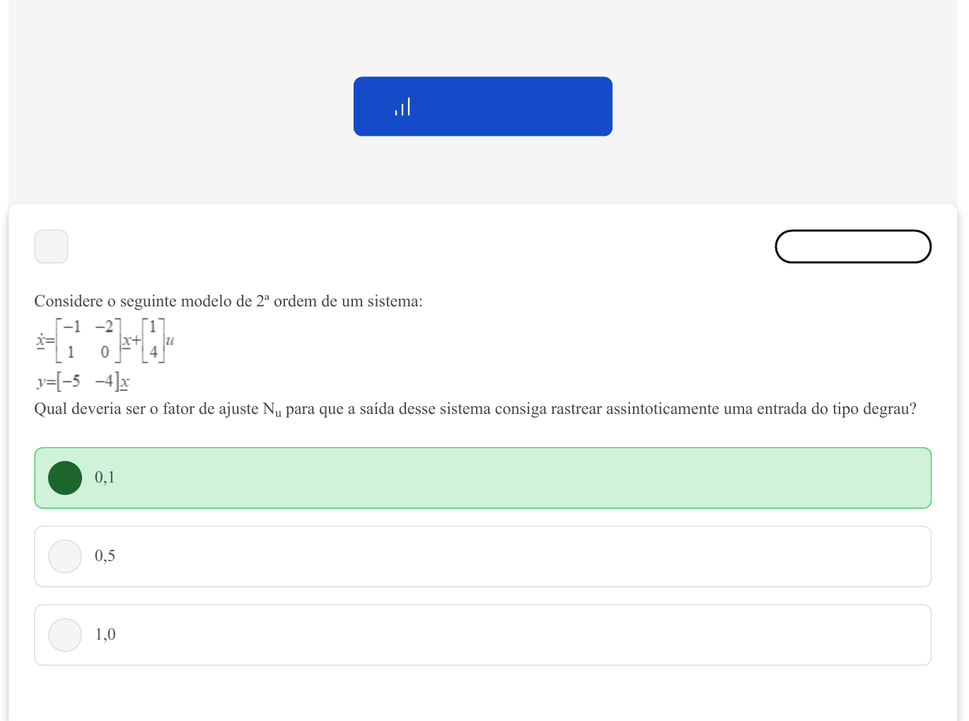 Verifique o seu desempenho e continue treinando! Você pode refazer o exercício quantas vezes quiser. Verificar Desempenho A B C 1 Marcar para revisão Considere o seguinte modelo de 2ª ordem de um sistema: Qual deveria ser o fator de ajuste N para que a saída desse sistema consiga rastrear assintotica mente uma entrada do tipo degrau?u 0,1 0,5 1,0 20/05/2024, 16:18 estacio.saladeavaliacoes.com.br/exercicio/6647f01090533ffb8a57b5e5/gabarito/ https://estacio.saladeavaliacoes.com.br/exercicio/6647f01090533ffb8a57b5e5/gabarito/ 1/7 D E A B 2,0 5,0 Resposta correta Parabéns, você selecionou a alternativa correta. Confira o gabarito comentado! Gabarito Comentado Resposta correta: 0,1 2 Marcar para revisão No caso de realimentação de estados, se as posições finais desejadas dos polos de um sistema de segunda ordem fossem s = -2 e s = -4, qual deveria ser o polinômio característico desejado? 1 2 s +6s+82 s +5s+82 20/05/2024, 16:18 estacio.saladeavaliacoes.com.br/exercicio/6647f01090533ffb8a57b5e5/gabarito/ https://estacio.saladeavaliacoes.com.br/exercicio/6647f01090533ffb8a57b5e5/gabarito/ 2/7 C D E s +2s+42 s +4s+22 s +6s+42 Resposta correta Parabéns, você selecionou a alternativa correta. Confira o gabarito comentado! Gabarito Comentado O polinômio característico desejado para um sistema de segunda ordem com posições finais dos polos em s = -2 e s = -4 é dado pela expressão s +6s+8. Isso ocorre porque o polinômio característico de um sistema de segunda ordem é dado pela soma das raízes (polos) multiplicadas por s e o produto das raízes. Neste caso, a soma das raízes é -2 + -4 = -6 e o produto das raízes é -2 * -4 = 8, resultando no polinômio s +6s+8. 1 2 2 2 3 Marcar para revisão A equação diferença de um sistema discreto é y(k+2) = - 0,8y(k) + u(k+1) + 2u(k). Qual é o polinômio característico de sua função de transferência discreta? 20/05/2024, 16:18 estacio.saladeavaliacoes.com.br/exercicio/6647f01090533ffb8a57b5e5/gabarito/ https://estacio.saladeavaliacoes.com.br/exercicio/6647f01090533ffb8a57b5e5/gabarito/ 3/7 A B C D E z + 0,8 z + 0,82 z + 2z + 0,82 z + 2 z + z + 22 Resposta correta Parabéns, você selecionou a alternativa correta. Confira o gabarito comentado! Gabarito Comentado O polinômio característico de uma função de transferência discreta é obtido ao substituir a variável dependente y(k) por z na equação diferença do sistema. Neste caso, a equação diferença é y(k+2) = - 0,8y(k) + u(k+1) + 2u(k). Ao substituir y(k) por z na equação, obtemos z + 0,8, que é a alternativa correta.2 20/05/2024, 16:18 estacio.saladeavaliacoes.com.br/exercicio/6647f01090533ffb8a57b5e5/gabarito/ https://estacio.saladeavaliacoes.com.br/exercicio/6647f01090533ffb8a57b5e5/gabarito/ 4/7 A B C D E 4 Marcar para revisão Considere o seguinte sistema discreto de 2ª ordem: Se as condições iniciais são nulas e o sistema tem aplicado na entrada um sinal na forma de degrau unitário discreto em k = 0, qual é o valor da saída em k = 2? 4 8 12 16 20 Resposta correta Parabéns, você selecionou a alternativa correta. Confira o gabarito comentado! 20/05/2024, 16:18 estacio.saladeavaliacoes.com.br/exercicio/6647f01090533ffb8a57b5e5/gabarito/ https://estacio.saladeavaliacoes.com.br/exercicio/6647f01090533ffb8a57b5e5/gabarito/ 5/7 A B C D E Gabarito Comentado Resposta correta: 12 5 Marcar para revisão Sabe-se que A=[-8], B=[4] e D=[2] são matrizes de um modelo em espaço de estado de um sistema de 1ª ordem. Se a saída consegue rastrear assintoticamente um sinal de entrada do tipo degrau com fator de ajuste N =2, qual deveria ser a matriz de saída C desse sistema? u [2] [1] [-1] [-2] [-3] 20/05/2024, 16:18 estacio.saladeavaliacoes.com.br/exercicio/6647f01090533ffb8a57b5e5/gabarito/ https://estacio.saladeavaliacoes.com.br/exercicio/6647f01090533ffb8a57b5e5/gabarito/ 6/7 Resposta correta Parabéns, você selecionou a alternativa correta. Confira o gabarito comentado! Gabarito Comentado A matriz de saída C desse sistema é [-3]. Isso se deve ao fato de que, em um sistema de 1ª ordem, a saída consegue rastrear assintoticamente um sinal de entrada do tipo degrau com fator de ajuste N =2. Portanto, para que isso ocorra, a matriz de saída deve ser [-3]. u 20/05/2024, 16:18 estacio.saladeavaliacoes.com.br/exercicio/6647f01090533ffb8a57b5e5/gabarito/ https://estacio.saladeavaliacoes.com.br/exercicio/6647f01090533ffb8a57b5e5/gabarito/ 7/7