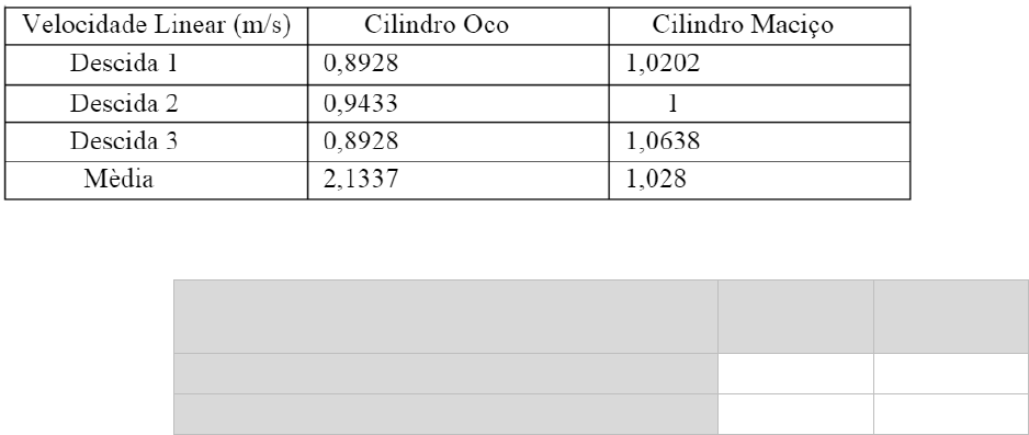 Relatório de Prática - Laboratório Virtual Nome da Prática: PRINCÍPIO DA CONSERVAÇÂO DA ENERGIA Nome do Aluno: Ryan Ribeiro Carnaúba Matricula: 24114884 Data de Execução: 18/05/2024 OBJETIVO Este experimento trata do princípio da conservação da energia. iremos comprovar a transformação da energia potencial gravitacional em energia cinética, esclarecendo o princípio da conservação da energia mecânica. o experimento evidenciará que, por causa da conservação da energia mecânica, quanto maior a energia potencial gravitacional do corpo (móvel) no início do movimento de queda ao longo do plano inclinado, maior será sua energia cinética na parte mais baixade sua trajetória. como parte das atividades você terá que fazer a montagem e ajustes dos equipamentos e instrumentos necessários para a realização do experimento. MATERIAIS UTILIZADOS fuso elevador , nível bolha, multicronômetro , sensor fotoelétrico , plano inclinado , corpo de prova cilíndrico oco e corpode prova cilíndrico maciço. Coleta de Dados e Resultados TABELA1: Valores de velocidade linear obtidos no experimento. TABELA: 3 grandezas relacionadas a conservação da energia. Grandezas Cilindro oco Cilindro maciço Momento de inércia – I (kg.m2) 56,375x 10⁶ 93,75x 10⁶ Velocidade linear média – V 0,893282 0,993464 (m/s) Velocidade angular – ω (rad/s) 35,731297 39,738562 𝒎𝟐 Energia cinética de translação - Kt (𝑱 = 𝒌𝒈 ) 𝒔𝟐 0,0438874 0,148045 𝒎𝟐 Energia cinética de rotação – Kr (𝑱 = 𝒌𝒈 ) 𝒔𝟐 0,040695 0,07402281 𝒎𝟐 Energia cinética total – K (𝑱 = 𝒌𝒈 ) 𝒔𝟐 0,0845830 0,2252068 𝒎𝟐 Energia potencial gravitacional – U (𝑱 = 𝒌𝒈 ) 𝒔𝟐 0,088486 0,241326 Erro relativo percentual em relação à energia inicial do cilindro – ER% (%) 4,4110053 7,989696 Conclusão Houve uma discreta diferença entre a velocidades linear e de descida dos corpos de provas oco e maciço ,sendo observado que ambas as velocidades do corpo maciço são superiores ao corpo oco. Isso ocorre porque nesse corpo a massa é maior. Não é correto afirmar que a energia potencial gravitacional é igual a soma das energias cinéticas detranslação e rotação, porque a energia gravitacional está relacionada a uma determinada altura e a energiacinética está relacionada a algo em movimentação.Dessa forma, podemos observar no experimento as duas energias, porém em momentos diferentes: ao colocar o corpo de prova no início do plano inclinado este possuía energia potencial gravitacional e ao ser solto essa energia se transformou em energia cinética Referência Biliográfica ABNT - Associação Brasileira de Normas Técnicas virtuaslab.net/ualabs/ualab/12/img_conteudo/roteiro/pdf/roteiro.pdf?modo=embed