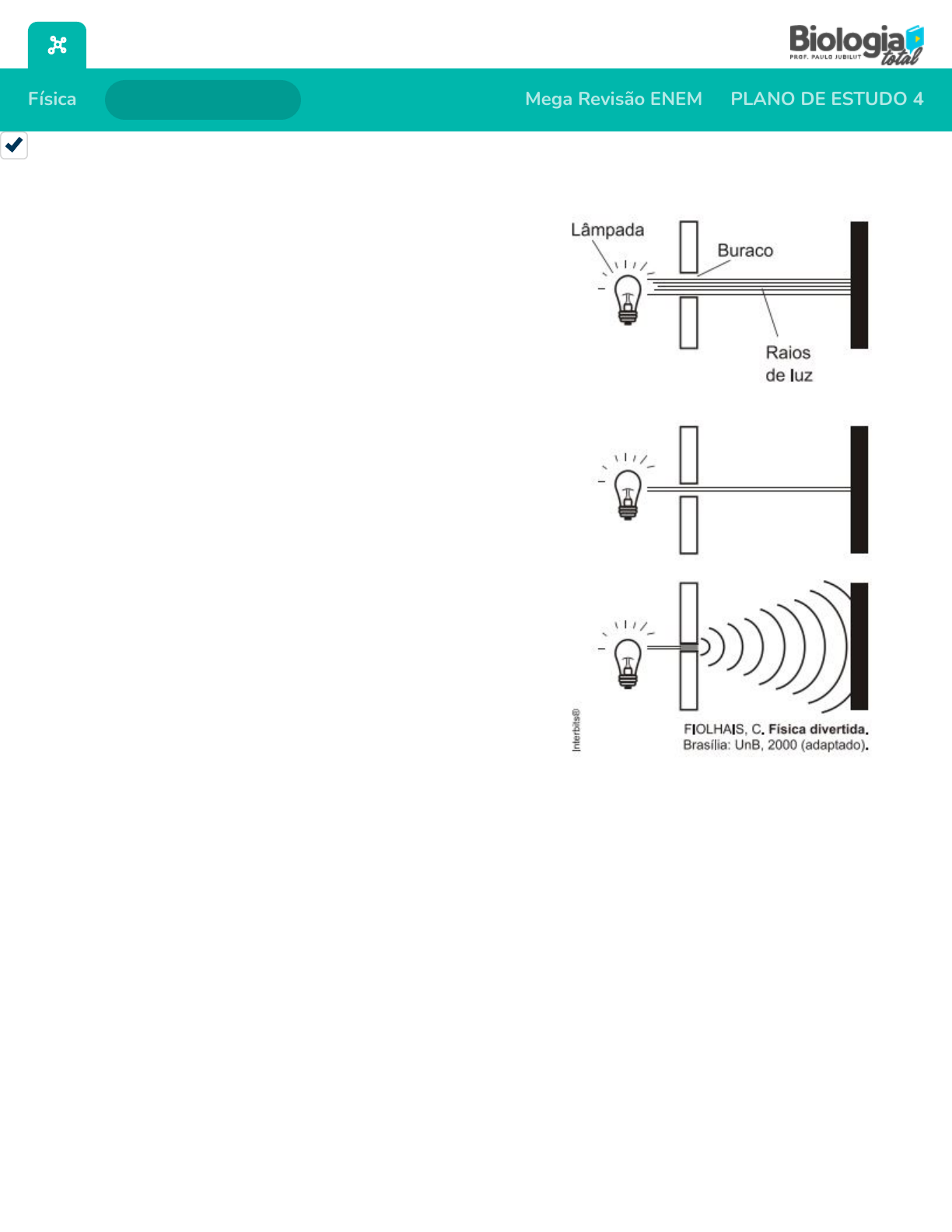 / Física Lista de Exercícios Mega Revisão ENEM PLANO DE ESTUDO 4 Ex. 3 ENEM Fenômenos Ondulatórios (ENEM PPL 2018) Alguns modelos mais modernos de fones de ouvido contam com uma fonte de energia elétrica para poderem funcionar. Esses novos fones têm um recurso, denominado “Cancelador de Ruídos Ativo”, constituído de um circuito eletrônico que gera um sinal sonoro semelhante ao sinal externo de frequência �xa. No entanto, para que o cancelamento seja realizado, o sinal sonoro produzido pelo circuito precisa apresentar simultaneamente características especí�cas bem determinadas. Quais são as características do sinal gerado pelo circuito desse tipo de fone de ouvido? Ex. 15 ENEM Fenômenos Ondulatórios (ENEM 2010) Um garoto que passeia de carro com seu pai pela cidade, ao ouvir o rádio, percebe que a sua estação de rádio preferida, a 94,9 FM, que opera na banda de frequência de megahertz, tem seu sinal de transmissão superposto pela transmissão de uma rádio pirata de mesma frequência que interfere no sinal da emissora do centro em algumas regiões da cidade. Considerando a situação apresentada, a rádio pirata interfere no sinal da rádio pirata interfere no sinal da rádio do centro devido à Ex. 12 ENEM Fenômenos Ondulatórios (ENEM 2011) Ao diminuir o tamanho de um orifício atravessado por um feixe de luz, passa menos luz por intervalo de tempo, e próximo da situação de completo fechamento do orifício, veri�ca-se que a luz apresenta um comportamento como o ilustrado nas �guras. Sabe-se que o som, dentro de suas particularidades, também pode se comportar dessa forma. Em qual das situações a seguir está representado o fenômeno descrito no texto? Ex. 1 ENEM Efeito Doppler (ENEM 2016) Uma ambulância A em movimento retilíneo e uniforme aproxima-se de um observador O, em repouso. A sirene emite um som de frequência constante fA. O desenho ilustra as frentes de onda do som emitido pela ambulância. O observador possui um detector que consegue registrar, no esboço de um grá�co, a frequência da onda Imprimir mais exercícios por página a) Sinal com mesma amplitude, mesma frequência e diferença de fase igual a 90° em relação ao sinal externo. b) Sinal com mesma amplitude, mesma frequência e diferença de fase igual a 180° em relação ao sinal externo. c) Sinal com mesma amplitude, mesma frequência e diferença de fase igual a 45° em relação ao sinal externo. d) Sinal de amplitude maior, mesma frequência e diferença de fase igual a 90° em relação ao sinal externo. e) Sinal com mesma amplitude, mesma frequência e mesma fase do sinal externo. a) atenuação promovida pelo ar nas radiações emitidas. b) maior amplitude da radiação emitida pela estação do centro. c) diferença de intensidade entre as fontes emissoras de ondas. d) menor potência de transmissão das ondas da emissora pirata. e) semelhança dos comprimentos de onda das radiações emitidas. a) Ao se esconder atrás de um muro, um menino ouve a conversa de seus colegas. b) Ao gritar diante de um des�ladeiro, uma pessoa ouve a repetição do seu próprio grito. c) Ao encostar o ouvido no chão, um homem percebe o som de uma locomotiva antes de ouvi-lo pelo ar. d) Ao ouvir uma ambulância se aproximando, uma pessoa percebe o som mais agudo do que quando aquela se afasta. e) Ao emitir uma nota musical muito aguda, uma cantora de ópera faz com que uma taça de cristal se despedace. / sonora detectada em função do tempo fO(t), antes e depois da passagem da ambulância por ele. Qual esboço grá�co representa a frequência fO(t) detectada pelo observador? Ex. 8 ENEM Fenômenos Ondulatórios (ENEM 2014) Ao assistir a uma apresentação musical, um músico que estava na plateia percebeu que conseguia ouvir quase perfeitamente o som da banda, perdendo um pouco de nitidez nas notas mais agudas. Ele veri�cou que havia muitas pessoas bem mais altas à sua frente, bloqueando a visão direta do palco e o acesso aos alto-falantes. Sabe- se que a velocidade do som no ar é 340 m/s e que a região de frequências das notas emitidas é de, aproximadamente, 20Hz a 4000Hz. Qual fenômeno ondulatório é o principal responsável para que o músico percebesse essa diferenciação do som? Ex. 2 ENEM Efeito Doppler (ENEM 2016) O morcego emite pulsos de curta duração de ondas ultrassônicas, os quais voltam na forma de ecos após atingirem objetos no ambiente, trazendo informações a respeito das suas dimensões, suas localizações e dos seus possíveis movimentos. Isso se dá em razão da sensibilidade do morcego em detectar o tempo gasto para os ecos voltarem, bem como das pequenas variações nas frequências e nas intensidades dos pulsos ultrassônicos. Essas características lhe permitem caçar pequenas presas mesmo quando estão em movimento em relação a si. Considere uma situação unidimensional em que uma mariposa se afasta, em movimento retilíneo e uniforme, de um morcego em repouso. A distância e velocidade da mariposa, na situação descrita, seriam detectadas pelo sistema de um morcego por quais alterações nas características dos pulsos ultrassônicos? Ex. 11 ENEM Fenômenos Ondulatórios (ENEM 2013) Em viagens de avião, é solicitado aos passageiros o desligamento de todos os aparelhos cujo funcionamento envolva a emissão ou a recepção de ondas eletromagnéticas. O procedimento é utilizado para eliminar fontes de radiação que possam interferir nas a) b) c) d) e) a) Difração. b) Re�exão. c) Refração. d) Atenuação. e) Interferência. a) Intensidade diminuída, o tempo de retorno aumentado e a frequência percebida diminuída. b) Intensidade aumentada, o tempo de retorno diminuído e a frequência percebida diminuída. c) Intensidade diminuída, o tempo de retorno diminuído e a frequência percebida aumentada. d) Intensidade diminuída, o tempo de retorno aumentado e a frequência percebida aumentada. e) Intensidade aumentada, o tempo 