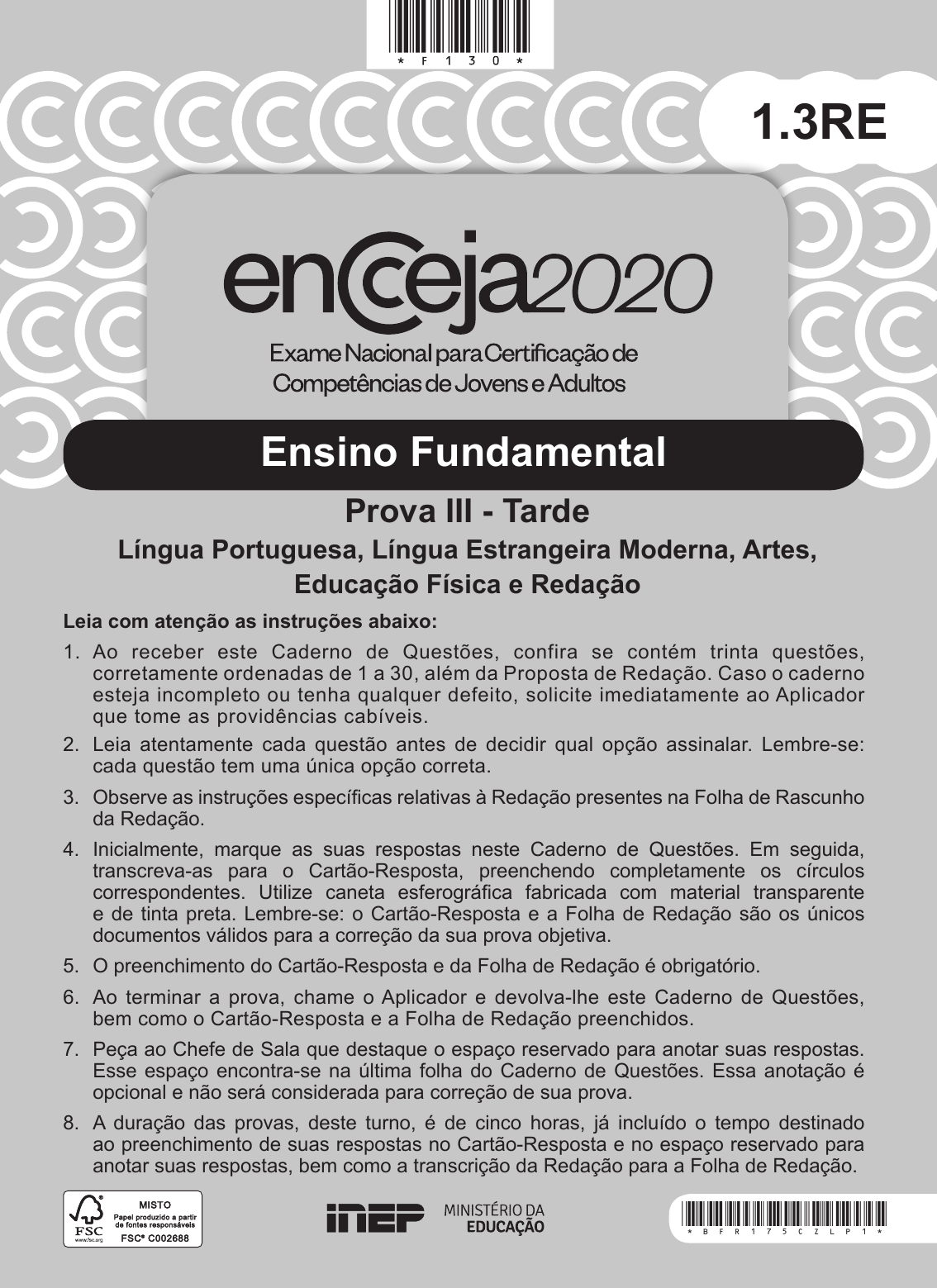 Ciências Naturais - ENCCEJA 2020 1 Prova III - Tarde Língua Portuguesa, Língua Estrangeira Moderna, Artes, Educação Física e Redação Ensino Fundamental 1.3RE Leia com atenção as instruções abaixo: 1. Ao receber este Caderno de Questões, confira se contém trinta questões, corretamente ordenadas de 1 a 30, além da Proposta de Redação. Caso o caderno esteja incompleto ou tenha qualquer defeito, solicite imediatamente ao Aplicador que tome as providências cabíveis. 2. Leia atentamente cada questão antes de decidir qual opção assinalar. Lembre-se: cada questão tem uma única opção correta. 3. Observe as instruções específicas relativas à Redação presentes na Folha de Rascunho da Redação. 4. Inicialmente, marque as suas respostas neste Caderno de Questões. Em seguida, transcreva-as para o Cartão-Resposta, preenchendo completamente os círculos correspondentes. Utilize caneta esferográfica fabricada com material transparente e de tinta preta. Lembre-se: o Cartão-Resposta e a Folha de Redação são os únicos documentos válidos para a correção da sua prova objetiva. 5. O preenchimento do Cartão-Resposta e da Folha de Redação é obrigatório. 6. Ao terminar a prova, chame o Aplicador e devolva-lhe este Caderno de Questões, bem como o Cartão-Resposta e a Folha de Redação preenchidos. 7. Peça ao Chefe de Sala que destaque o espaço reservado para anotar suas respostas. Esse espaço encontra-se na última folha do Caderno de Questões. Essa anotação é opcional e não será considerada para correção de sua prova. 8. A duração das provas, deste turno, é de cinco horas, já incluído o tempo destinado ao preenchimento de suas respostas no Cartão-Resposta e no espaço reservado para anotar suas respostas, bem como a transcrição da Redação para a Folha de Redação. *BFR175CZLP1* 2 Língua Portuguesa, Língua Estrangeira Moderna, Artes, Educação Física e Redação - ENCCEJA 2020 PROPOSTA DE REDAÇÃO A partir da leitura dos textos motivadores e com base nos conhecimentos construídos ao longo de sua formação, redija um texto dissertativo-argumentativo em modalidade escrita formal da língua portuguesa sobre o tema Abandono afetivo do idoso no Brasil. Selecione, organize e relacione, de forma coerente e coesa, argumentos e fatos para defesa de seu ponto de vista. TExTO I Cresce número de idosos instalados em abrigos públicos VELHOS E DESAMPARADOS 2012 2013 2014 2015 2016 2017 45 8 27 44 41 6 53 6 43 57 3 03 60 8 93 60 9 39 Disponível em: https://istoe.com.br. Acesso em: 19 fev. 2020. TExTO II Nos últimos anos, diversos estudos têm apontado uma forte associação entre a solidão e a incidência de doenças crônicas em idosos. De fato, pesquisadores da Universidade de Chicago descobriram que o isolamento pode aumentar o risco de morte em 14% nas faixas etárias mais avançadas. O trabalho descobriu que o estresse provocado por essa sensação induz respostas inflamatórias nas células, afetando, entre outras coisas, a produção dos leucócitos, estruturas que defendem o organismo de infecções. Recentemente, pesquisadores da Universidade de York concluíram que a solidão aumenta em 29% o risco de doenças coronarianas e em 32% o de acidentes vasculares. Disponível em: http://especiais.correiobraziliense.com.br. Acesso em: 19 fev. 2020 (adaptado). TExTO III Como se morre de velhice Como se morre de velhice ou de acidente ou de doença, morro, Senhor, de indiferença. Da indiferença deste mundo onde o que se sente e se pensa não tem eco, na ausência imensa. Na ausência, areia movediça onde se escreve igual sentença para o que é vencido e o que vença. [...] De boca amarga e de alma triste sinto a minha própria presença num céu de loucura suspensa. (Já não se morre de velhice nem de acidente nem de doença, mas, Senhor, só de indiferença.) MEIRELES, Cecília. Poesia Completa. Rio de Janeiro: Nova Fronteira, 2008. *BFR175CZLP2* 3Língua Portuguesa, Língua Estrangeira Moderna, Artes, Educação Física e Redação - ENCCEJA 2020 INSTRUÇÕES PARA A REDAÇÃO • O rascunho da redação deve ser feito no espaço apropriado. • O texto definitivo deve ser escrito à tinta, na folha própria, em até 25 linhas. • A redação que apresentar cópia dos textos da Proposta de Redação ou do Caderno de Questões terá o número de linhas copiadas desconsiderado para efeito de correção. • Receberá nota zero, em qualquer das situações expressas a seguir, a redação que: • tiver até 4 (quatro) linhas escritas, sendo considerada “texto insuficiente”; • fugir ao tema ou que não atender ao tipo dissertativo-argumentativo; • apresentar parte do texto deliberadamente desconectada do tema proposto. RASCUNHO DA REDAÇÃO 1 2 3 4 5 6 7 8 9 10 11 12 13 14 15 16 17 18 19 20 21 22 23 24 25 *BFR175CZLP3* Língua Portuguesa, Língua Estrangeira Moderna, Artes, Educação Física e Redação - ENCCEJA 20204 QUESTÃO 01 Começaram todos eles a me chamar de Doutor, a mangar de mim, me enganar, me aconselhando a procurar esse e aquele, que era um bom professor. Eu passava um dia inteiro procurando por Fulano pra, quando achava, saber que o sujeito era maluco, dos muitos loucos que havia, ou dos que já amanheciam afogados na cachaça. Por fim, vi que as bodegas dali não vendiam livro, nem um lápis, nem papel. Pensei em aprender com as placas escritas pelas ruelas, mas, sempre que eu perguntava o que uma placa dizia, o outro sem nem olhar respondia as mesmas palavras que não iam servir pra quase nada: — Compro ouro. REZENDE, M. V. Ouro dentro da cabeça. Belo Horizonte: Autêntica, 2012. No relato de sua experiência no garimpo, o narrador retrata uma realidade em que a A disputa pelo ouro estimula a violência. B incerteza do sucesso leva ao alcoolismo. C informalidade substitui a falta de professores. D escassez do letramento afeta o convívio social. QUESTÃO 02 Impressionista Uma ocasião, meu pai pintou a casa tod