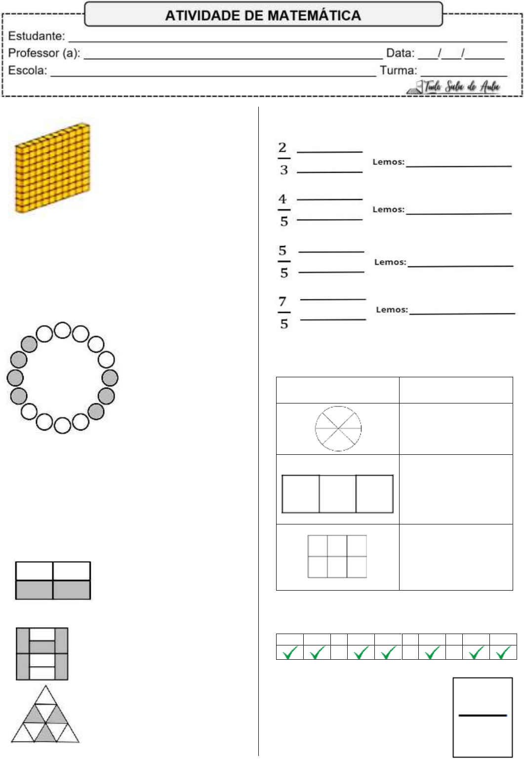 1. Veja o material dourado. a) Quantas barras de 10 cubinhos há nessa placa do material dourado? ______________________________________________ b) Quantas barras são necessárias para representar a fração 4/10? ______________________________________________ 2. Observe a imagem. Assinale a alternativa que corresponde à fração que representa a quantidade de bolinhas pintadas em relação ao total de bolinhas. a) 3/4 b) 4/9 c) 7/9 d) 7/16 3. Escreva a fração que representa a parte pintada de cada figura. a) ________________________ b) ____________________________ c) _________________________ 4. Nas frações abaixo, identifique o numerador e o denominador e escreva como se lê cada uma delas. 5. Pinte duas partes em cada uma das figuras abaixo e escreva a fração representada. FIGURA QUE FRAÇÃO FORMOU? 6. Alex fez uma prova de 10 questões e acertou 7. Veja a tabela de acertos que ele organizou. 1 2 3 4 5 6 7 8 9 10 Que fração representa a quantidade de acertos de Alex em relação ao total de questões dessa prova? 7. Veja a figura que a professora de Samuel desenhou no quadro. a) Escreva a fração que representa a parte pintada dessa figura. b) Sobre a fração representada da figura acima, escreva como se lê essa fração corretamente ______________________________________________ ______________________________________________ 8. Gabi ganhou uma pizza de sua mãe para comer com sua amiga Bianca. Veja a pizza e a fração que corresponde a essa pizza inteira. Como a pizza era grande, elas conseguiram comer apenas 3 pedaços, conforme a imagem abaixo. a) Que fração representa a parte da pizza que elas comeram? Escreva como se lê essa fração. ______________________________________________ b) Que fração representa o que restou da pizza? ______________________________________________ 9. Veja a figura a seguir. Que fração representa a parte pintada dessa figura? ______________________________________________ ______________________________________________ 10. Lucas ganhou dois reais de seu avô em moedas de 0,25 centavos para comprar bombons. Veja a figura. No caminho da bomboniere, Lucas perdeu duas de suas moedas. a) Quantas moedas lhe restaram? ______________________________________________ b) Escreva a fração correspondente à quantidade de moedas que restou de Lucas em relação ao total de moedas que ele ganhou. ______________________________________________ ______________________________________________ 11. Geicy deixou uma barra de chocolate na sua geladeira e, quando foi procurar, viu que estavam faltando dois pedaços. Que fração representa a parte dessa barra de chocolate que está faltando? E a parte que sobrou? Parte que está faltando Parte que sobrou 12. Dona Irene fez uma tapioca e dividiu em quatro pedaços. a) Que fração da tapioca representa um desses pedaços? b) Quantos pedaços representam meia tapioca? ______________________________________________ ______________________________________________ c) O filho de dona Irene estava faminto e comeu os quatro pedaços dessa tapioca. Que fração da tapioca ele comeu? De que outra forma essa fração pode ser representada? ______________________________________________ ______________________________________________ ______________________________________________