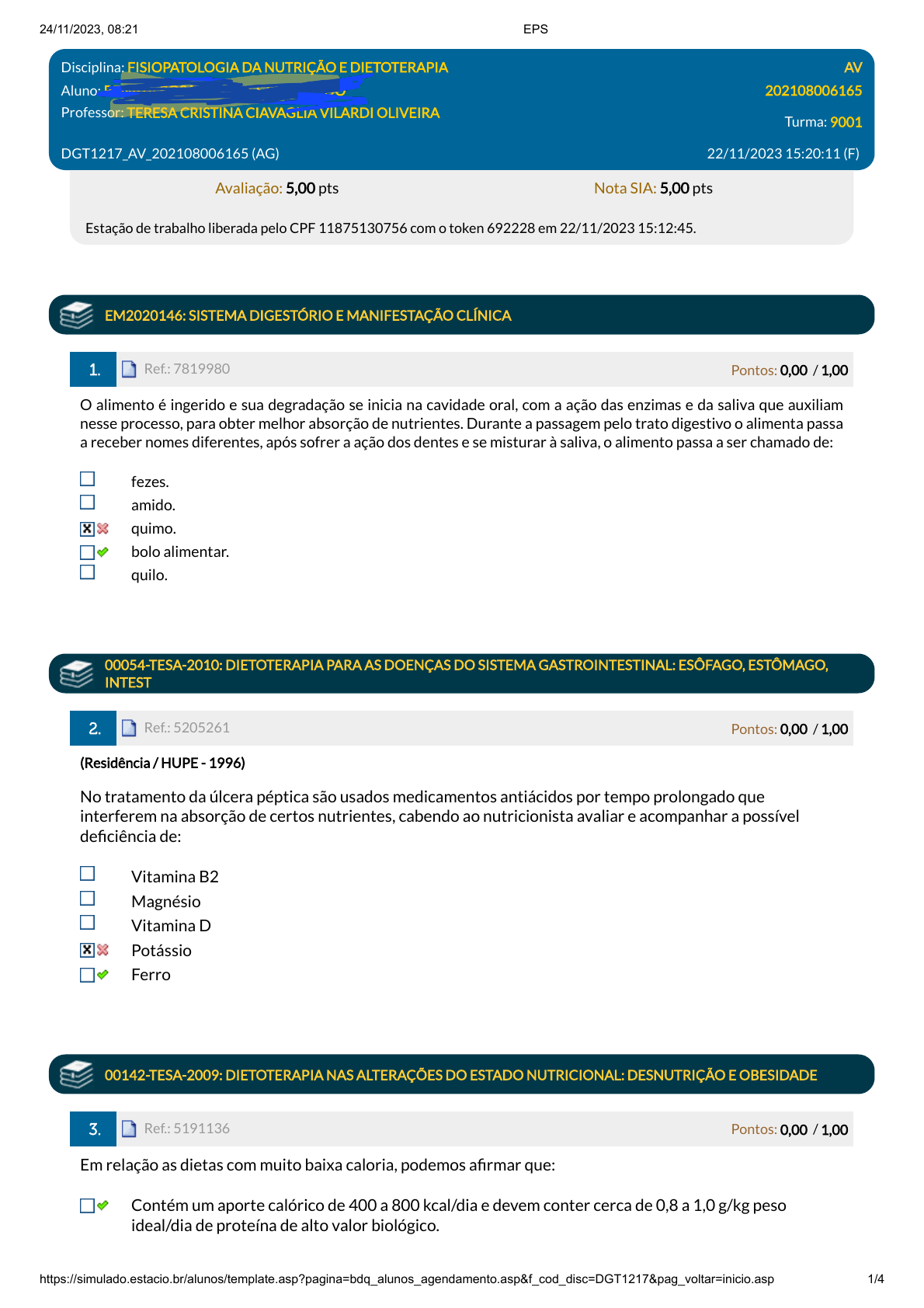 24/11/2023, 08:21 EPS https://simulado.estacio.br/alunos/template.asp?pagina=bdq_alunos_agendamento.asp&f_cod_disc=DGT1217&pag_voltar=inicio.asp 1/4 Disciplina: FISIOPATOLOGIA DA NUTRIÇÃO E DIETOTERAPIA AV Aluno: RENATA ROSA ANTUNES FIGUEREDO 202108006165 Professor: TERESA CRISTINA CIAVAGLIA VILARDI OLIVEIRA Turma: 9001 DGT1217_AV_202108006165 (AG) 22/11/2023 15:20:11 (F) Avaliação: 5,00 pts Nota SIA: 5,00 pts Estação de trabalho liberada pelo CPF 11875130756 com o token 692228 em 22/11/2023 15:12:45. EM2020146: SISTEMA DIGESTÓRIO E MANIFESTAÇÃO CLÍNICA 1. Ref.: 7819980 Pontos: 0,00 / 1,00 O alimento é ingerido e sua degradação se inicia na cavidade oral, com a ação das enzimas e da saliva que auxiliam nesse processo, para obter melhor absorção de nutrientes. Durante a passagem pelo trato digestivo o alimenta passa a receber nomes diferentes, após sofrer a ação dos dentes e se misturar à saliva, o alimento passa a ser chamado de: fezes. amido. quimo. bolo alimentar. quilo. 00054-TESA-2010: DIETOTERAPIA PARA AS DOENÇAS DO SISTEMA GASTROINTESTINAL: ESÔFAGO, ESTÔMAGO, INTEST 2. Ref.: 5205261 Pontos: 0,00 / 1,00 (Residência / HUPE - 1996) No tratamento da úlcera péptica são usados medicamentos antiácidos por tempo prolongado que interferem na absorção de certos nutrientes, cabendo ao nutricionista avaliar e acompanhar a possível de�ciência de: Vitamina B2 Magnésio Vitamina D Potássio Ferro 00142-TESA-2009: DIETOTERAPIA NAS ALTERAÇÕES DO ESTADO NUTRICIONAL: DESNUTRIÇÃO E OBESIDADE 3. Ref.: 5191136 Pontos: 0,00 / 1,00 Em relação as dietas com muito baixa caloria, podemos a�rmar que: Contém um aporte calórico de 400 a 800 kcal/dia e devem conter cerca de 0,8 a 1,0 g/kg peso ideal/dia de proteína de alto valor biológico. javascript:alert('C%C3%B3digo da quest%C3%A3o: 7819980.'); javascript:alert('C%C3%B3digo da quest%C3%A3o: 7819980.'); javascript:alert('C%C3%B3digo da quest%C3%A3o: 5205261.'); javascript:alert('C%C3%B3digo da quest%C3%A3o: 5205261.'); javascript:alert('C%C3%B3digo da quest%C3%A3o: 5191136.'); javascript:alert('C%C3%B3digo da quest%C3%A3o: 5191136.'); 24/11/2023, 08:21 EPS https://simulado.estacio.br/alunos/template.asp?pagina=bdq_alunos_agendamento.asp&f_cod_disc=DGT1217&pag_voltar=inicio.asp 2/4 Contém entre 800 a 1000 kcal/dia e podem ser prescritos para pacientes com IMC superior a 30 kg/m2. Contém em torno de 400 a 800 kcal/dia e devem ser prescritas para pacientes com sobrepeso e obesidade. Contém um aporte calórico de 400 a 800 kcal/dia e devem conter cerca de 0,8 a 1,0 g/kg peso ideal/dia de lipídeos. Essas dietas parecem ser seguras quando prescritas nos consultórios para pacientes com obesidade mórbida por um período de 20 semanas. 4. Ref.: 5202333 Pontos: 1,00 / 1,00 Em relação aos fatores genéticos que desempenham um papel importante na regulação do peso, marque aquele que não está envolvido: Adiponectina Receptor - Receptor de leptina TNF- FTO 00228-TESA-2010: TERAPIA DE NUTRIÇÃO ENTERAL E PARENTERAL 5. Ref.: 5223451 Pontos: 1,00 / 1,00 Qual é a contraindicação absoluta de alimentação por via enteral? Íleo paralítico, pós-operatório, prolongado. Câncer. Fístulas enterocutâneas de baixo débito. Queimaduras. Desnutrição moderada. 6. Ref.: 5229296 Pontos: 1,00 / 1,00 (UFPR, 2003) No que se refere à nutrição parenteral, assinale a alternativa correta: Nos pacientes hipovolêmicos, ela é contraindicada. As duas veias mais utilizadas para o acesso venoso central são a subclávia e a ilíaca. São indicações especí�cas da nutrição parenteral: neoplasias, síndrome de má absorção e choque séptico. A máxima concentração de dextrose que pode ser administrada perifericamente é de 20%, e por via central, é de 45%. Os pacientes devem ser monitorados somente quanto aos parâmetros nutricionais. 00251-TESA-2008: ALERGIAS E INTOLERÂNCIAS γ α javascript:alert('C%C3%B3digo da quest%C3%A3o: 5202333.'); javascript:alert('C%C3%B3digo da quest%C3%A3o: 5202333.'); javascript:alert('C%C3%B3digo da quest%C3%A3o: 5223451.'); javascript:alert('C%C3%B3digo da quest%C3%A3o: 5223451.'); javascript:alert('C%C3%B3digo da quest%C3%A3o: 5229296.'); javascript:alert('C%C3%B3digo da quest%C3%A3o: 5229296.'); 24/11/2023, 08:21 EPS https://simulado.estacio.br/alunos/template.asp?pagina=bdq_alunos_agendamento.asp&f_cod_disc=DGT1217&pag_voltar=inicio.asp 3/4 7. Ref.: 4911292 Pontos: 1,00 / 1,00 O leite materno possui componentes imunologicamente ativos que são responsáveis pelo papel imunomodulador do aleitamento materno. A partir das alternativas abaixo, indique um desses componentes: IgE. Poliaminas. Vitamina D. Lactoferrina. Ácido graxo de cadeia média. 8. Ref.: 4905295 Pontos: 1,00 / 1,00 Levando-se em consideração os mecanismos �siopatológicos envolvidos, as reações adversas a alimentos (RAA) podem ser classi�cadas em imunológicas ou não-imunológicas. Como são chamadas as RAA não imunológicas? Ana�laxia. Alergia alimentar. Urticária. Intolerância alimentar. Sensibilidade alimentar. 00380-TESA-2008: AVALIAÇÃO NUTRICIONAL DO PACIENTE HOSPITALIZADO E EM ATENDIMENTO AMBULATORIAL 9. Ref.: 7815651 Pontos: 0,00 / 1,00 Uma das etapas de consulta é o exame físico. Este associado a avaliação nutricional fornece evidência do estado nutricional do paciente. Sobre o exame físico abdominal, marque a alternativa correta. Deve ser realizada a Percussão, ausculta e palpação. Deve ser realizada a inspeção, ausculta e palpação. Deve ser realizada a observação clínica, percussão e ausculta. Deve ser realizada a observação clínica, ausculta, palpação e toques retal e anal. Deve ser realizada a inspeção, palpação e percussão. 00476-TESA-2008: NUTRIÇÃO NOS TRANSTORNOS ALIMENTARES: ANOREXIA E BULIMIA NERVOSA 10. Ref.: 7822930 Pontos: 0,00 / 1,00 Em se tratando de transtornos alimentares (TA) o papel do nutricionista vai muito além das habilidades inerentes à sua for