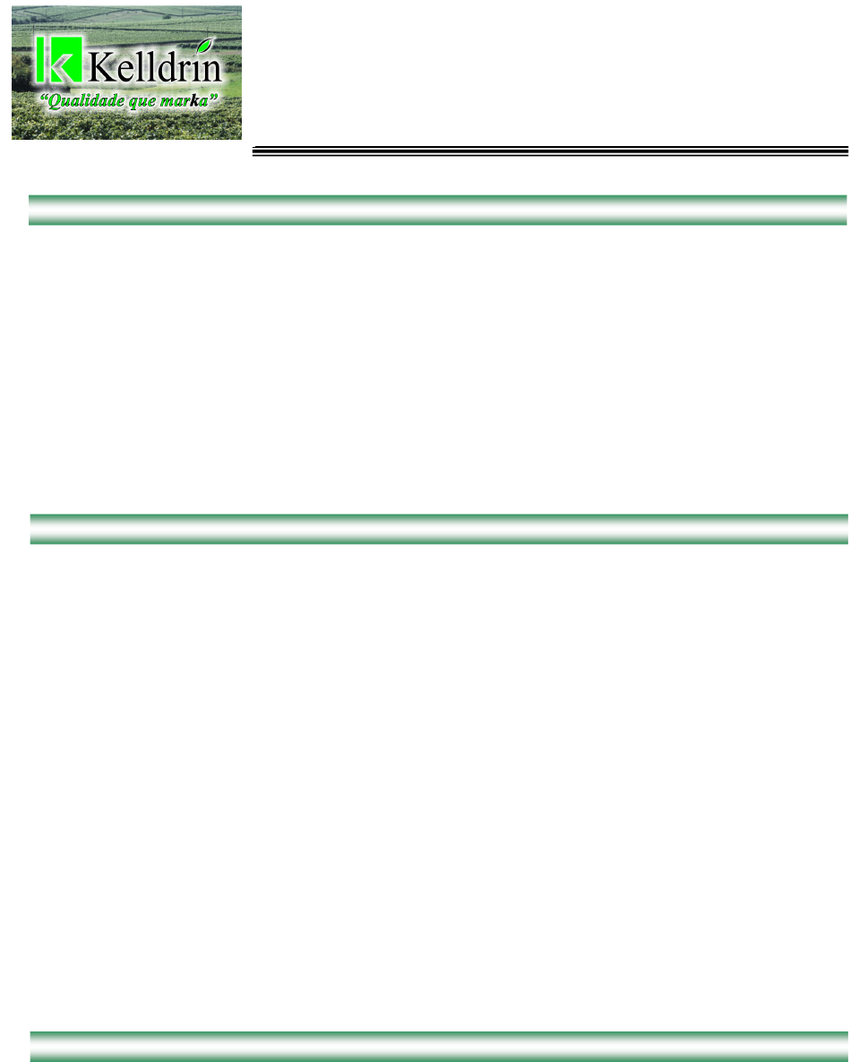 FICHA DE INFORMAÇÕES DE SEGURANÇA DE PRODUTO QUÍMICO – FISPQ Elaborada conforme NBR 14725/2001 POTTENTE 400 PM Página: 1 de 9 Data de Revisão: FISPQ n°: 002 Data de Elaboração: 09/2006 Kelldrin Ind. e Com. de Prods. Químicos Ltda N° da Revisão: 00 Rua VP1D Quadra 02 Lote 05 - Daia Anápolis-GO – Brasil � Nome do Produto: POTTENTE 400 PM � Nome da Empresa: Kelldrin Ind. e Com. de Produtos Químicos e Agrícolas Ltda � Endereço: Rua VP1D Quadra 02 Lote 05 - DAIA � Telefone: (062) 3241-2727 � FAX: (062) 3241-2727 � E-mail: kelldrin@kelldrin.com.br � Natureza Química: Este produto químico é um preparado � Ingredientes ou impurezas que contribuam para o perigo: � Nome químico ou genérico de cada ingrediente que contribua para o perigo: Nome Químico: (RS)- a -ciano-3-fenoxibenzil (1RS)-cis, trans- 3- (2,2 -diclorovinil) - 2-2-dimetil ciclopropanocarboxilato. Sinonímia: Cipermetrina Natureza química: inseticida do grupo dos piretróides Sintéticos Registro no Chemical Abstract Service - CAS: 52315-07-8 Peso molecular: 416,3 Fórmula Bruta: C22H19 Cl2NO3 � Concentração ou faixa de concentração de cada ingrediente que contribua para o perigo: 40 % (p/p) Perigos mais importantes: o produto pode ser tóxico ao homem e ao meio ambiente se não utilizado conforme as recomendações. � Efeitos do produto 1. IDENTIFICAÇÃO DO PRODUTO E DA EMPRESA 2. COMPOSIÇÃO E INFORMAÇÕES SOBRE OS INGREDIENTES 3. IDENTIFICAÇÃO DOS PERIGOS FICHA DE INFORMAÇÕES DE SEGURANÇA DE PRODUTO QUÍMICO – FISPQ Elaborada conforme NBR 14725/2001 POTTENTE 400 PM Página: 2 de 9 Data de Revisão: FISPQ n°: 002 Data de Elaboração: 09/2006 Kelldrin Ind. e Com. de Prods. Químicos Ltda N° da Revisão: 00 Rua VP1D Quadra 02 Lote 05 - Daia Anápolis-GO – Brasil � Efeitos adversos à saúde humana: o produto pode ser absorvido pelas vias respiratória, dérmica e oral. O contato com o produto pode provocar irritações na pele e nos olhos causando dermatites e queimaduras na pele além de sintomas sistêmicos. � Efeitos ambientais: a dispersão no ambiente pode contaminar a área contribuindo nos riscos acima. Evite entrada em cursos de água. O produto é altamente tóxico para microorganismos aquáticos. � Perigos específicos: não há outros perigos relacionados com o produto. � Principais sintomas: podem provocar sensações na pele além de parestesias em trabalhadores expostos, sintomas que normalmente desaparecem em 24 horas. Entre os sintomas cutâneos mais freqüentes, encontramos dormência, coceira, formigamento e queimação. Os sintomas em intoxicações podem incluir alergias respiratórias e cutâneas, além de sintomatologia neurológica nos casos graves com tremores e convulsões. � Classificação do produto químico: O produto é classificado toxicologicamente pelo Ministério da Saúde como classe IV. � Medias de primeiros-socorros � Medidas de Primeiros Socorros: Levar o acidentado para um local arejado. Retirar as roupas contaminadas. Lavar as partes do corpo atingidas com água em abundância e sabão. Se o acidentado estiver inconsciente e não respirar mais, praticar respiração artificial ou oxigenação. Encaminhar ao serviço médico mais próximo levando esta ficha. � Inalação: Se inalado em excesso remover a pessoa para local arejado e procurar o centro de saúde levando a embalagem ou o rótulo do produto. � Contato com a pele: Em caso de contato direto com este produto, lave a parte atingida com água fria corrente e sabão. � Contato com os olhos: Em caso de contato com os olhos, lavar imediatamente com água corrente em abundância. � Ingestão: Pode ser fatal se ingerido. Em caso de ingestão acidental não provoque o vômito e procure imediatamente o centro de intoxicações ou serviço de saúde mais próximo levando o rótulo ou a embalagem do produto. � Quais ações devem ser evitadas: Não dê nada por via oral a uma pessoa inconsciente. � Meios de extinção apropriados: Utilizar pó químico ou CO2 para pequenos incêndios e espuma mecânica ou spray de água para incêndios de grandes proporções. � Perigos específicos: Os gases liberados durante a combustão do produto. 4. MEDIDAS DE PRIMEIROS-SOCORROS 5. MEDIDAS DE COMBATE A INCÊNDIO FICHA DE INFORMAÇÕES DE SEGURANÇA DE PRODUTO QUÍMICO – FISPQ Elaborada conforme NBR 14725/2001 POTTENTE 400 PM Página: 3 de 9 Data de Revisão: FISPQ n°: 002 Data de Elaboração: 09/2006 Kelldrin Ind. e Com. de Prods. Químicos Ltda N° da Revisão: 00 Rua VP1D Quadra 02 Lote 05 - Daia Anápolis-GO – Brasil � Proteção dos bombeiros: Utilizar os equipamentos de segurança recomendados para o combate de incêndios, principalmente protetor respiratório. � Precauções pessoais � Precauções pessoais: utilizar macacão impermeável, óculos protetores, botas de borracha e luvas de borracha nitrílica ou PVC. A proteção respiratória deverá ser realizada dependendo das concentrações presentes no ambiente ou da extensão do derramamento/vazamento, para tanto, deverá se optar por máscaras semifaciais ou faciais inteiras com filtro substituível ou ainda, respiradores de adução de ar (ex: máscaras autônomas). � Remoção de fontes de ignição: Remover do local quaisquer fontes de ignição, principalmente se houver contato do produto com objetos metálicos. � Prevenção da inalação e do contato com a pele, mucosas e olhos: Utilizar os EPI´s adequados como luvas de borracha, óculos protetores, botas, roupa protetora e protetor respiratório. � Precauções ao meio ambiente: Evitar que o produto entre em contato com o solo, plantas, rios, nascentes, galerias de águas pluviais ou redes de esgoto. � Métodos para limpeza: Após o recolhimento do produto absorvido, neutralize com solução fraca de soda caustica e a seguir lave a área com água. � Manuseio � Medidas técnicas: utilizar EPI’s conforme descrito no Item 8.