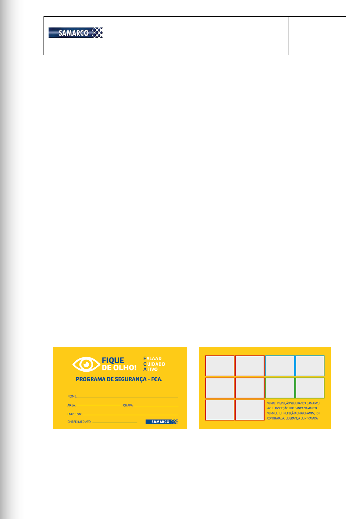 16.5 – PROGRAMA DE SEGURANÇA FCA REVISÃO: 03 DATA: 13/04/2019 PÁGINA: 1/4 VALIDADO: 08/2020 CÓPIA NÃO CONTROLADA 1. Objetivo Reduzir o número de incidentes: a - através da motivação de todos no cumprimento dos procedimentos durante toda a jornada de trabalho; b - mantendo os empregados em estado de alerta constante, aplicando de forma contínua o FALAAD e Cuidado Ativo; c - reconhecendo as boas práticas da equipe operacional; d - evidenciando e reconhecendo os líderes que se destacam junto as suas equipes no cumprimento dos procedimentos; f - motivando o orgulho em ser um empregado referência em Segurança do Trabalho. 2. Responsabilidade A responsabilidade de cumprir e fazer cumprir este procedimento é de todos os empregados da Samarco e de todos os fornecedores de serviços contratados. 3. Definição FLAAD: Metodologia de orientação aos empregados para observação efetiva dos fatores de riscos envolvidos na execução de uma tarefa, orientando que eles façam uma avaliação em todo o seu entorno, a fim de identificar riscos presentes (FALAAD – F: frente / A: atrás / L: lado ; / A: acima / A: abaixo / D: dentro). Cuidado Ativo: É o princípio básico da preservação e valorização da vida no ambiente de trabalho, ou seja: eu cuido de mim, cuido de você e permito que cuide de mim. 4. Documentos de Referência Manual do Sistema de Gestão de Saúde e Segurança do Trabalho. 5. Atividades 1) Cada empregado recebe um cartão de uso pessoal e intransferível, denominado “cartão fidelidade”. Este cartão servirá para identifica-lo e registrar as inspeções pelo qual o empregado passará com sua equipe. Frente Verso 16.5 – PROGRAMA DE SEGURANÇA FCA REVISÃO: 03 DATA: 13/04/2019 PÁGINA: 2/4 VALIDADO: 08/2020 CÓPIA NÃO CONTROLADA 2) A Equipe de Segurança do Trabalho da Samarco, Liderança Samarco, membros da CIPA/CIPAMIN, Técnicos de Segurança e Liderança de contratadas receberão adesivos que registrarão suas inspeções nos cartões dos empregados. Os adesivos são diferenciados da seguinte maneira: vermelho: membros da CIPA/CIPAMIN, Técnicos de Segurança e Liderança de contratadas. azul: Liderança Samarco. verde: Equipe da Segurança do Trabalho da Samarco. 3) A abordagem às equipes deve ser feita preferencialmente através das ferramentas de inspeção TCC – Treinamento, Capacitação e Conscientização e Inspeção de Campo, mas podem ser utilizadas outras ferramentas de inspeção, todas disponibilizadas no sistema Checklist Fácil. 4) Não há frequência definida para realização das abordagens às equipes através das ferramentas de Segurança do Trabalho. 5) O “cartão fidelidade” é individual do empregado, mas as abordagens são realizadas nas equipes nas frentes de trabalho, ou seja, o resultado da inspeção da equipe reflete de forma individual no “cartão fidelidade” do empregado. Se, durante a inspeção, todos os integrantes da equipe estão cumprindo os procedimentos aplicáveis a sua atividade, os “cartões fidelidade” recebem o adesivo conforme o item 2. 6) Se, durante a inspeção de campo, algum integrante da equipe abordada não estiver cumprindo algum procedimento aplicável a sua atividade, os “cartões fidelidades” serão preenchidos com adesivos na cor branca, anulando algum outro adesivo já recebido. 7) No “cartão fidelidade” existem os campos específicos para as inspeções de cada equipe. São seis campos para adesivos vermelhos (membros da CIPA/CIPAMIN, Técnicos de Segurança e Liderança de contratadas), dois para adesivos azuis (Liderança Samarco) e dois para adesivos verdes (Equipe de Segurança do Trabalho da Samarco). 8) As equipes de inspeção devem inserir seus adesivos nos locais indicados. Apenas a Equipe de Segurança do Trabalho pode inserir seus adesivos em qualquer lugar do “cartão fidelidade” quando não houver mais espaço para o adesivo de sua cor. 9) Se for encontrada alguma não conformidade, o adesivo branco deve ser inserido, preferencialmente, em cima do adesivo de sua respectiva cor, anulando uma inspeção positiva. 10) O empregado que conseguir preencher o “cartão fidelidade”, ou seja, alcançar dez avaliações positivas, deverá procurar a Segurança do Trabalho para cadastro, registro fotográfico e divulgação para o líder imediato. O empregado ainda receberá: - Reconhecimento da liderança direta no DDSS de sua área; - Terá o seu nome divulgado de forma positiva no informativo interno da empresa (reconhecimento do profissional em toda organização); - Almoço especial com a equipe. 16.5 – PROGRAMA DE SEGURANÇA FCA REVISÃO: 03 DATA: 13/04/2019 PÁGINA: 3/4 VALIDADO: 08/2020 CÓPIA NÃO CONTROLADA 11) Sempre que completar o cartão com os adesivos o empregado receberá outro para começar novamente. 12) A medida que for evoluindo no programa, ou seja, completando os cartões, o empregado vai sendo reconhecido de forma diferenciada, passando pelos diferentes níveis do programa conforme abaixo: Nível do Programa “Comportamento Seguro em Prática”: ao completar 3 cartões o empregado é reconhecido através dos adesivos específicos no crachá e capacete. PROGRAMA DE SEGURANÇA FCA “Comportamento Seguro em Prática” Nível do Programa “Comportamento Seguro dia a dia”: ao completar 5 cartões o empregado é reconhecido através dos adesivos específicos no crachá e capacete. PROGRAMA DE SEGURANÇA FCA “Comportamento Seguro dia a dia” Nível do Programa “Comportamento Seguro como Valor”: ao completar 7 cartões o empregado é reconhecido através dos adesivos específicos no crachá e capacete. PROGRAMA DE SEGURANÇA FCA “Comportamento Seguro como Valor” Nível do Programa “Comportamento Exemplar em Segurança”: ao completar 10 cartões o empregado é reconhecido através dos adesivos específicos no crachá e capacete. PROGRAMA DE SEGURANÇA FCA “Comportamento Exemplar em Segurança” 13) A cada mudança de n