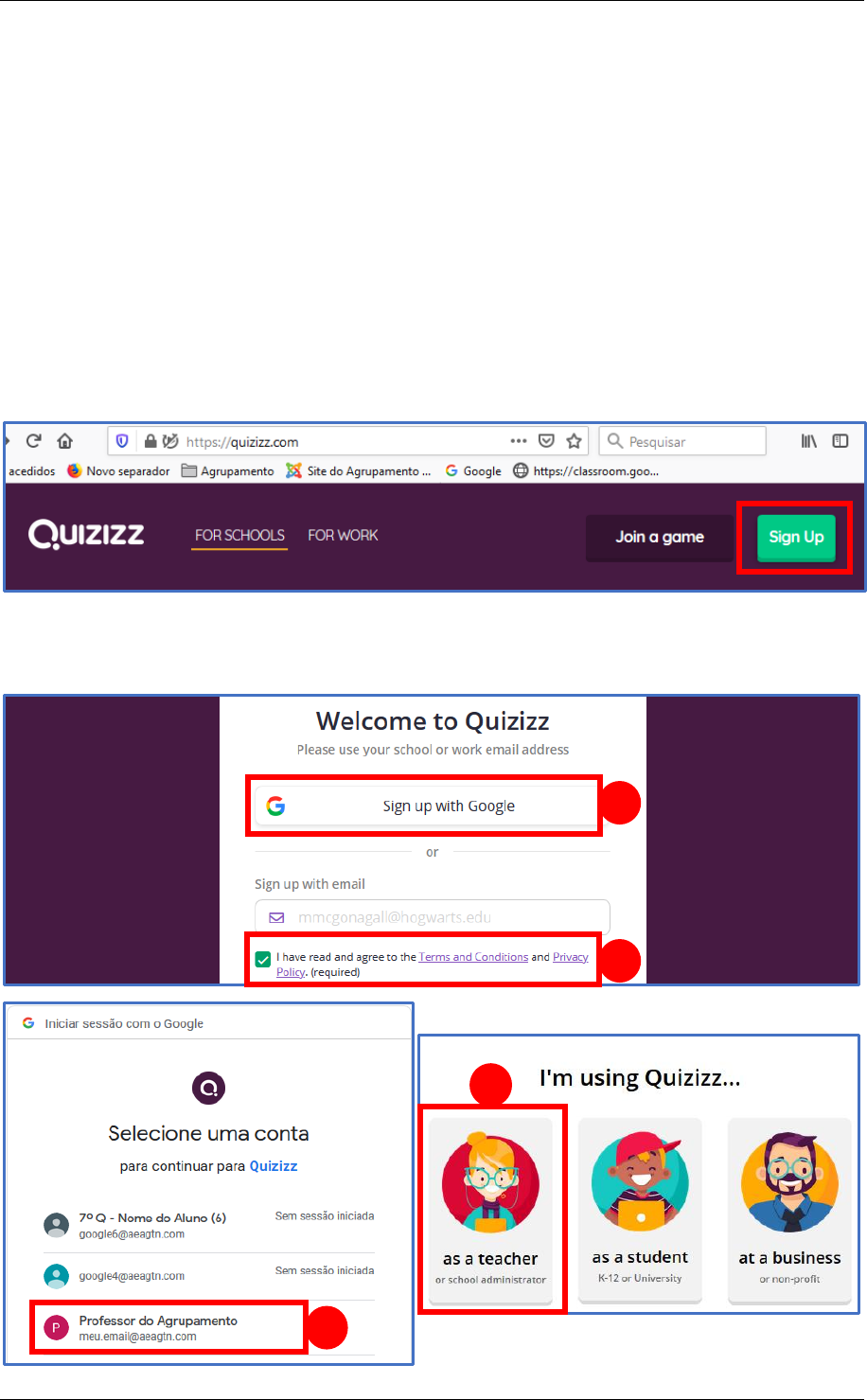 1 10º Tutorial - Criação de questionários com o QUIZIZZ Questionários aleatórios no QUIZIZZ A plataforma QUIZIZZ permite criar questionários, com questões aleatórias e opções de resposta aleatória, que podem ser configurados de forma a que os alunos só possam ver uma questão de cada vez e só possam passar à questão seguinte depois de submeterem a resposta atual, não podendo voltar atrás para alterar as respostas já submetidas. Desta forma, os alunos começam o questionário, todos ao mesmo tempo, quando o professor quiser (ideal para avaliar alunos em sessões síncronas por videoconferência), respondem a questões diferentes, no mesmo momento, têm de submeter a resposta para passar à seguinte, não são informados se acertam ou não na resposta e não podem alterar respostas submetidas. ➔ Para se registar com a conta GSuite siga os passos: 1º - Entrar na plataforma Quizizz e clicar em “Sign Up”. 2º - Clicar em “Sign Up with Google” (1), marcar a opção (2), escolher a sua conta GSuite (3) para entrar e a opção “as a teacher” (4). 1 2 3 4 2 ➔ Para se criar quizzes siga os passos: 1º - Clicar em “My quizzes” (1), em “Create a quiz” (2) dar um nome ao quiz e selecionar o assunto. 2º - Escolher o tipo de questão (1) no Quiz Editor ou clicar em “Teleport” para copiar uma questão de outro quiz (2). 3º - Editar a questão (1) e as opções de resposta (2) (ex.: “Multiple Choice”). Selecionar a resposta correta (3), o tempo máximo de resposta (pode ser diferente para cada questão) (4) e guardar (5). Do lado direito aparece um simulador do “telemóvel do aluno” (6). 1 2 1 2 1 2 3 4 5 6 3 4º - Criar uma nova questão (1) / editar ou copiar a questão (2). 5º - Clicar em “Done” (1) quando terminar o questionário. Na nova janela, configurar os detalhes, selecionar a opção “Private, visible to you” (2) e salvar (3). ➔ Para configurar as opções do quiz e preparar o início do mesmo siga os passos: 1º - Clicar em “Play Live” (1) e escolher a opção “Test” (2) na nova janela. 1 1 2 1 2 3 1 2 4 O modo “test” é a melhor opção para criar um quiz para avaliar os alunos. As opções pré-definidas são: 2º - Clicar em “Continue” (1) para gerar o link (2) e o código (3) para os alunos entrarem no quiz. Fornecer o link e o código aos alunos. 3º - Clicar em “Start” (1) quando os alunos estiverem todos (2) no quiz, preparados para começar. - Os alunos só podem fazer o teste uma vez. (1) - As respostas corretas não ficam visíveis após cada pergunta (2). - Não é permitido aos alunos a análise das perguntas e resposta depois do jogo (3). - As questões têm um tempo limite para serem respondidas (4). - As questões aparecem aleatoriamente (5). - As opções de resposta aparecem aleatoriamente (6). 1 2 3 4 5 6 1 3 2 1 2 5 Depois de entrarem no link e colocarem o código, os alunos terão de se autenticar com a conta GSuite, clicar em começar o quiz e aguardar que o professor clique em START. O professor pode acompanhar o desempenho dos alunos e no final verificar as questões que os alunos responderam. A plataforma guarda as respostas dos alunos e estas podem ser consultadas posteriormente em “Reports” no menu lateral. ➔ Para consultar as respostas dos alunos siga os passos: 1º - Clicar em “Reports” (1) e no questionário (2), 2º - Pode escolher outra opção de visualização (1). Clicar em “Download” (2) para descarregar os resultados dos alunos. 1 2 1 2 6 O Excel (1) com os resultados permite identificar as respostas dos alunos. Este quiz contabiliza apenas a percentagem de respostas corretas (2), não atribuindo cotações diferenciadas às questões. Se a resposta for aberta é sempre contabilizada como correta, se o aluno colocar qualquer coisa na resposta. Isso obriga a que se revejam as classificações, caso se pretenda dar cotações diferentes a cada questão ou se existirem questões abertas. A classificação pode ser colocada manualmente, pelo professor, num trabalho do Classroom, criado para o efeito. 1 2