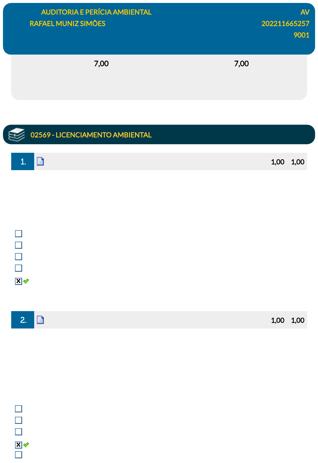 Disciplina: AUDITORIA E PERÍCIA AMBIENTAL AV Aluno: RAFAEL MUNIZ SIMÕES 202211665257 Turma: 9001 DGT0399_AV_202211665257 (AG) 17/01/2024 17:26:00 (F) Avaliação: 7,00 pts Nota SIA: 7,00 pts Estação de trabalho liberada pelo CPF 14305896710 com o token 734320 em 17/01/2024 17:01:21. 02569 - LICENCIAMENTO AMBIENTAL 1. Ref.: 6055391 Pontos: 1,00 / 1,00 (Metro Capital Soluções - Prefeitura de Nova Odessa-SP / 2019) O EIA e o RIMA são documentos importantes exigidos na fase de licenciamento de empreendimentos ou atividades que possam causar signi�cativa degradação ambiental. Marque a alternativa correta, que evidencia a fase do licenciamento ambiental, onde o EIA e RIMA devem ser exigidos. Licença de Plano de Controle Ambiental Licença Temporária Licença de Controle Ambiental Licença Permanente Licença Prévia 2. Ref.: 6055759 Pontos: 1,00 / 1,00 Complete o texto abaixo: ____________________________ é um processo administrativo que se tornou obrigatório em todo o território nacional. Tem como �nalidade promover o controle prévio à construção, instalação, ampliação e funcionamento de estabelecimentos e atividades utilizadoras de recursos ambientais, consideradas efetivamente poluidoras e causadoras de impactos ambientais. Licença ambiental. EIA. RIMA. Licenciamento ambiental. AIA. 21/05/24, 14:51 EPS https://simulado.estacio.br/alunos/ 1/5 javascript:alert('C%C3%B3digo da quest%C3%A3o: 6055391.'); javascript:alert('C%C3%B3digo da quest%C3%A3o: 6055391.'); javascript:alert('C%C3%B3digo da quest%C3%A3o: 6055759.'); javascript:alert('C%C3%B3digo da quest%C3%A3o: 6055759.'); 3. Ref.: 6055762 Pontos: 1,00 / 1,00 Cada uma das licenças ambientais a serem solicitadas pelas atividades potencialmente causadoras de impactos apresenta um prazo de validade. O prazo de validade referente à licença de operação (LO) é de ____________, devendo sua renovação ser requerida com antecedência mínima de _________ dias antes de expirar seu prazo de validade. no mínimo, 4 anos e, no máximo, 10 anos, 200 dias. no mínimo, 5 anos e, no máximo, 8 anos; 120 dias. no mínimo, 5 anos e, no máximo, 8 anos; 200 dias no mínimo, 4 anos e, no máximo, 10 anos, 120 dias. no mínimo, 6 anos e, no máximo, 10 anos, 120 dias. 4898 - INTRODUÇÃO À GESTÃO, PERÍCIA E AUDITORIA AMBIENTAL 4. Ref.: 7705142 Pontos: 1,00 / 1,00 As empresas necessitam ajustar suas atividades de acordo com os diversos subsistemas, tais como qualidade, segurança, saúde ocupacional, meio ambiente, responsabilidade social, entre outros. Desta forma, quais os objetivos de um Sistema de Gestão Integrada - SGI numa organização? O SGI tem como objetivo fundamental eliminar as multas de uma empresa. Um SGI tem como objetivo fundamental, aumentar o lucro de uma empresa. O SGI é uma política implementada pela empresa para garantir o cumprimento das cotas de pessoas com de�ciência. Um SGI tem como objetivo garantir as normas punitivas de uma empresa. O SGI tem como objetivo integrar todos os sistemas de gestão de uma organização. 5. Ref.: 7703874 Pontos: 1,00 / 1,00 Diversos são os benefícios para uma organização quanto a implementação de um Sistema de Gestão Ambiental ¿ SGA. Marque abaixo a alternativa que melhor representa um destes benefícios: Com o SGA a empresa garantirá que todos os colaboradores cumprirão os requisitos legais. 21/05/24, 14:51 EPS https://simulado.estacio.br/alunos/ 2/5 javascript:alert('C%C3%B3digo da quest%C3%A3o: 6055762.'); javascript:alert('C%C3%B3digo da quest%C3%A3o: 6055762.'); javascript:alert('C%C3%B3digo da quest%C3%A3o: 7705142.'); javascript:alert('C%C3%B3digo da quest%C3%A3o: 7705142.'); javascript:alert('C%C3%B3digo da quest%C3%A3o: 7703874.'); javascript:alert('C%C3%B3digo da quest%C3%A3o: 7703874.'); A garantia de que a empresa jamais será autuada pelos órgãos governamentais. A certeza que ao implementar um SGA a empresa receberá sua certi�cação ambiental - ISO 14.001. Com o SGA a empresa poderá identi�car seus aspectos e impactos e melhorar sua relação com o meio ambiente. O SGA é um documento sigiloso, logo, não devendo ser divulgado para que possa gerar os benefícios esperados. 4899 - AUDITORIA AMBIENTAL 6. Ref.: 7799121 Pontos: 0,00 / 1,00 Os Sistemas de Gestão Ambiental tornaram-se um grande aliado das organizações que buscam manter seus processos, aspectos e impactos ambientais sob controle. Priorizando primariamente os impactos ambientais mais signi�cativos para em seguida de�nirem a melhor forma de controlar e minimizar tais impactos. Sobre o SGA marque a opção correta: Um SGA é um método de gerenciamento que pode ser aplicado por uma empresa, como um conjunto de procedimentos sistematizados que são desenvolvidos para que as questões ambientais sejam desvinculadas à administração global do empreendimento. Para a implantação de um SGA não se faz necessário o diagnóstico inicial dos procedimentos utilizados pelo empreendimento, no que se refere às questões ambientais, pois não são relevantes ao SGA A implantação de um SGA é baseada no Ciclo PDCA ( Plan, Do, Check and Act ), procedimento aplicado para o planejamento, implantação, veri�cação e revisão das estratégias para a obtenção de uma melhoria do desempenho ambiental da organização. Como elemento de um SGA, com base na Norma ISO 14.001, temos a Política Ambiental, de�nida pela alta administração da empresa, que deverá apresentar seus princípios de ação, não devendo estar disponível aos funcionários ou clientes do empreendimento As normas da Série ISO ( International Organization for Standardization ) 14.000 são as únicas que abordam técnicas de implantação dos Sistemas de Gestão Ambiental 7. Ref.: 7799455 Pontos: 0,00 / 1,00 Existem ações aplicadas ao quesito Não-conformidade, ação corretiva e ação preventiva de um Sistema de Gestão Ambiental estruturado na NBR ISO 14001:2004. 21/05/24, 14:51 EPS https://simulado.est
